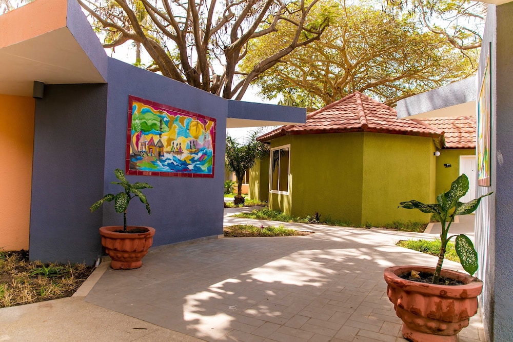 Located right on the Atlantic Ocean, although there is not a swimmable beach. On-site restaurant and coffee shop. Unique architecture, with several pods of individual rooms in each pod. Decor reflective of African culture.