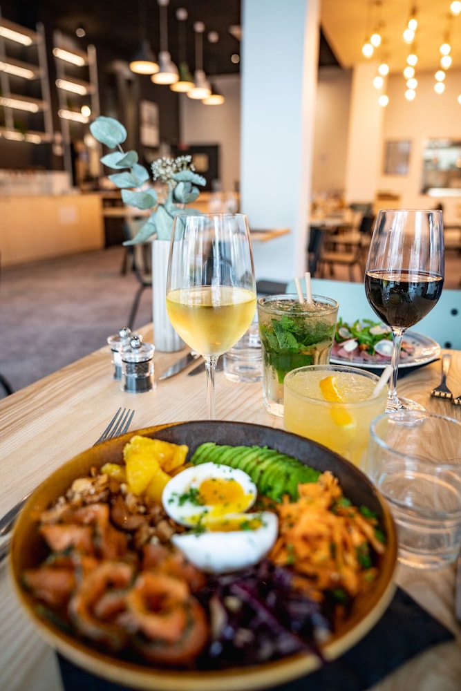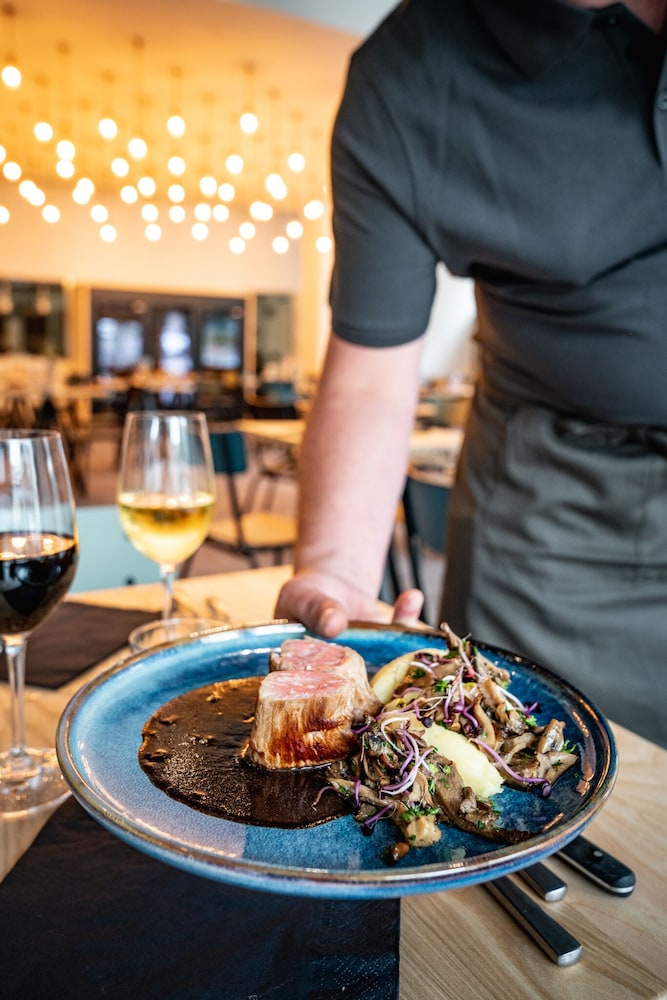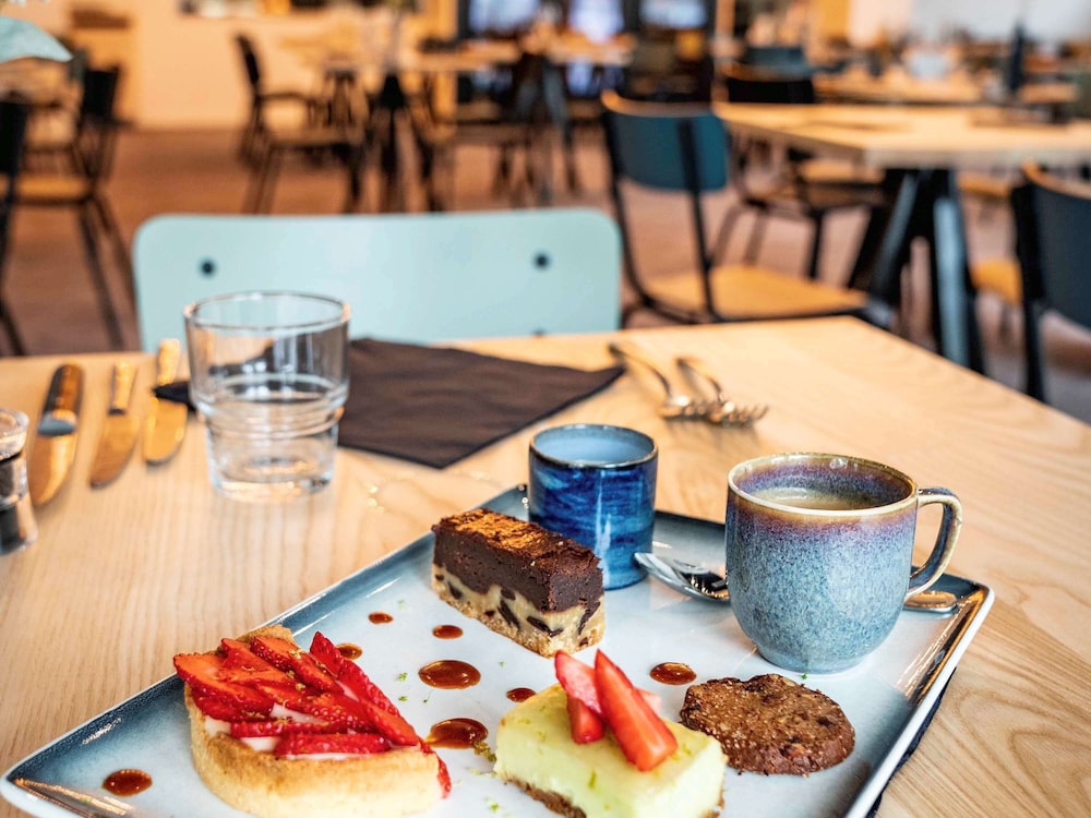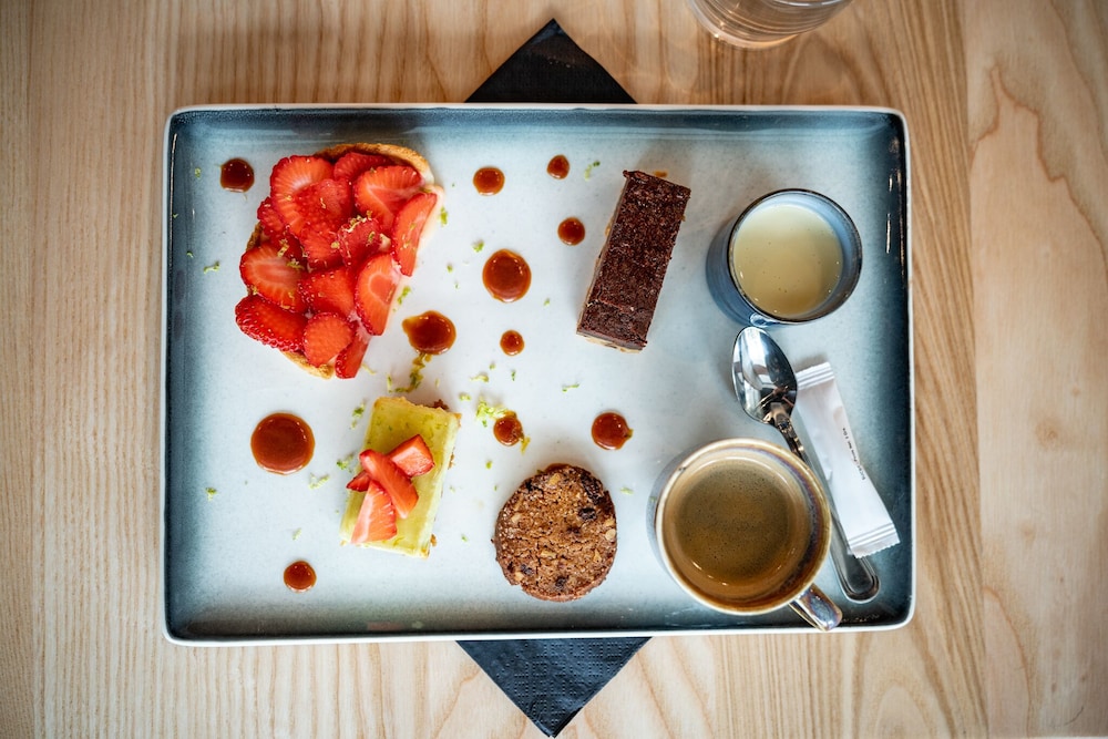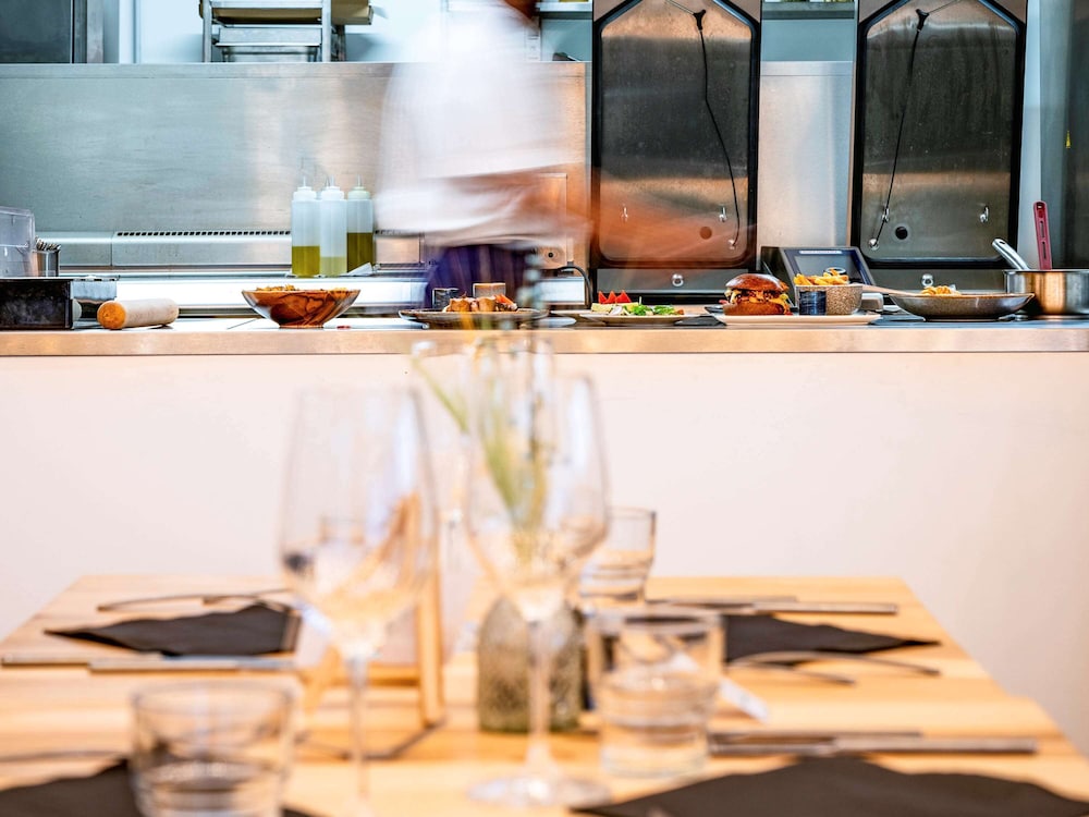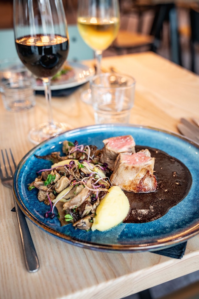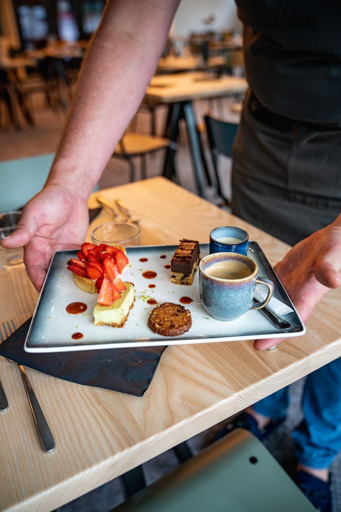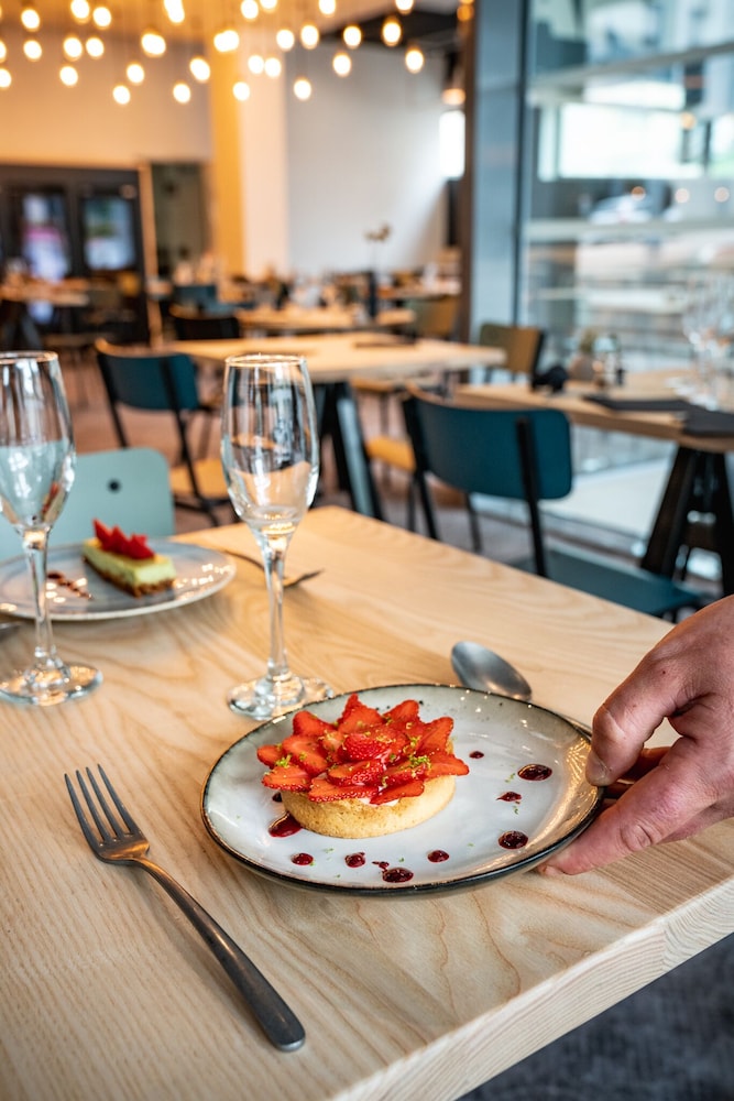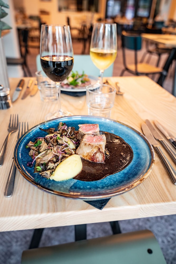 Good location. Food was nice. Breakfast was also good but the self service area was too small. This resulted in a lot of congestion. The coffee and drinks machines should have been in a different location. Not enough staff o breakfast- one person topping up the breakfast items, clearing up and registering guests for breakfast. Garage for parking was accessed through a hotel door. It wasn’t clear how to get access when it was closed. Rooms were quiet, simple and functional.