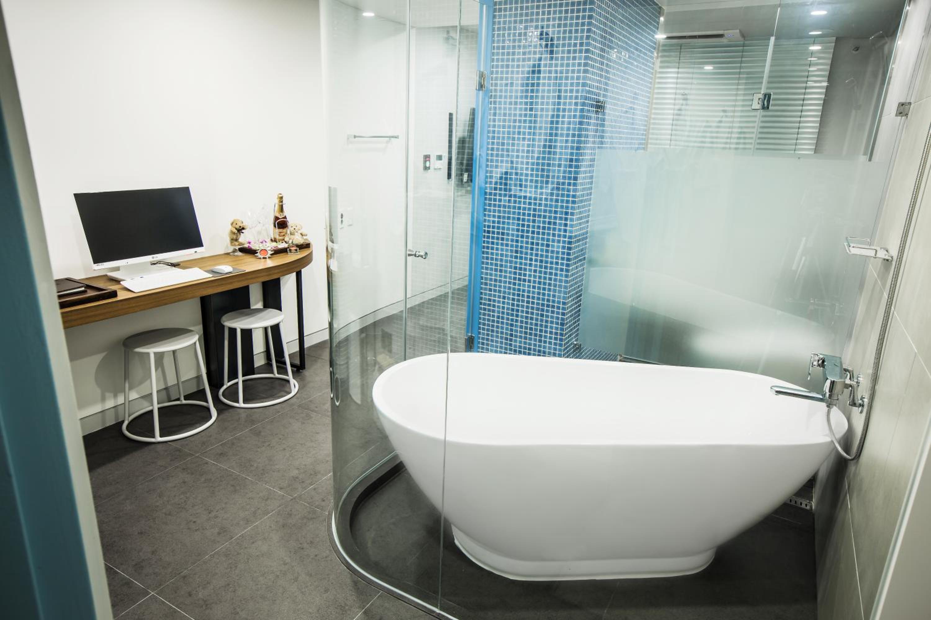 샤워부스내부 청결상태가 매우 불량하고, 객실 바닥과 슬리퍼의 위생 상태가 매우 불량합니다. 샤워부스의 문이 반대로 열리고 닫혀서 샤워를 하면 물이 객실 바닥으로 넘치게 되고 샤워부스가 완전히 밀폐되지 않아 샤워를 하면 수증기가 객실 전체로 퍼지는데 환기시설은 없어서 창문을 열고 환기를 해야합니다. 세면대 역시 밖에 노출되어있어 사용이 매우 불편합니다.
