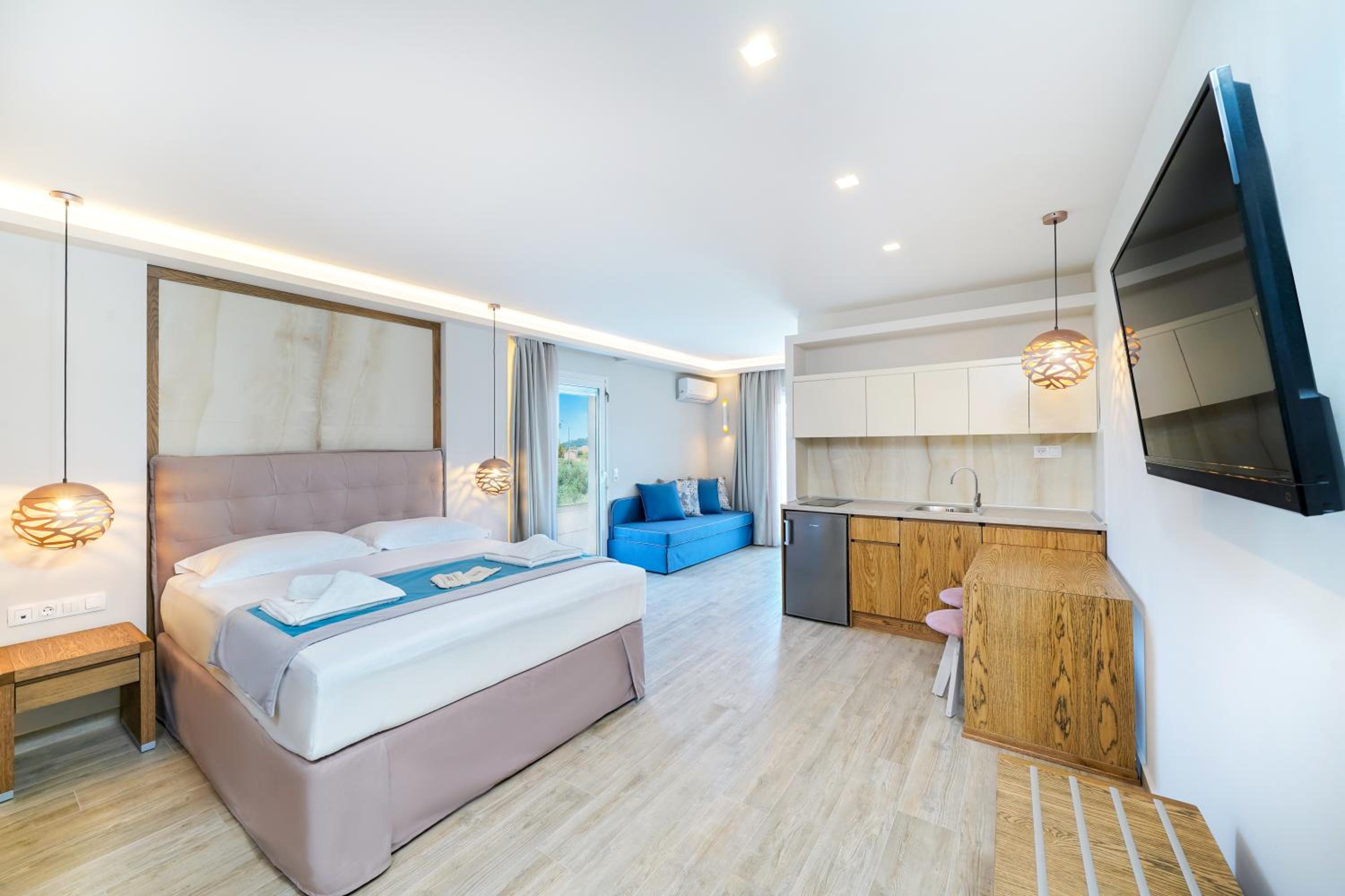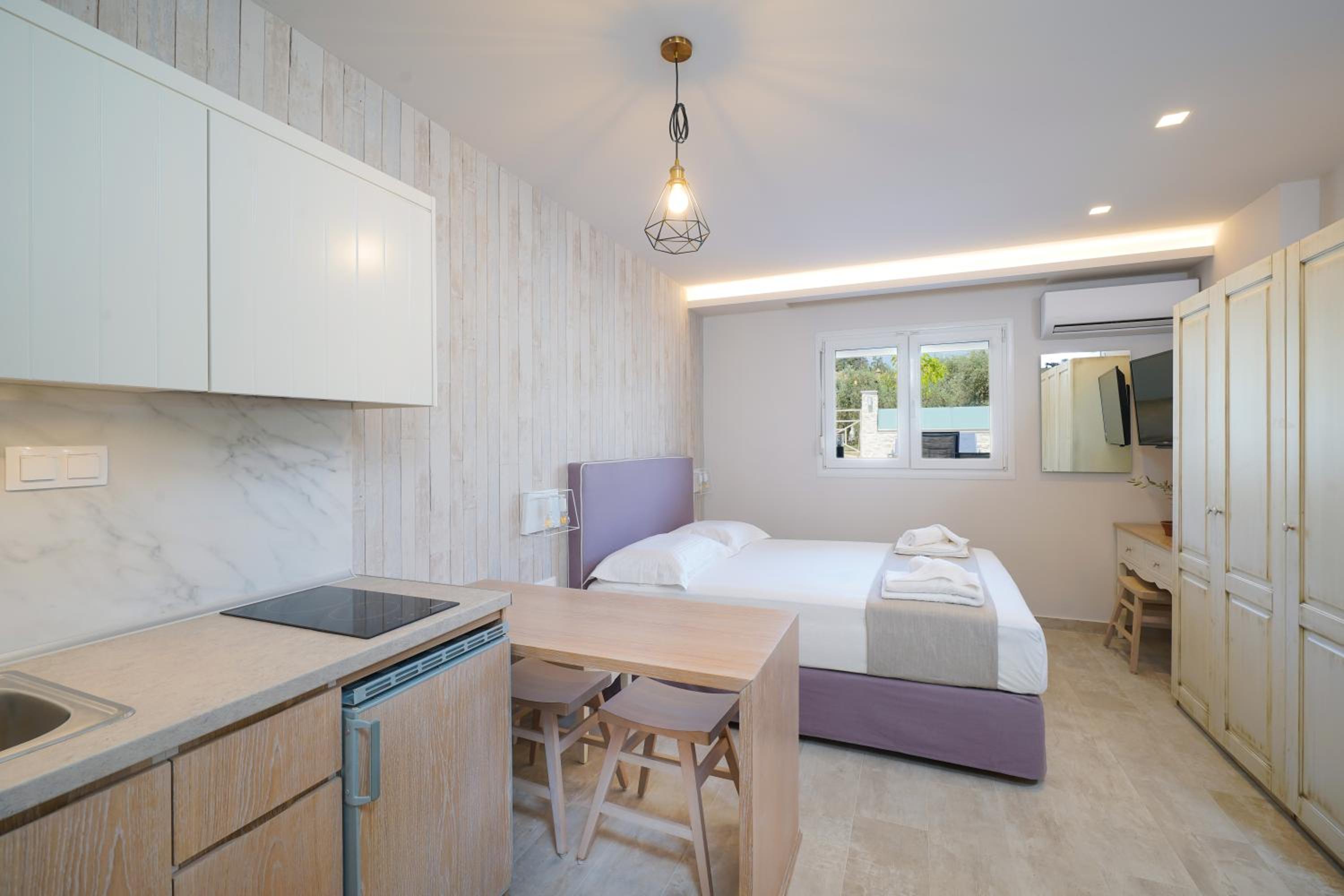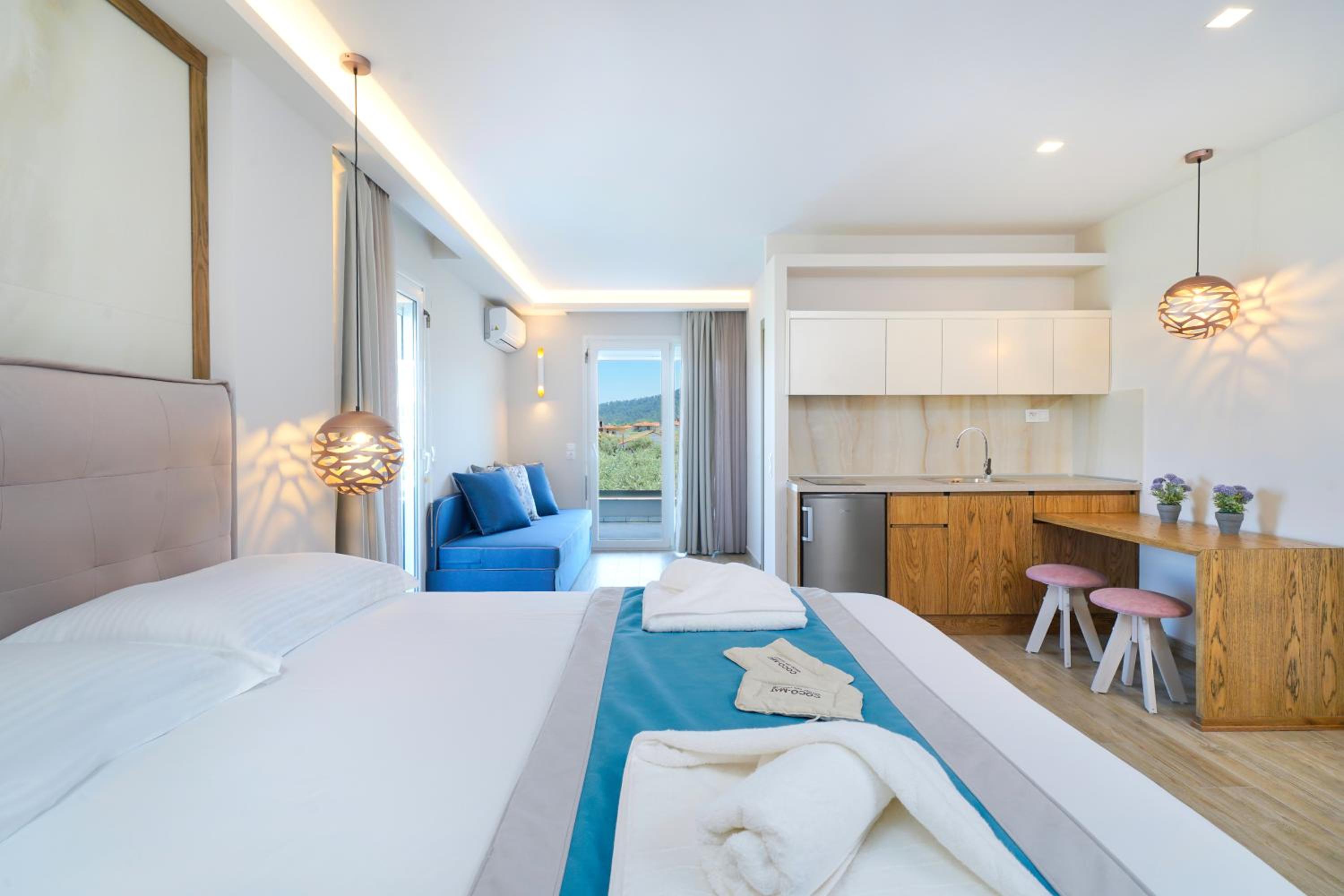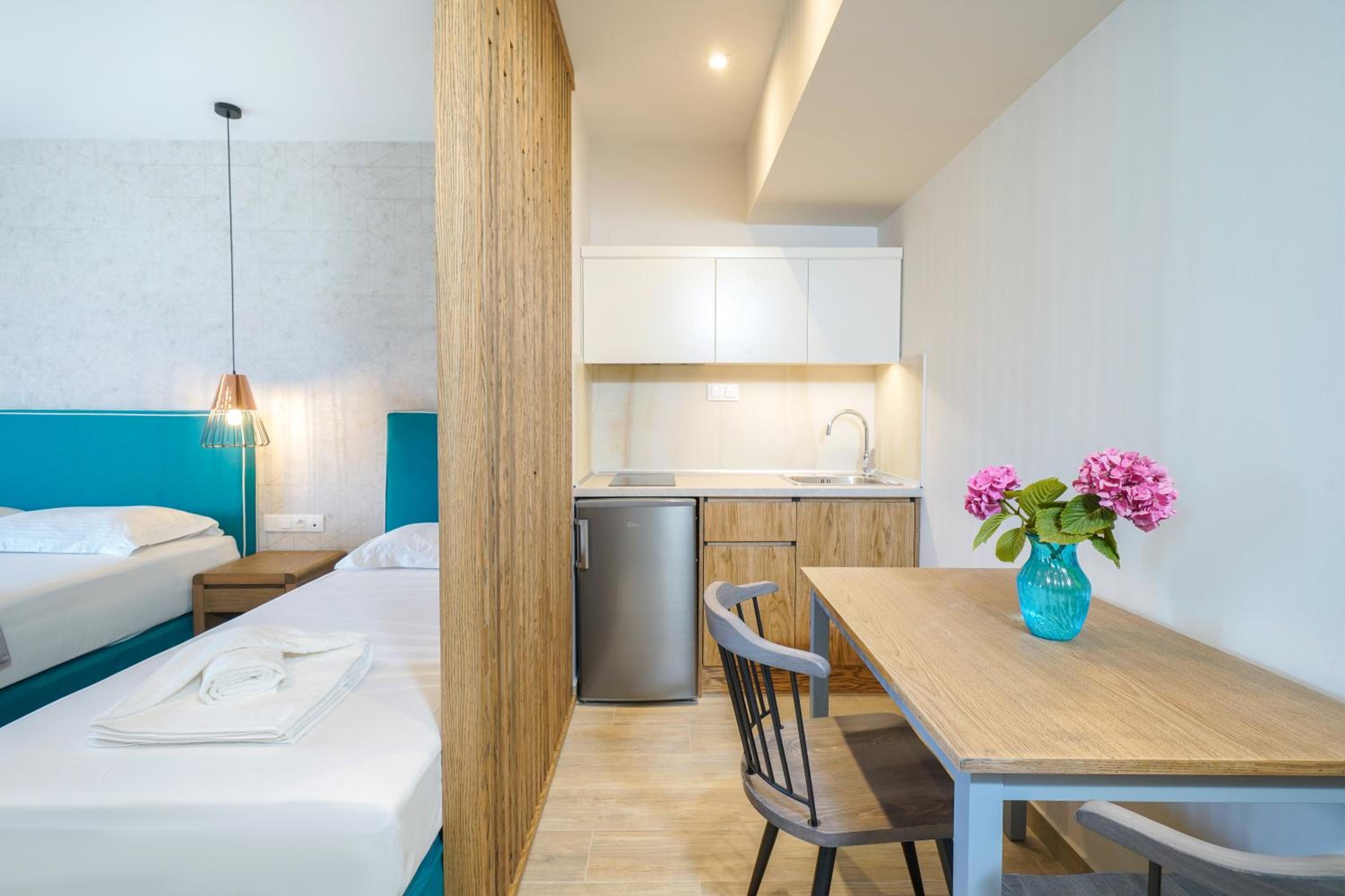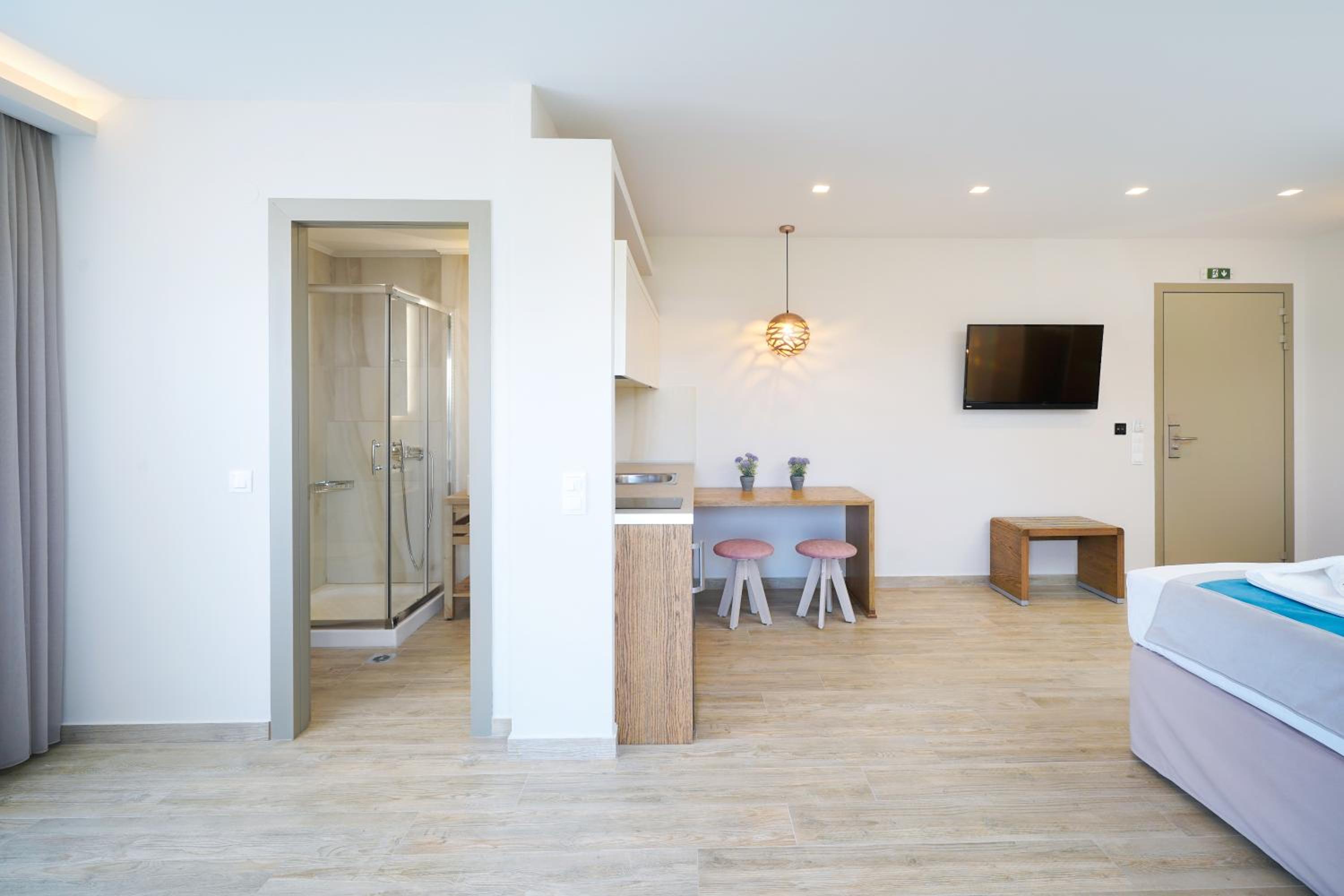 Odamız çok güzeldi geniş ve ferahtı. Temizlik çok iyiydi . Balkonu çok büyük ve ferahtı. Odalar konforlu çarşaf ve havlular her gün temizi ile değişti. Mutfak malzemeleri yeterli ayrıca filtre kahve makinesi mevcuttu. Çok rahat ettik. Sessiz bir bölgede kafanızı geceleri dinleyebileceğiniz zeytin ağaçları içimde . Resepsiyoda Vasili çok yardım severdi hatta çıkarken küçük ama kıymetli hediyeler verdi :) Güler yüzlü ve samimi yaklaşımlarından dolayı kendisine ayrıca teşekkür ederim. Her konuda size destek olacaktır. Tesis denizin dibinde yolun karşısına geçerek denize girebilirsiniz. Otoparkı oldukça geniş .Marketler yakınınızda. Sorunsuz bir tatildi. Huzur arayan herkes çok rahat edecektir. Tekrar kalır mıyım kesinlikle tercihlerim arasında olur.