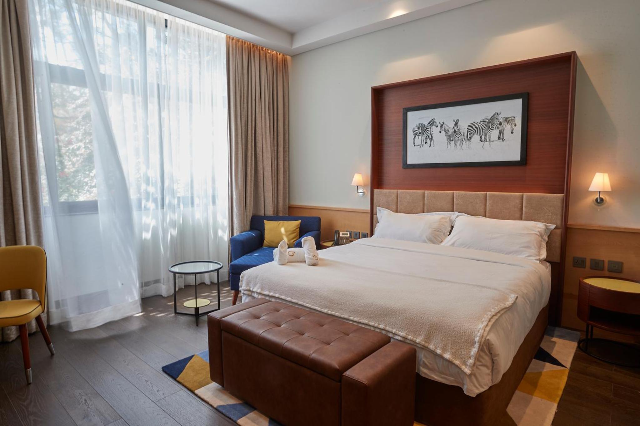 The Quorum, a 5-star hotel in Lusaka, offers air-conditioned rooms with modern amenities like a coffee machine, minibar, and flat-screen TV. Some rooms even feature a balcony for a spectacular view.