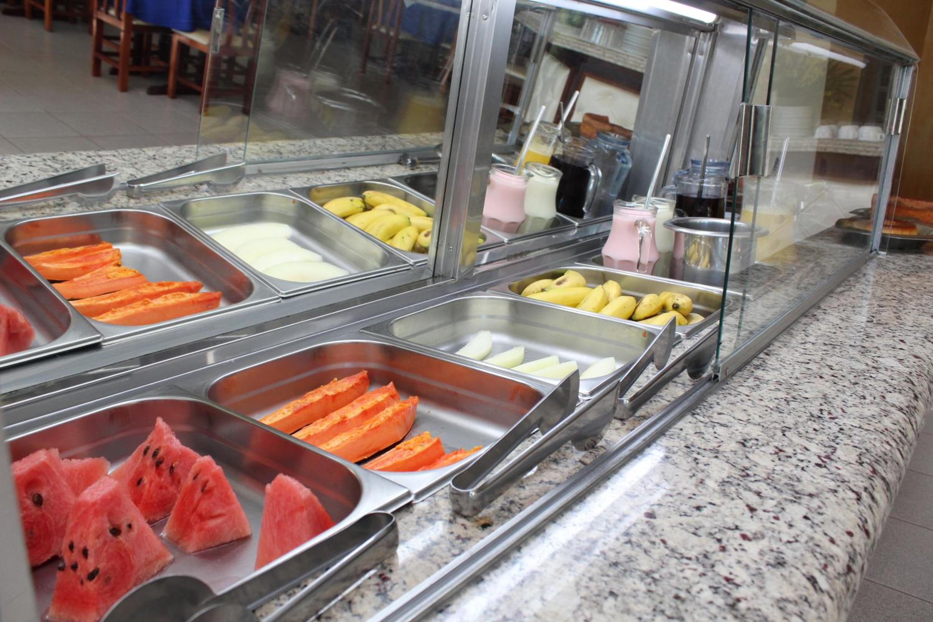 Café da manhã é fraco em sucos e frutas. E exagerado em bolos e pães doces.