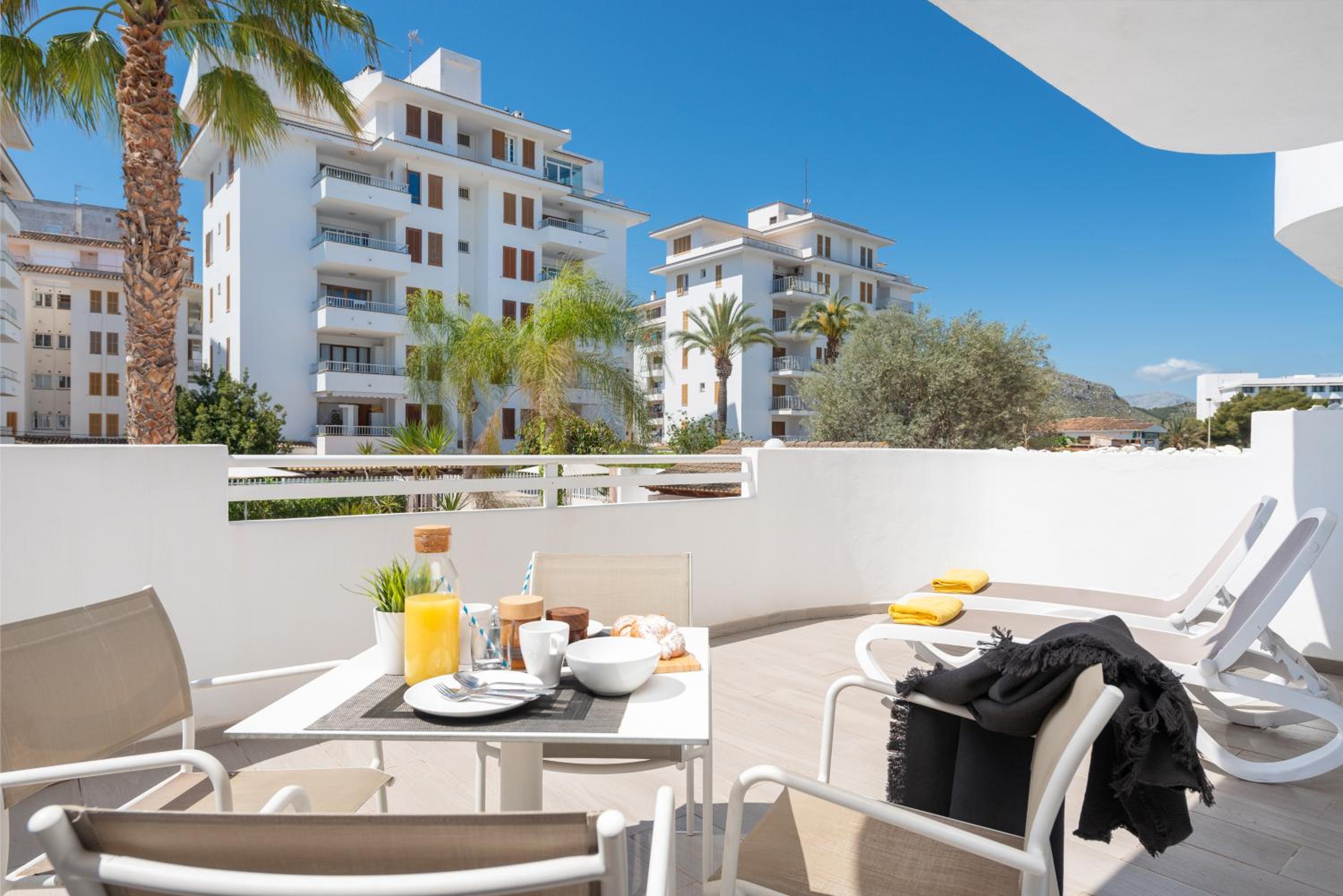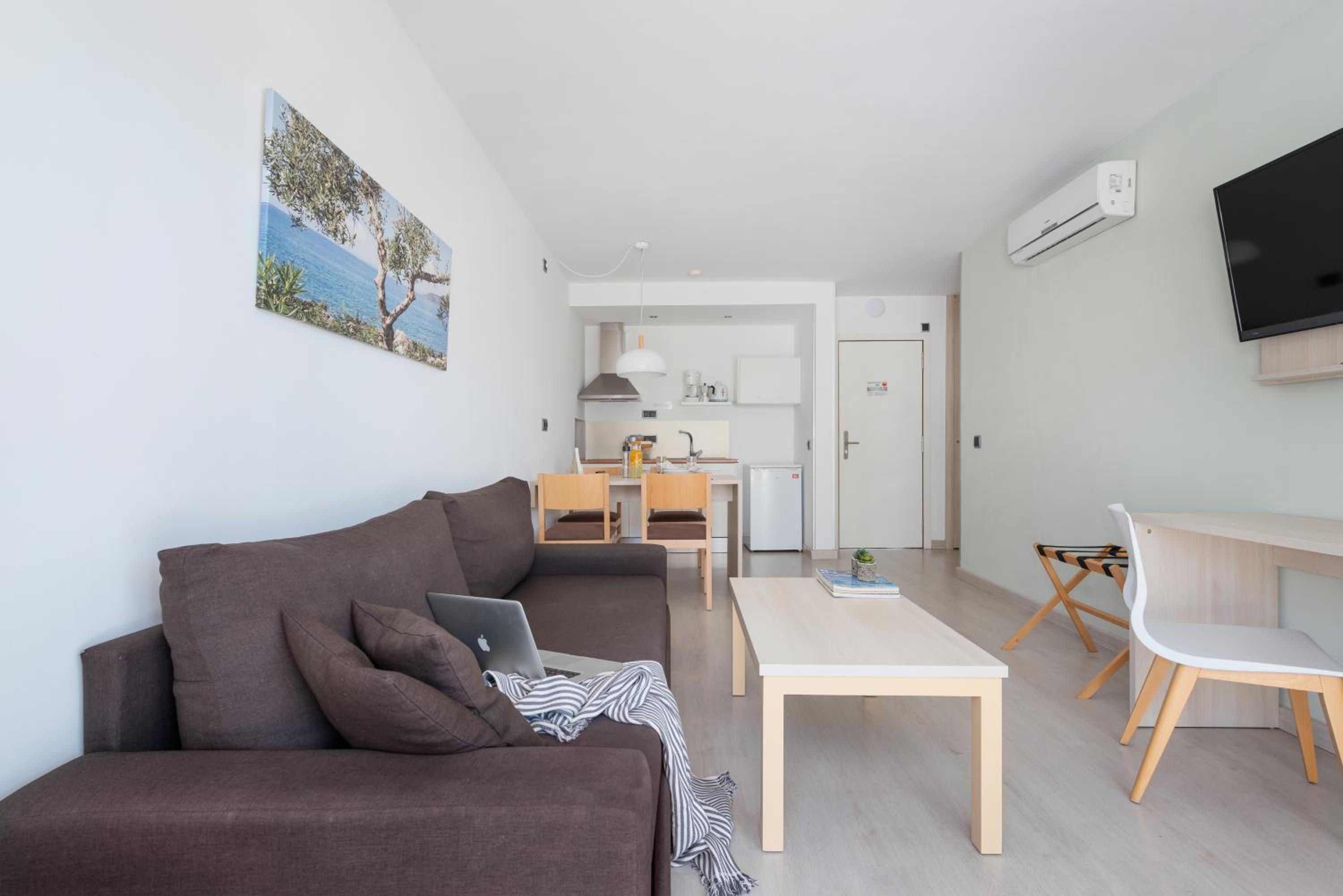 Bra läge - åt ena hållet nära bra restauranger, mataffären Lidl, bussen och åt det andra hållet nära den vackra stranden. Lugnt och säkert område. Vi hade den stora balkongen, mycket härligt med två solbäddar samt litet bord. Lagom kök. Ren och fräsch utsida. AC och bra med gardiner. Erbjöds både barnsäng och barnstol, tack!