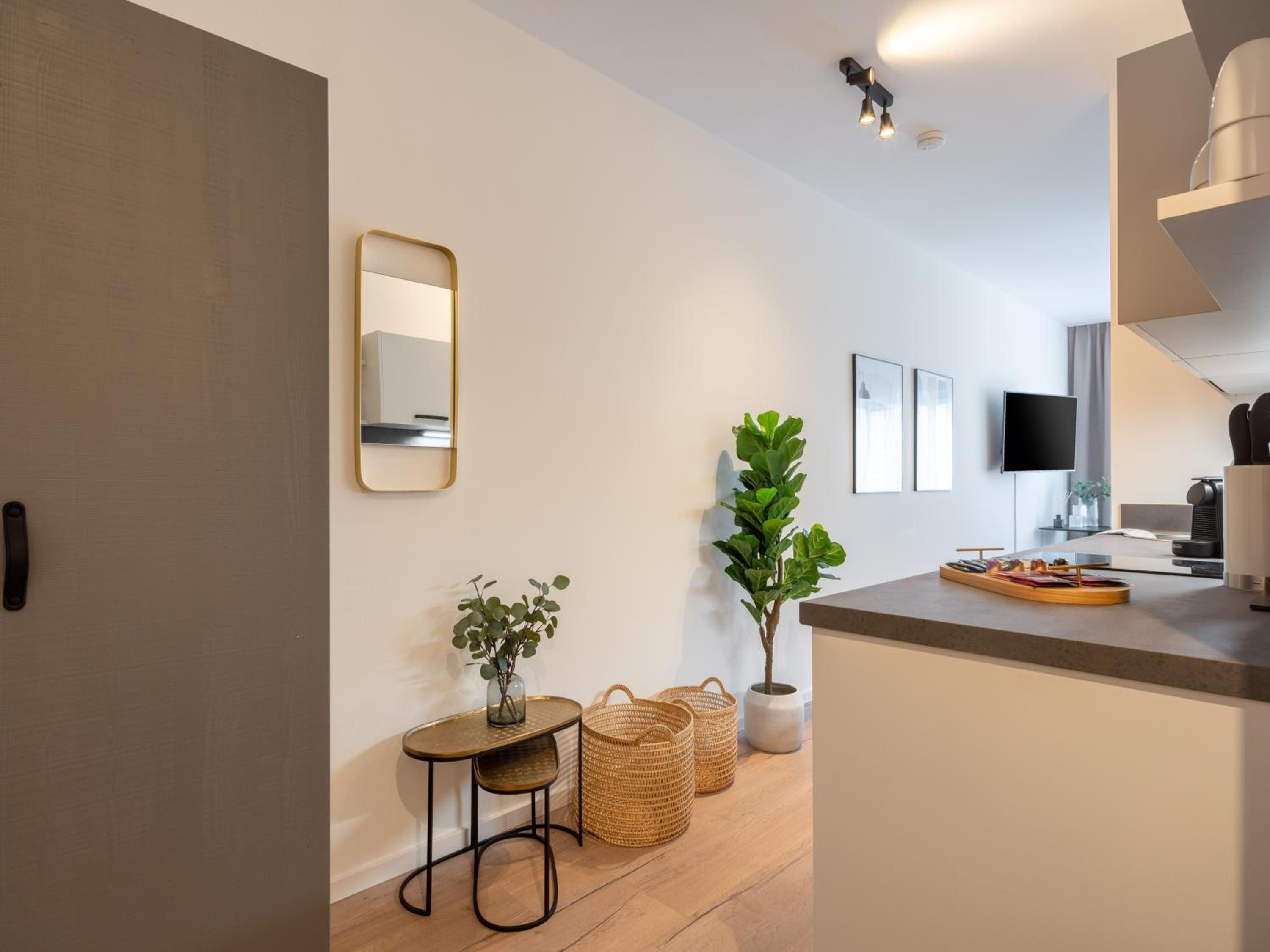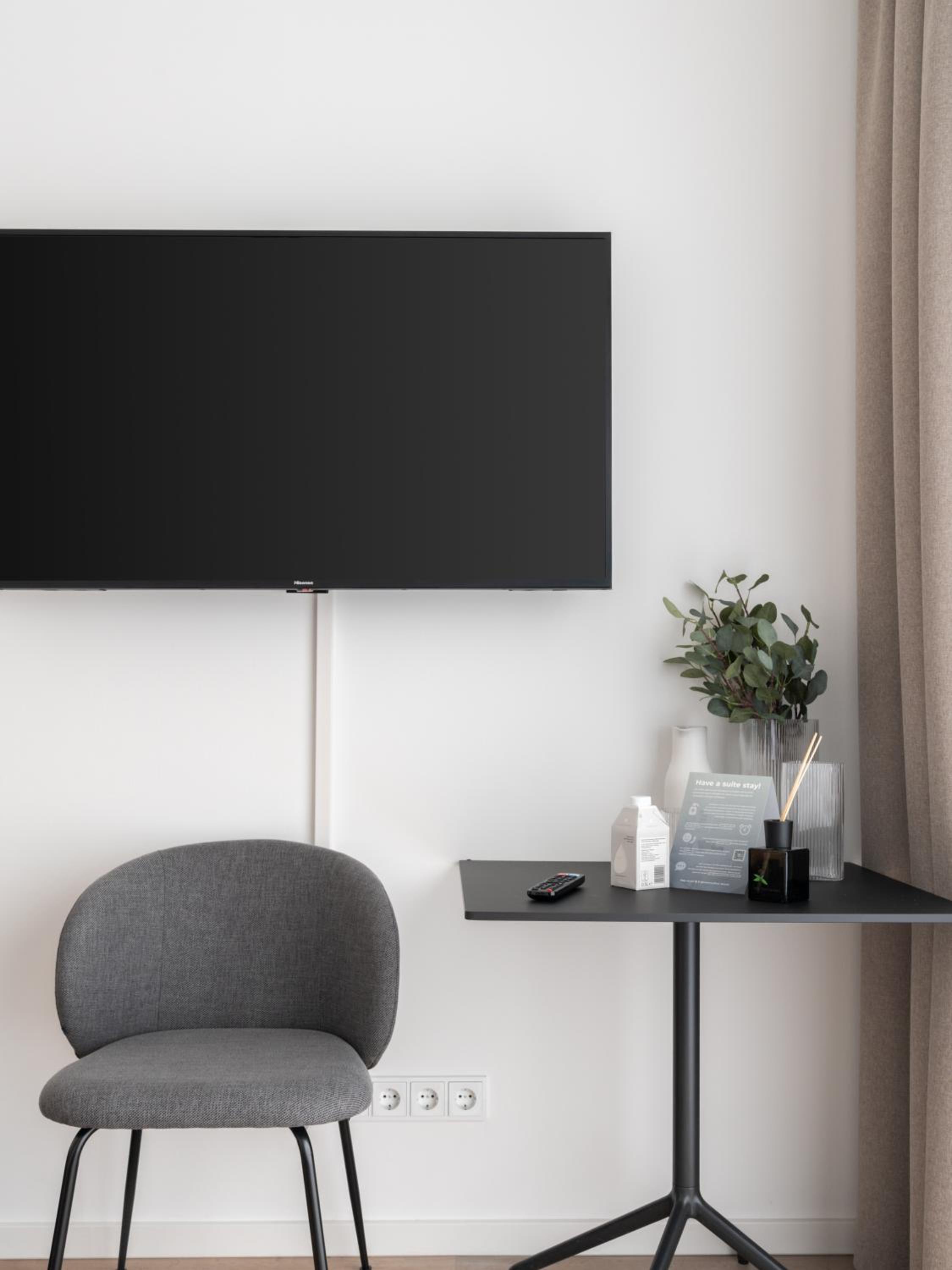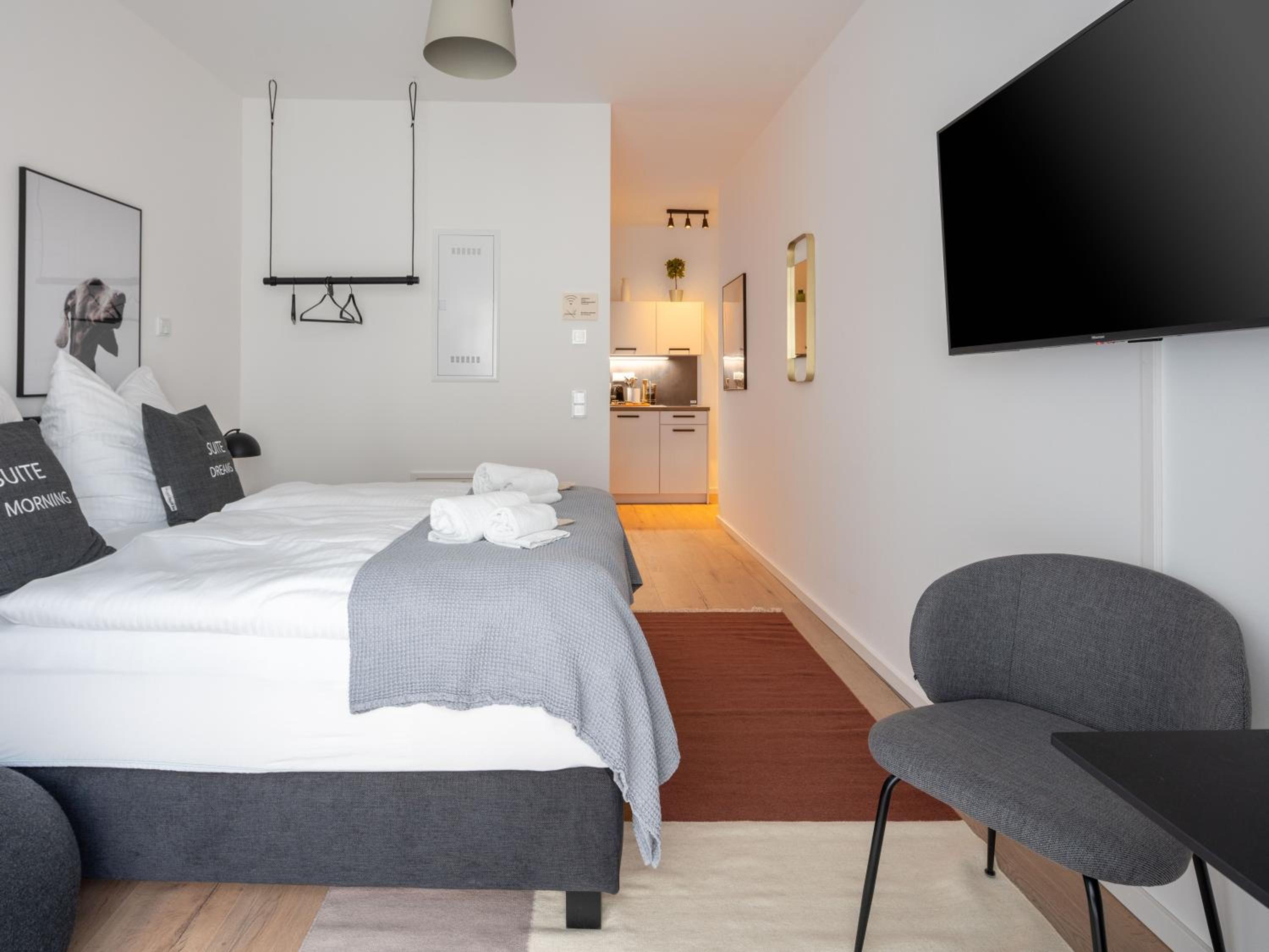 Well-Equipped Units: Each unit is furnished with a desk, flat-screen TV, and a fully equipped kitchenette featuring a toaster, fridge, stovetop, and coffee machine.
