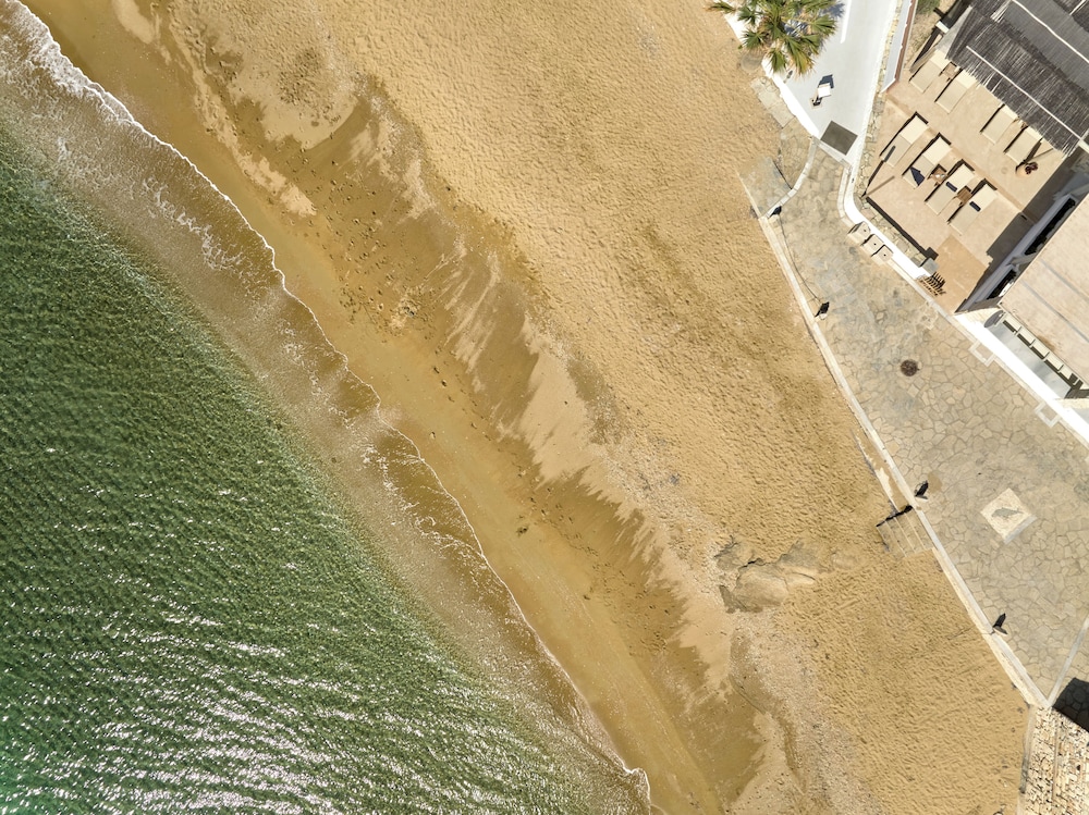 This property is beach front.they have a private sitting area with loungers on property, or you can move down to the beach. There are two other beaches on either side which are worth the very short walk to spend time on. Private parking was great as we have a car. Exploring the island from here was so convenient. This property corners the main road, it can get loud and the bus stop is right at the property, also very convenient. The room was just as the pictures showed and the bed was so cozy! Our room smelled like an old smoking room but aired out ok. Overall we had a great stay!