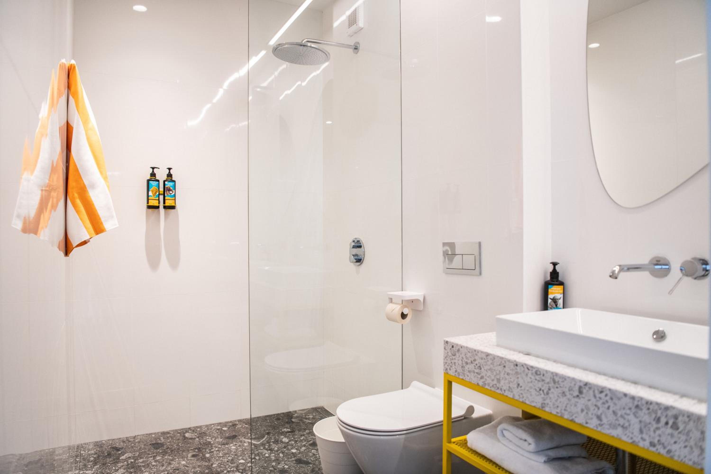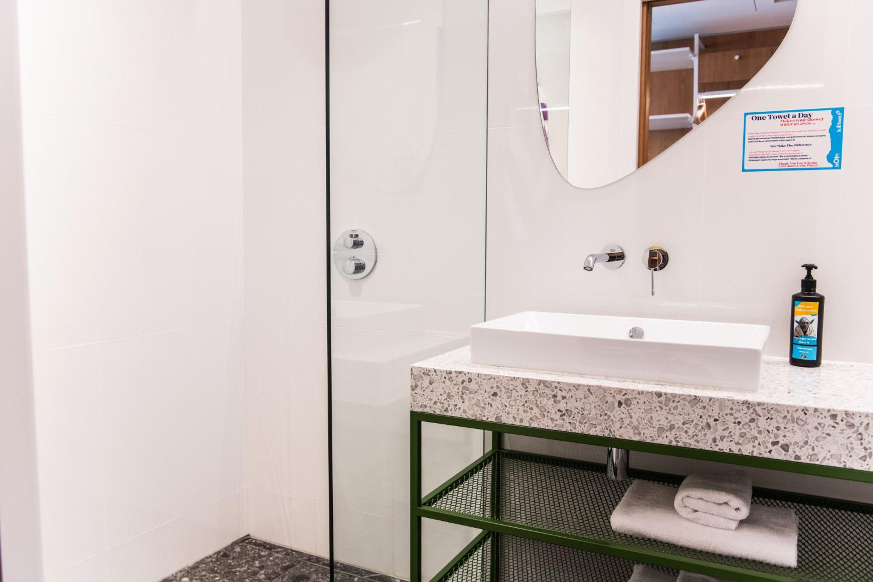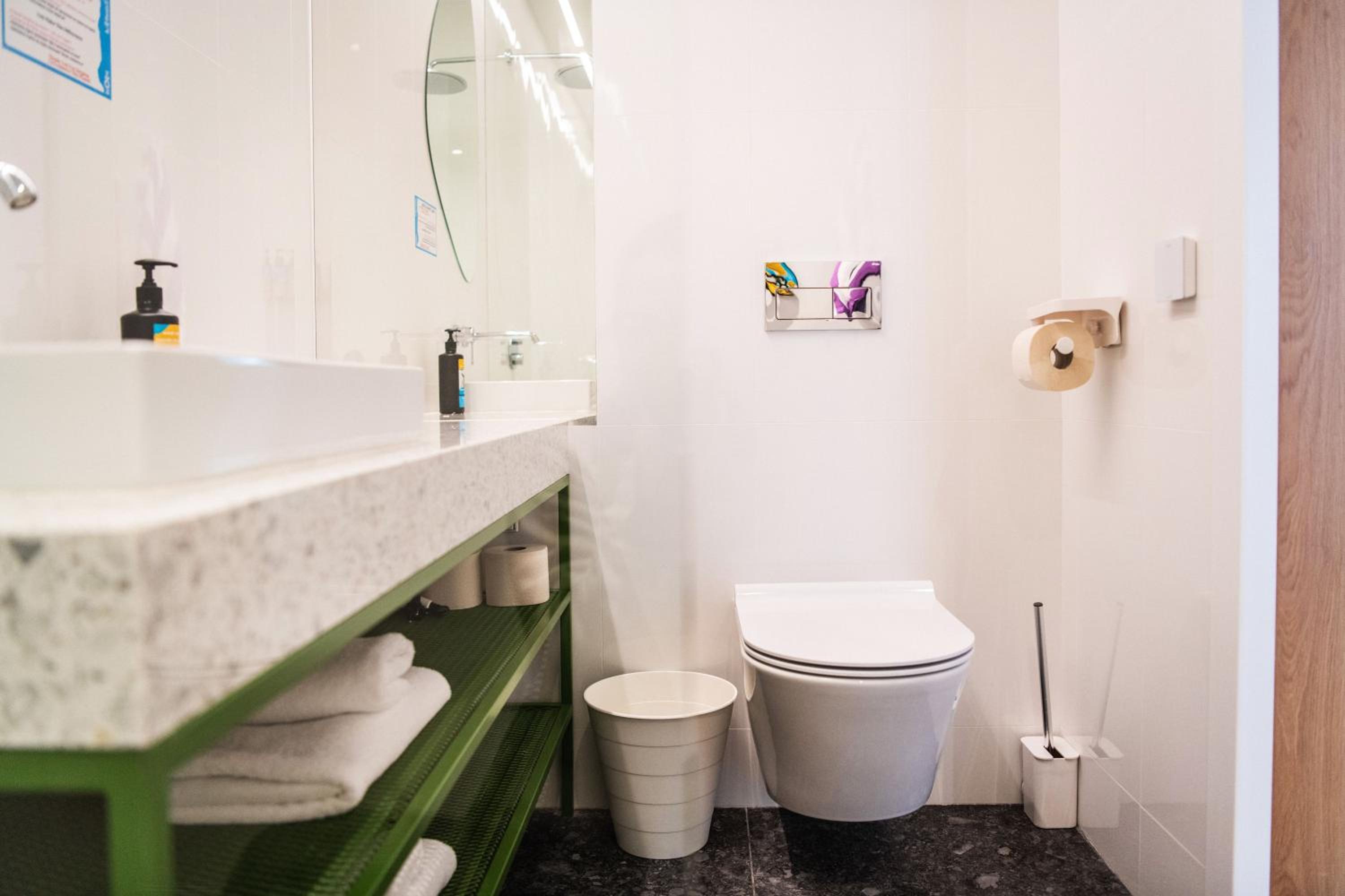 Broken hand shower, broken toilet + dirty one, . Dirty place , smelling bad, cold. How you can understand from “ welcoming” on the door u are their employee you need to clean after urself for next customer and if u late with around 30m after check-off u need to pay CASH 20€ . Not worthy the price.
