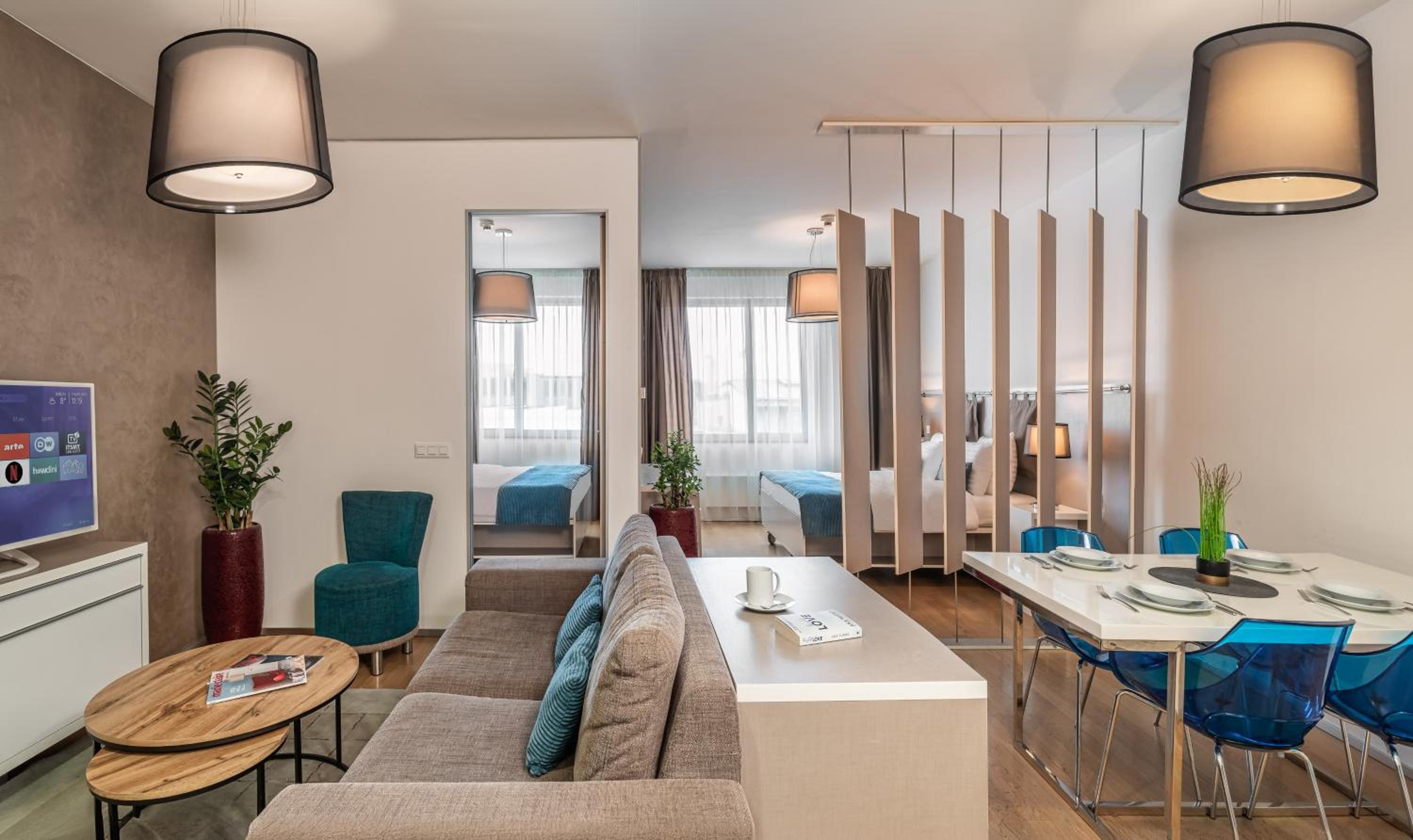 Experience comfort in our well-equipped apartments featuring air conditioning, flat-screen TVs, and fully furnished kitchens. Relax in the spacious seating area or explore streaming services for entertainment.
