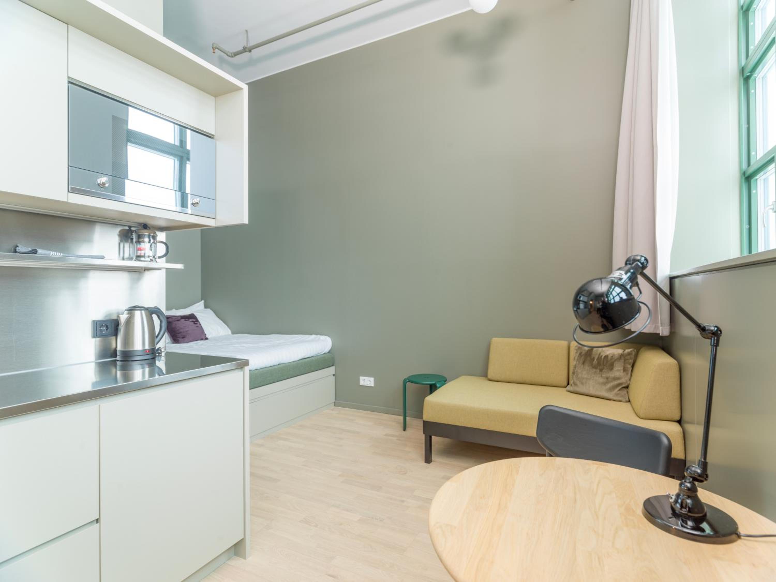 This is a lovely coliving. The studio I stayed in was not very big, but used the space smartly so that I had everything I needed. The bed is very comfortable, the kitchen small but functional, and the bathroom is great. I loved the location, which is quiet yet not far from public transport and an easy ride into the city center. The neighborhood is lovely and the staff is just great.