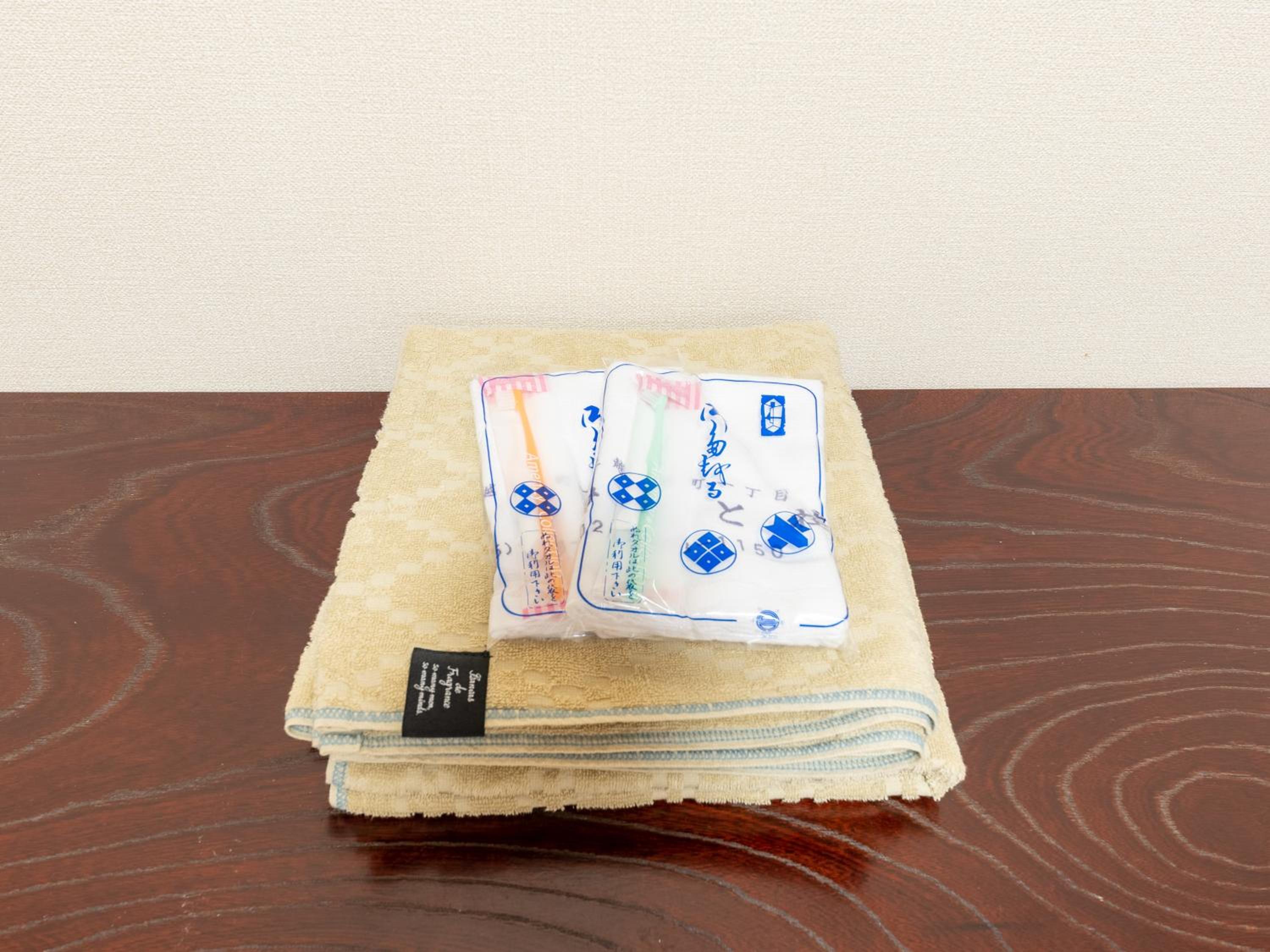 ローブ、バスタオル、フェイスタオル、歯ブラシ歯磨き粉は部屋に人数分ある。