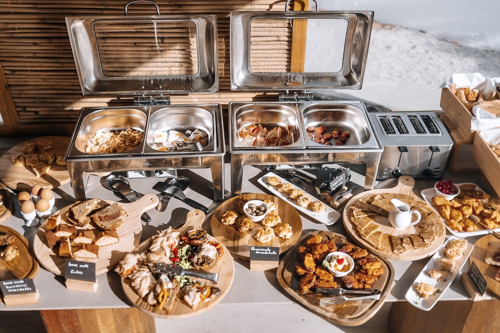 They have a restaurant open throughout the day. I don't really understand how it can be profitable since the hotel has such a small number of guests. I hope it stays open though, as the food is excellent. It has a mixture of Greek and tourist food - and the best burger I'd eaten for some time.