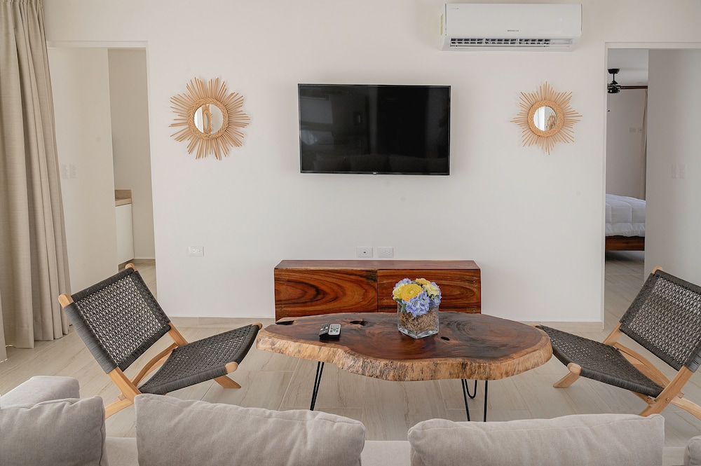 It's a lovely property, but it's in an area that's being developed. The short road to the entry from the main road is gravel with a small lake in the middle and lots of mud. It's about 2.5 miles from teh beach and 1+ mile from the downtown main street. Rent bikes, a scooter, or a car or you will have to take taxis at night- the main road is unsafe after dark. I wish the unit had lamps or something- the lighting was harsh (only can lights that madeit feel like a departmetn store), but otherwise, its great. Pool was too cold for getting in, but was lovely to lounge next to.