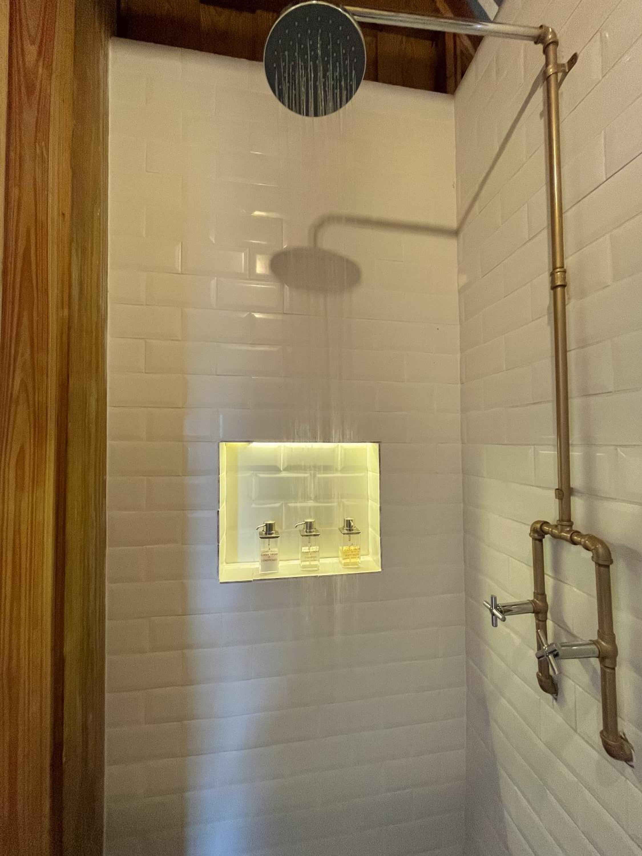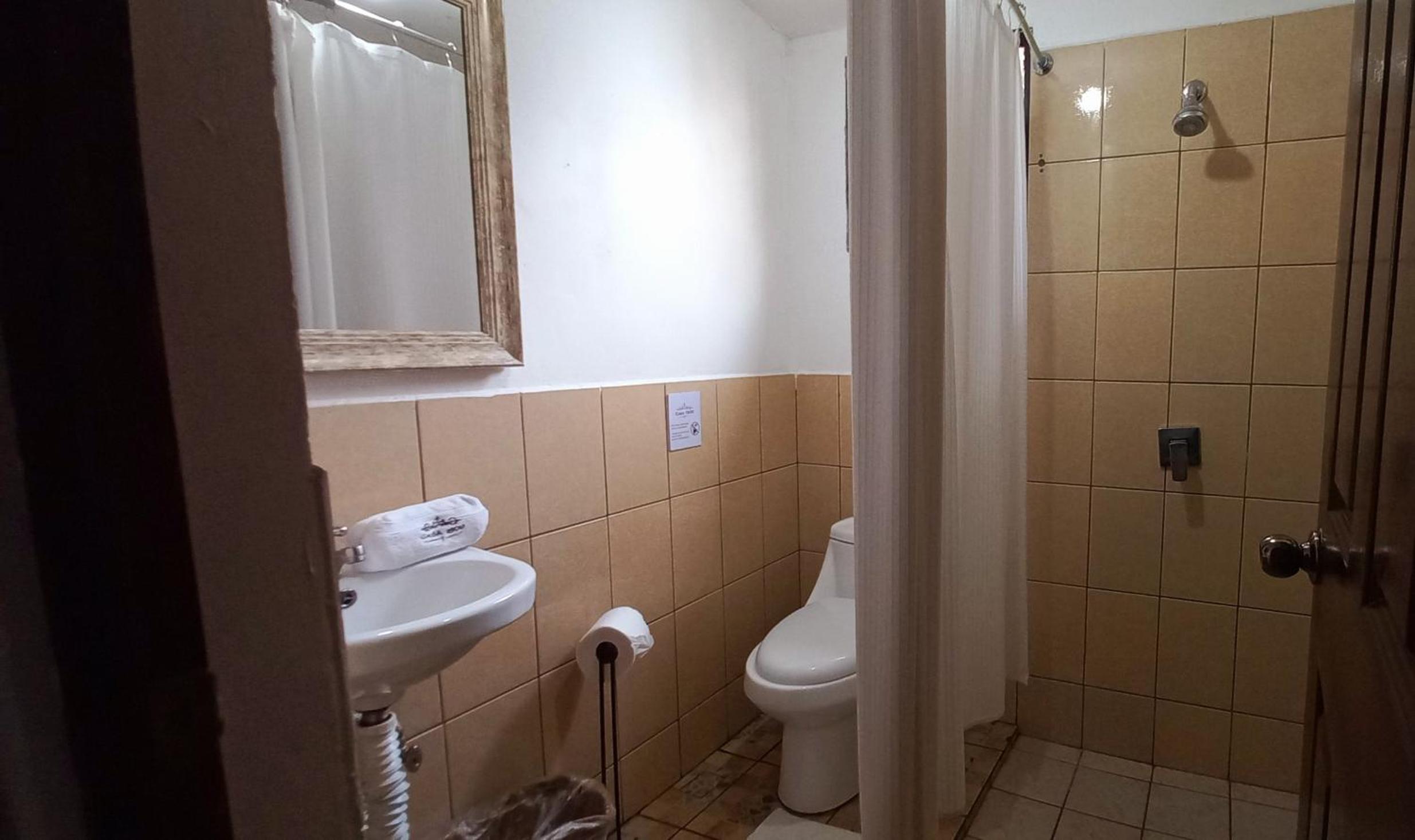 A minor note, the shower is fine however I wish they had a longer shower curtain. It really goes down maybe a little more than half your calf. So when you shower the water splashes around the floor since it’s in a concave square in the bathroom