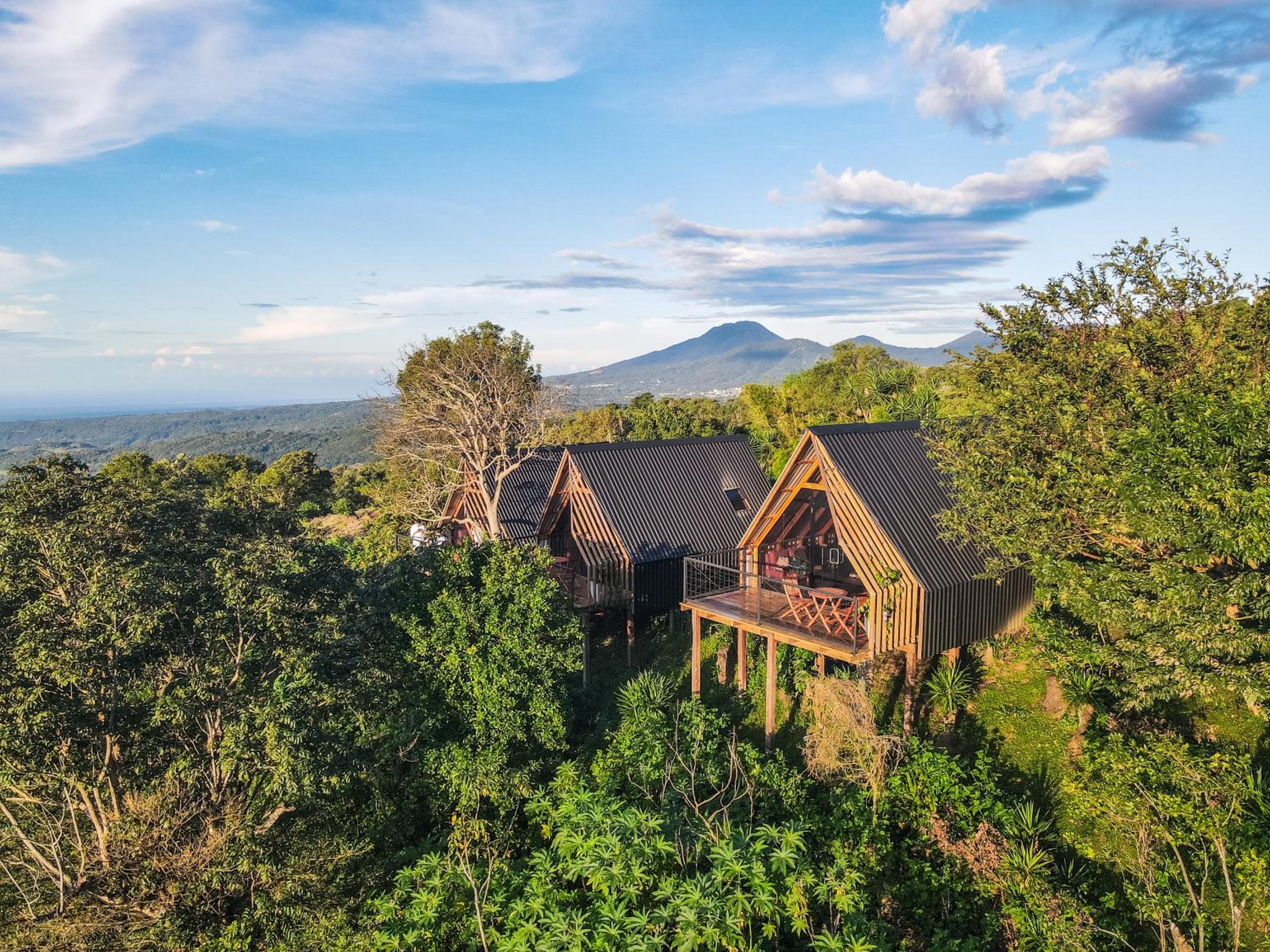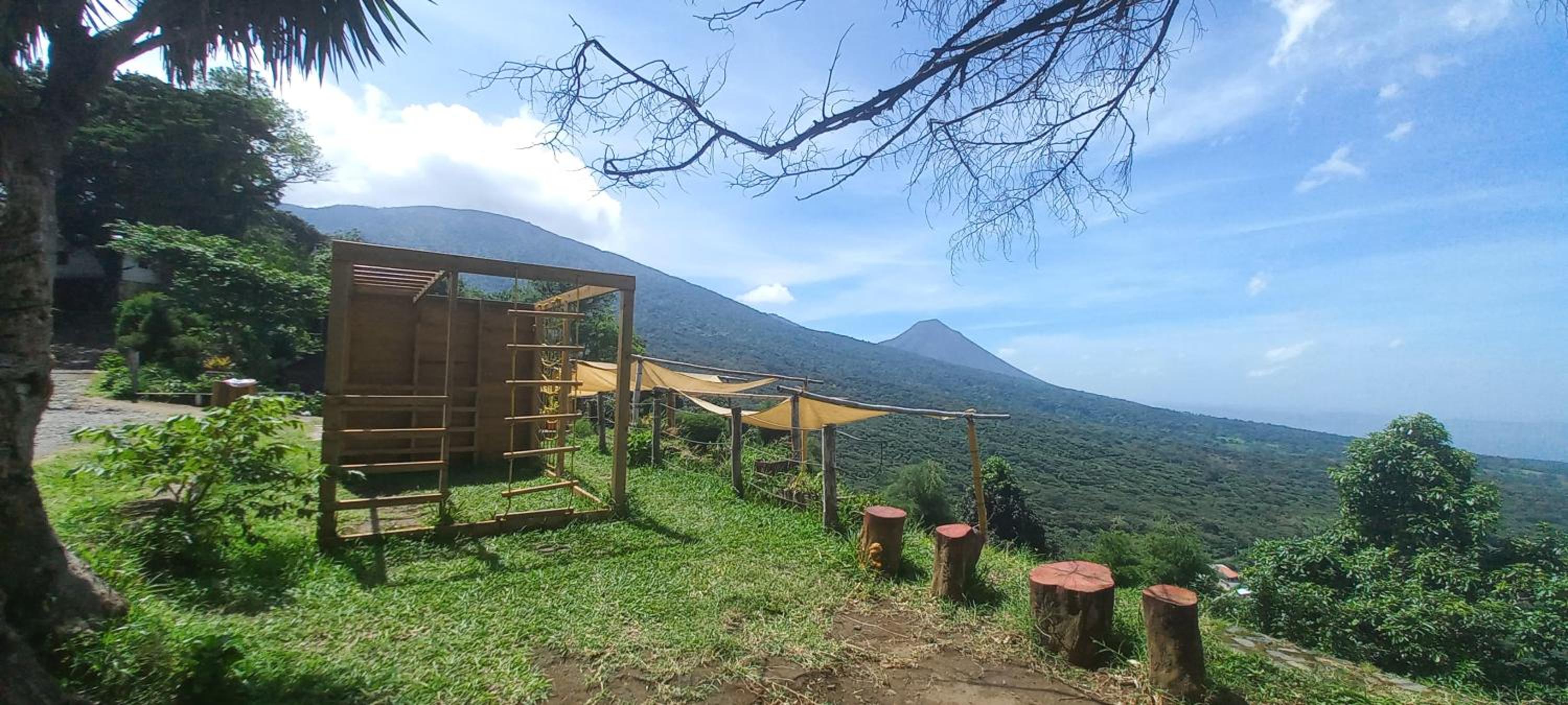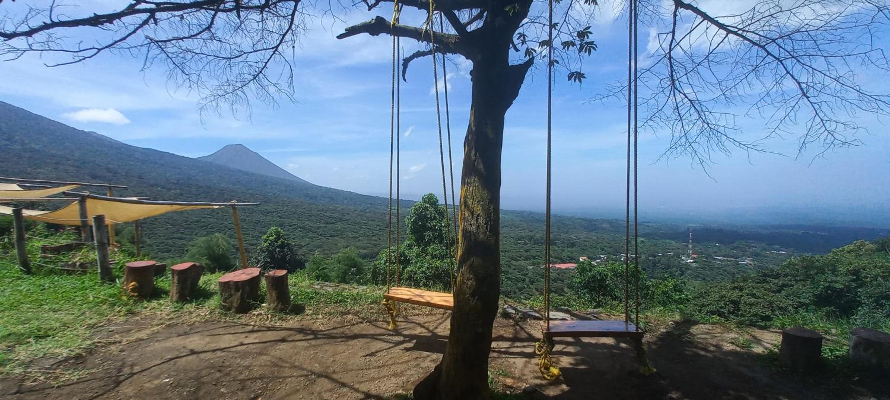 The area is surrounded by lush green landscapes, coffee plantations, and panoramic views of volcanoes like Izalco and Ilamatepec.
