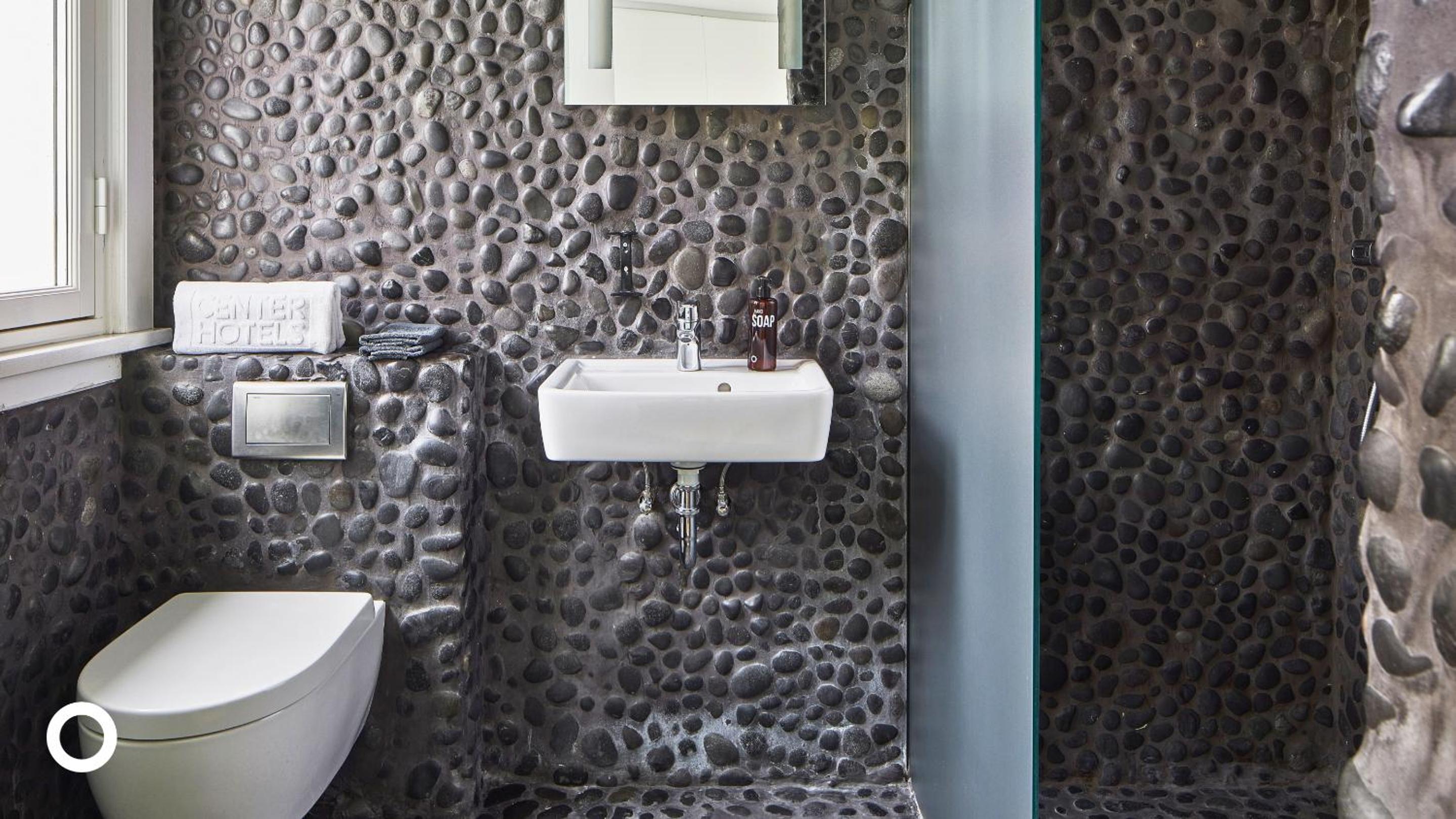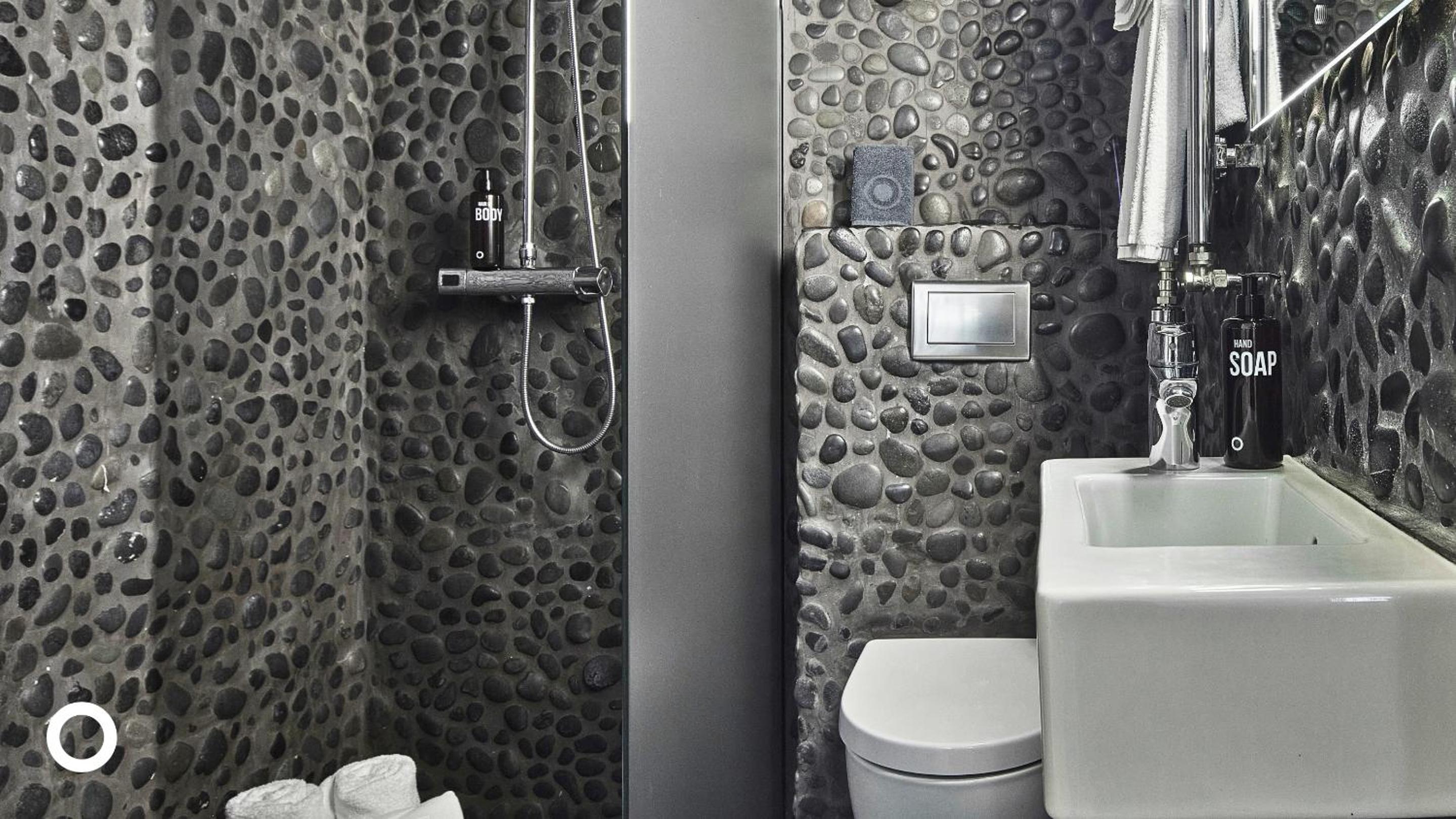 Fancy bathroom and everything fine.