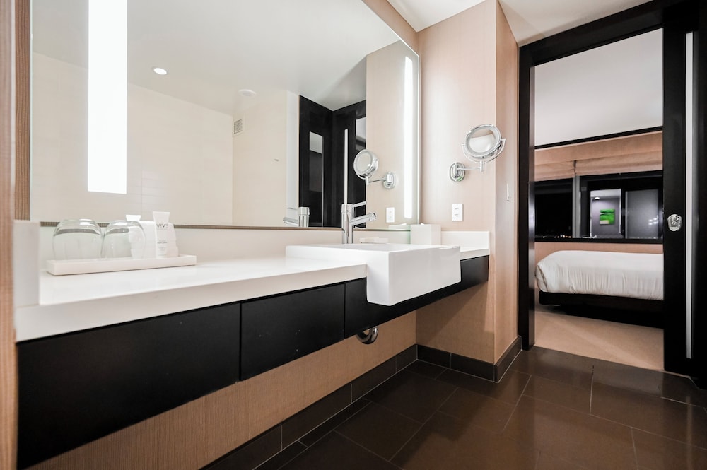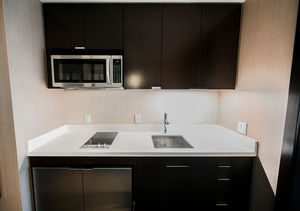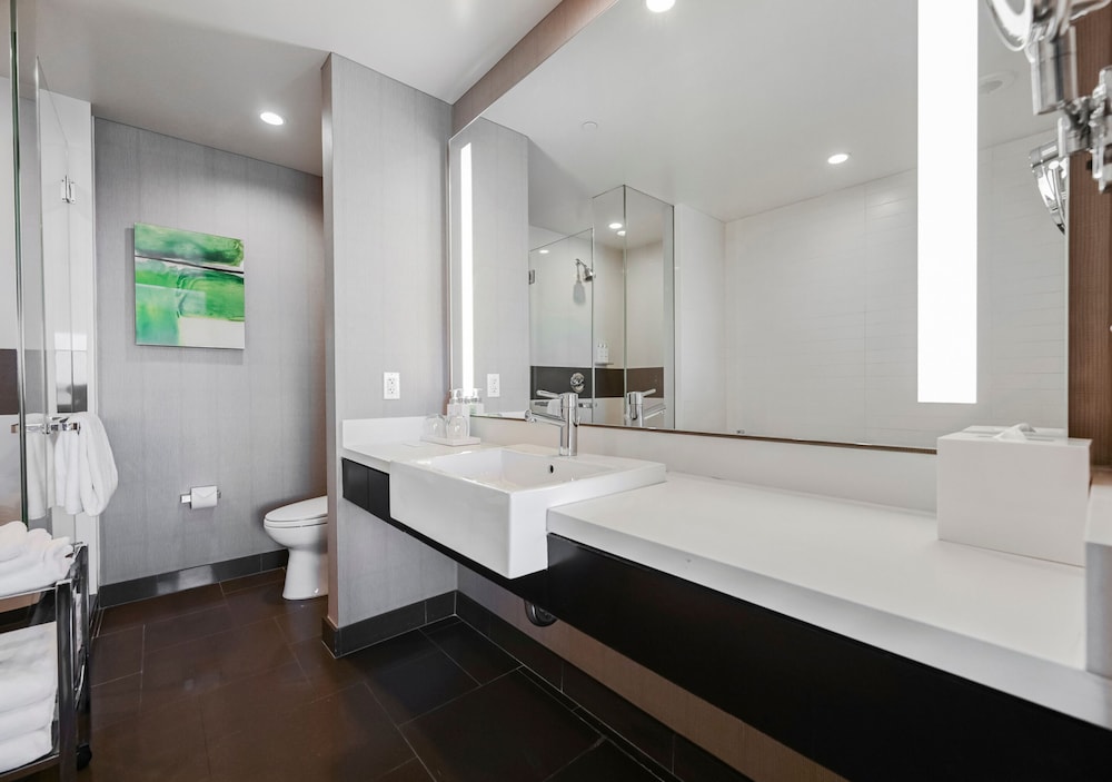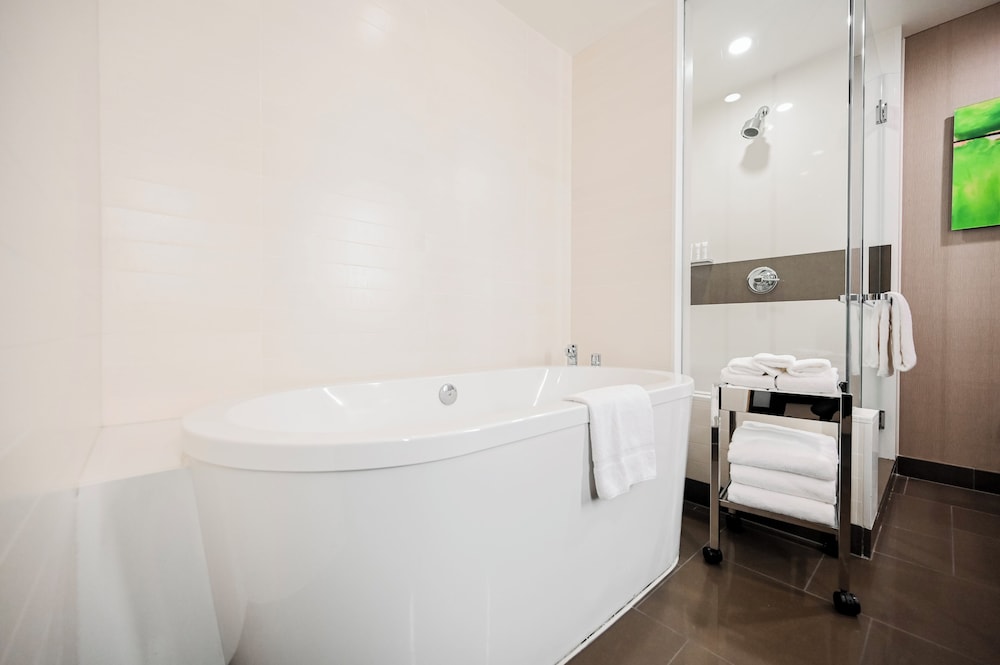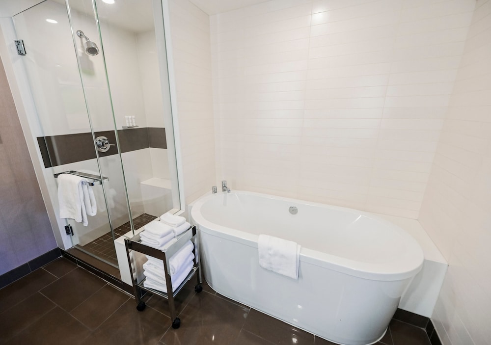 Hotel was great! Close to everything. Modern and convenient. I wish there were more dining options though. The room was fairly clean but there were hairs left on the tub.