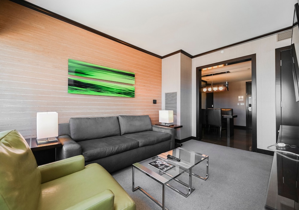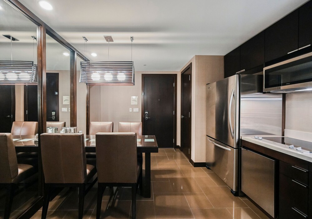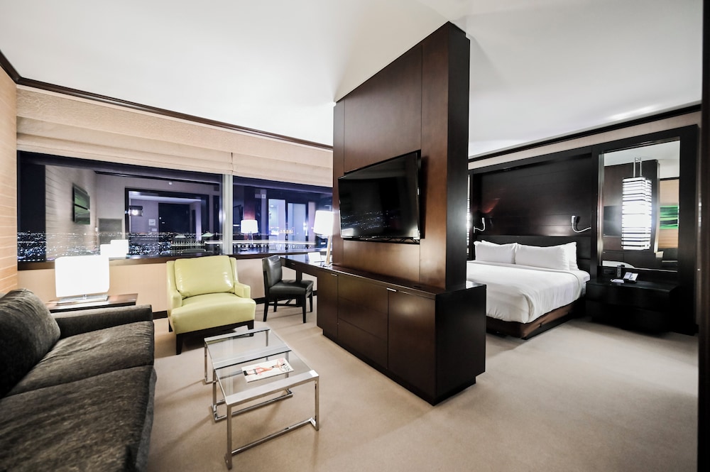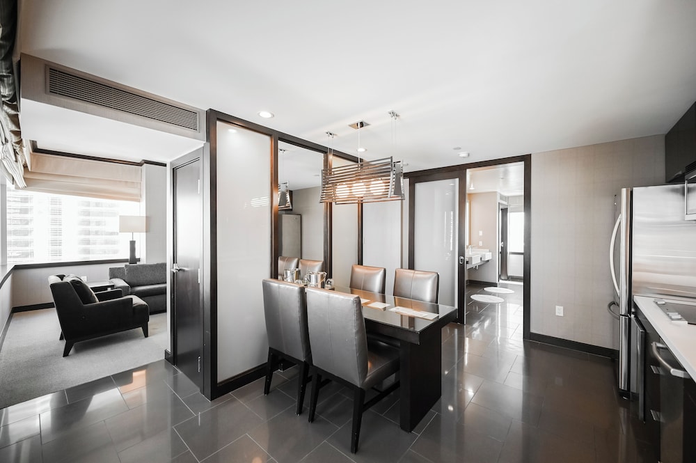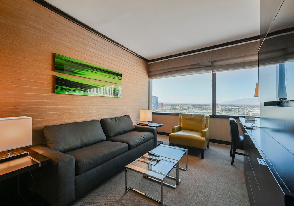 If you need a centrally located one bedroom suite with kitchen, dining room, and 180° views, this is the place! We were here for five days both working and playing and it was perfect. Good food in the building but no casino. Which is good. Pool area is very nice and excellent spa and fitness facility. 24 hour convenience store with food selections available and Starbucks in the building.