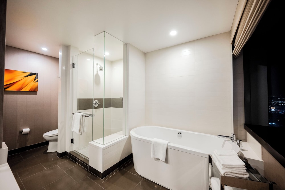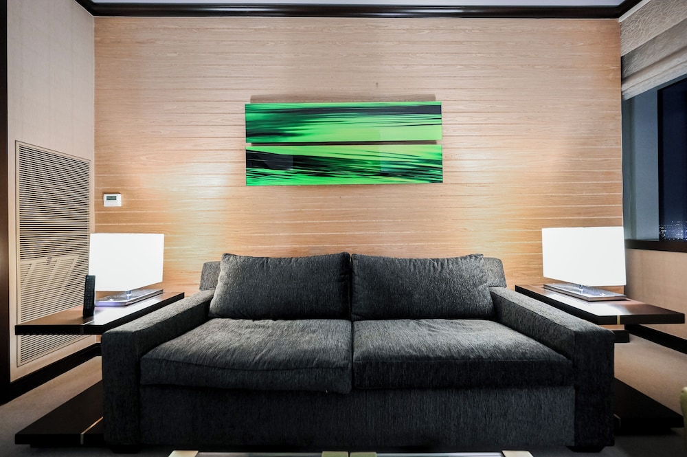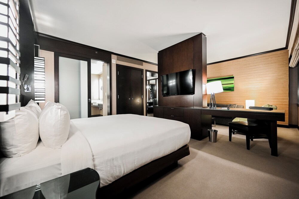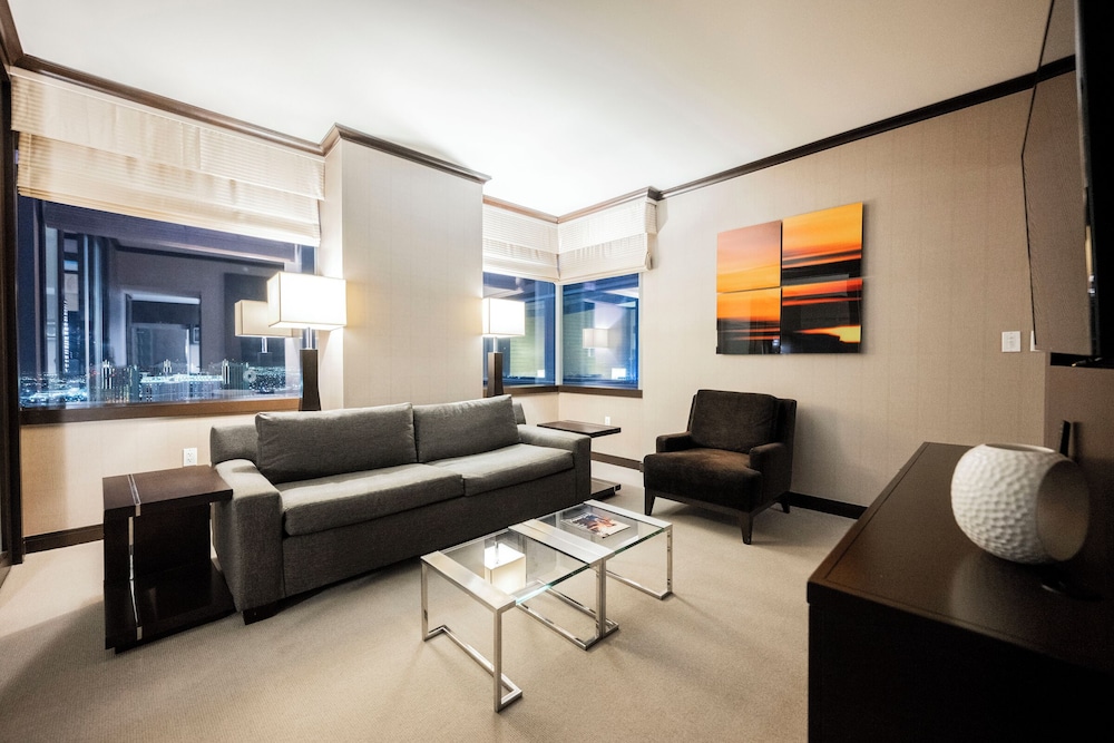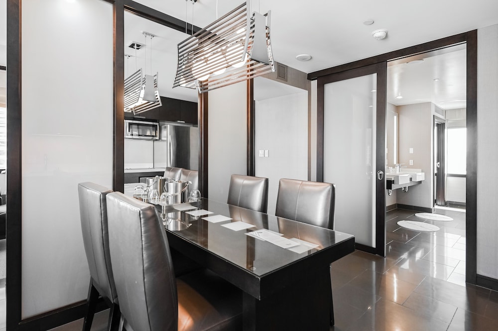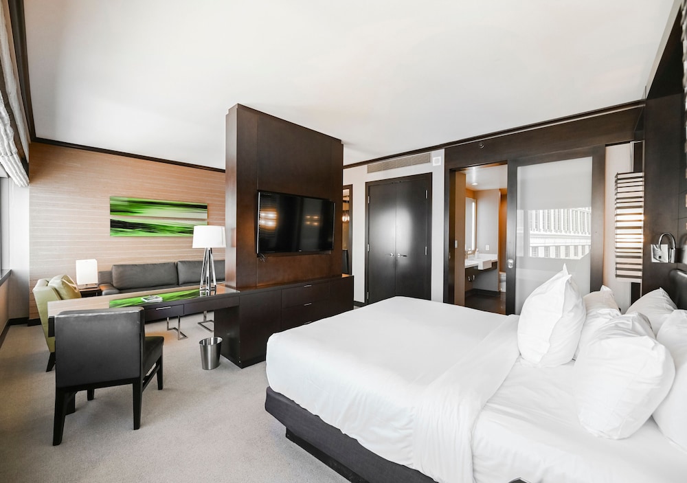 If you need a centrally located one bedroom suite with kitchen, dining room, and 180° views, this is the place! We were here for five days both working and playing and it was perfect. Good food in the building but no casino. Which is good. Pool area is very nice and excellent spa and fitness facility. 24 hour convenience store with food selections available and Starbucks in the building.
