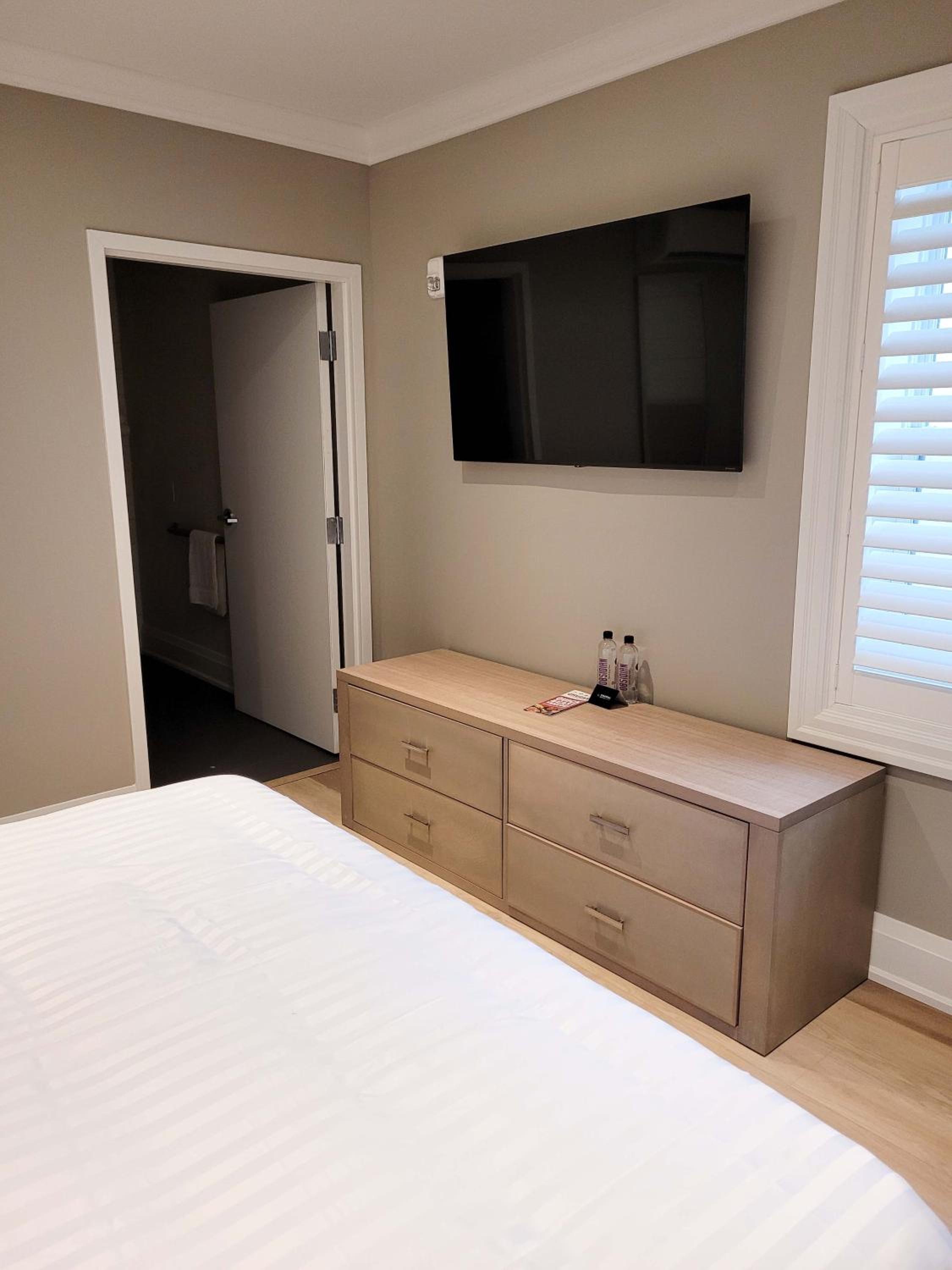 The rooms featured in pictures when booking the room are very deceiving. The room was quite a bit smaller than anticipated. We would have liked some simple plastic cups in the room for beverages. Thought it was odd that there was not a coffee maker.