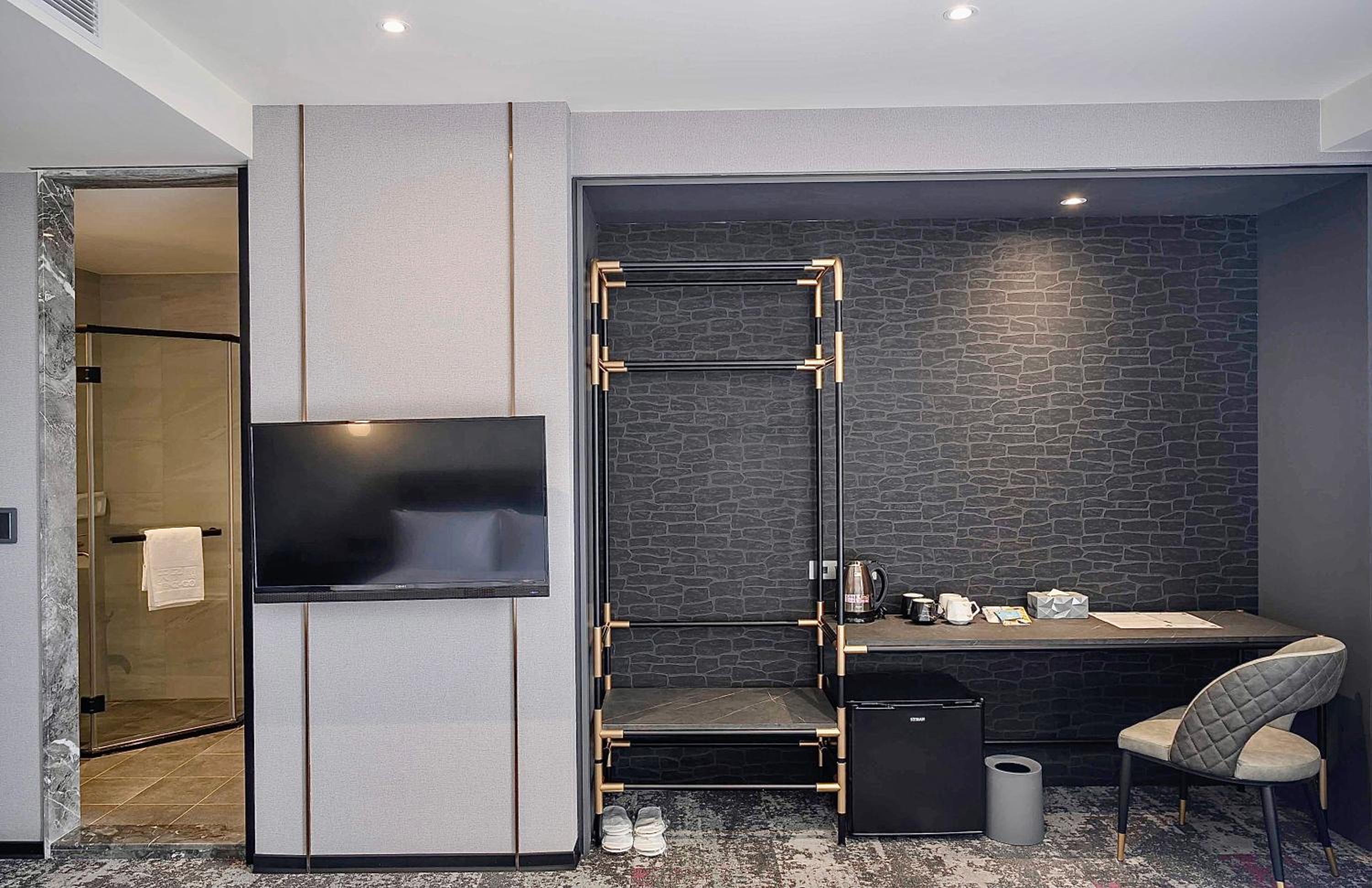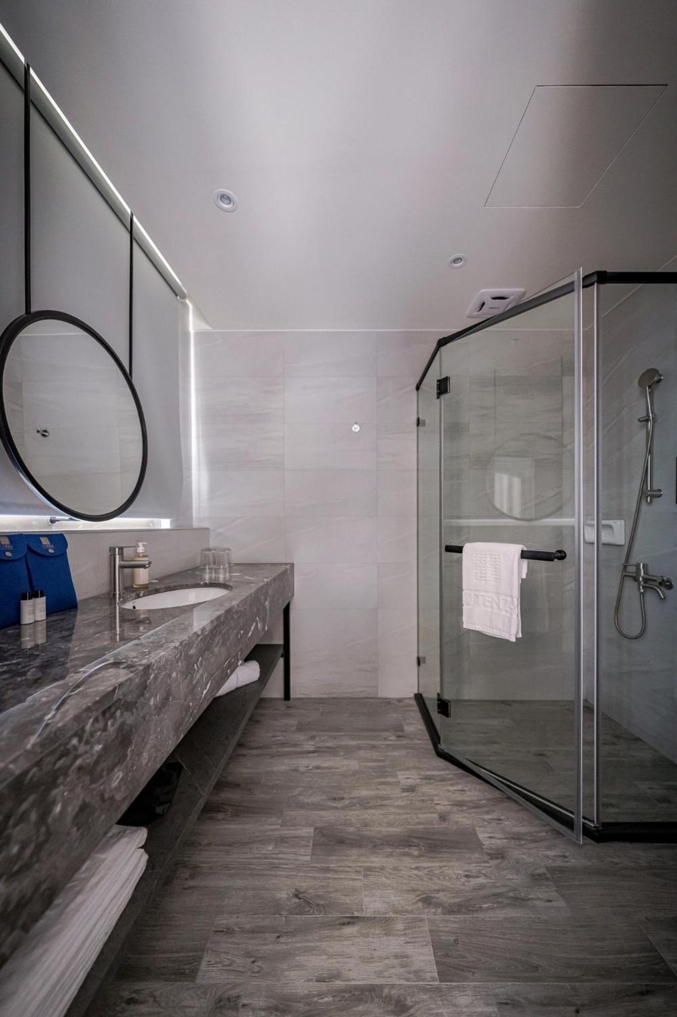 房間燈光太暗,浴室外面門如果不是冰柱玻璃會更好,因為浴室正對床會看到在浴室的影子很怪。浴室可以有放衣服的層架會比較方便不然換洗衣服都沒地方放。馬桶旁的垃圾桶用旋轉蓋的很不放便很難丟衛生紙,只能把上蓋先取下才能丟衛生紙。