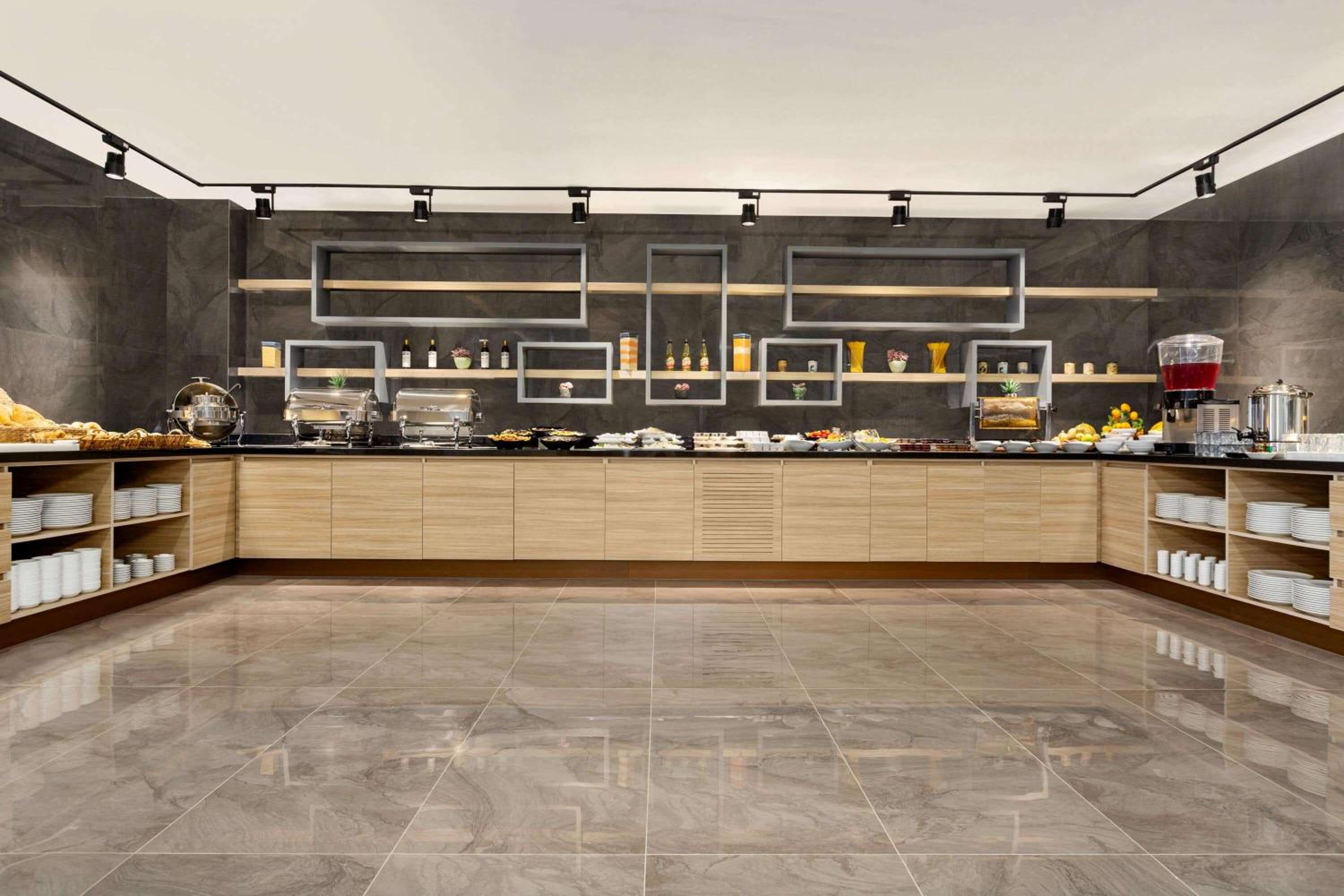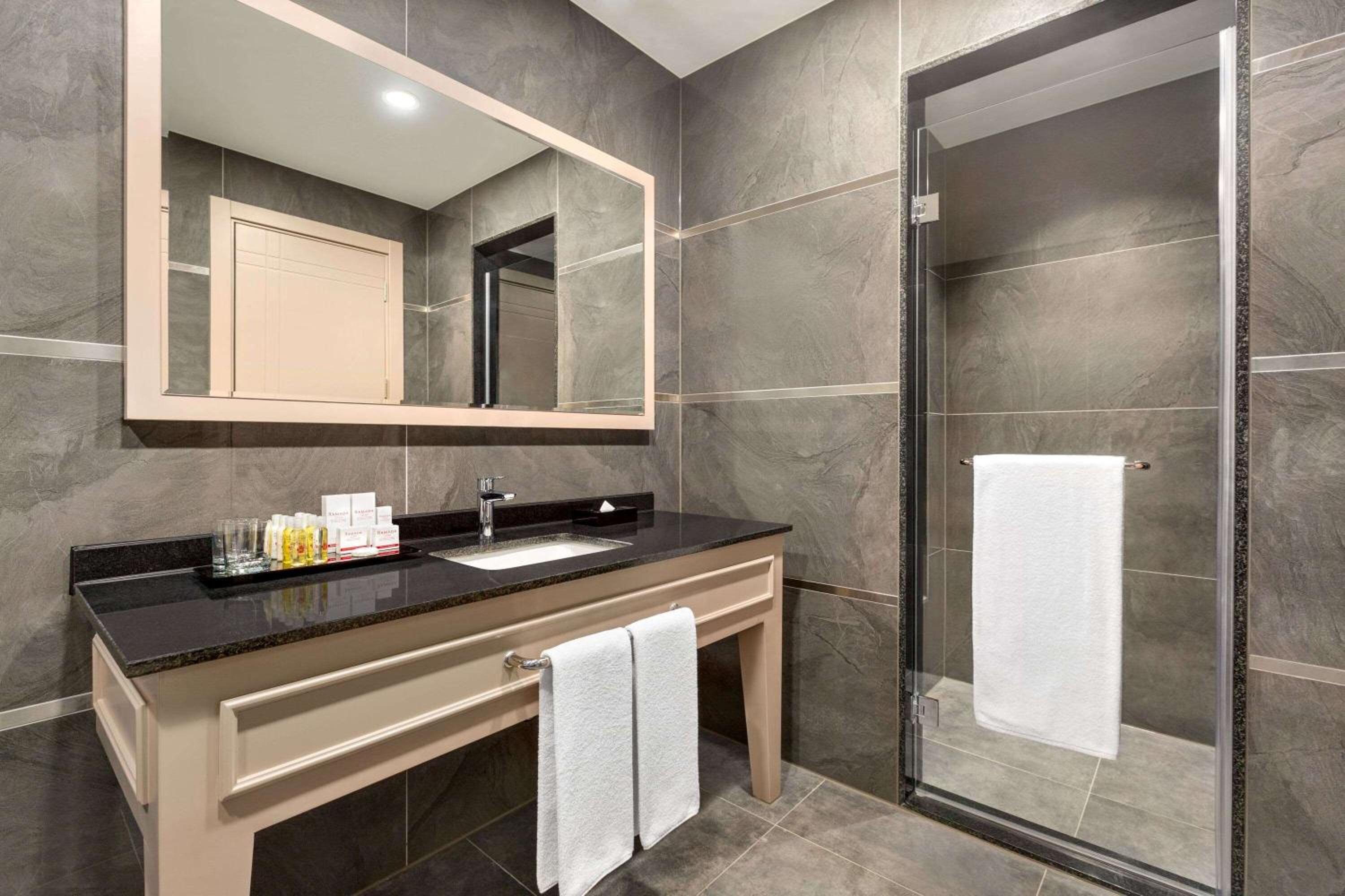 The hotel was a very high standard as expected from a Ramada hotel - very clean throughout and the reception staff were very nice and helpful - .their English was not fluent but we managed with translation apps. There was a nice sitting area in the huge lobby and additional seating in a small outside covered terrace area. The breakfast was included and was very nice. There were a number of good restaurants (and a nice McDonalds!) next to the hotel. The air-conditioning throughout the hotel was perfect - important as it was extremely hot outside when we visited in late August.