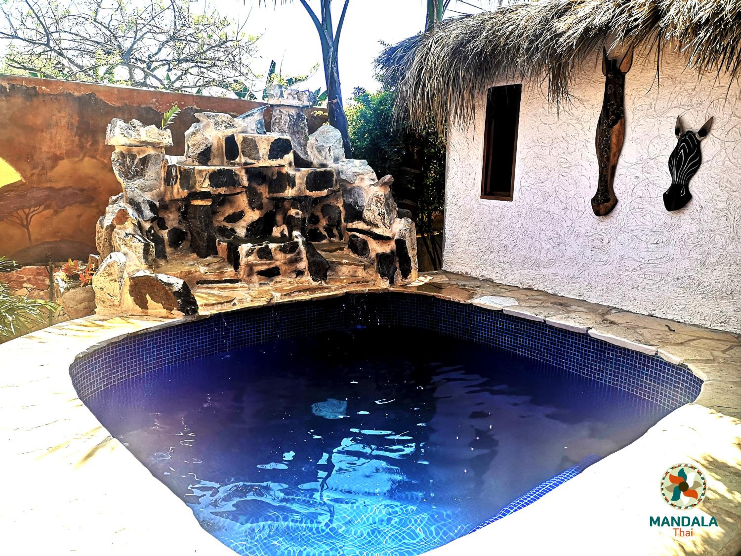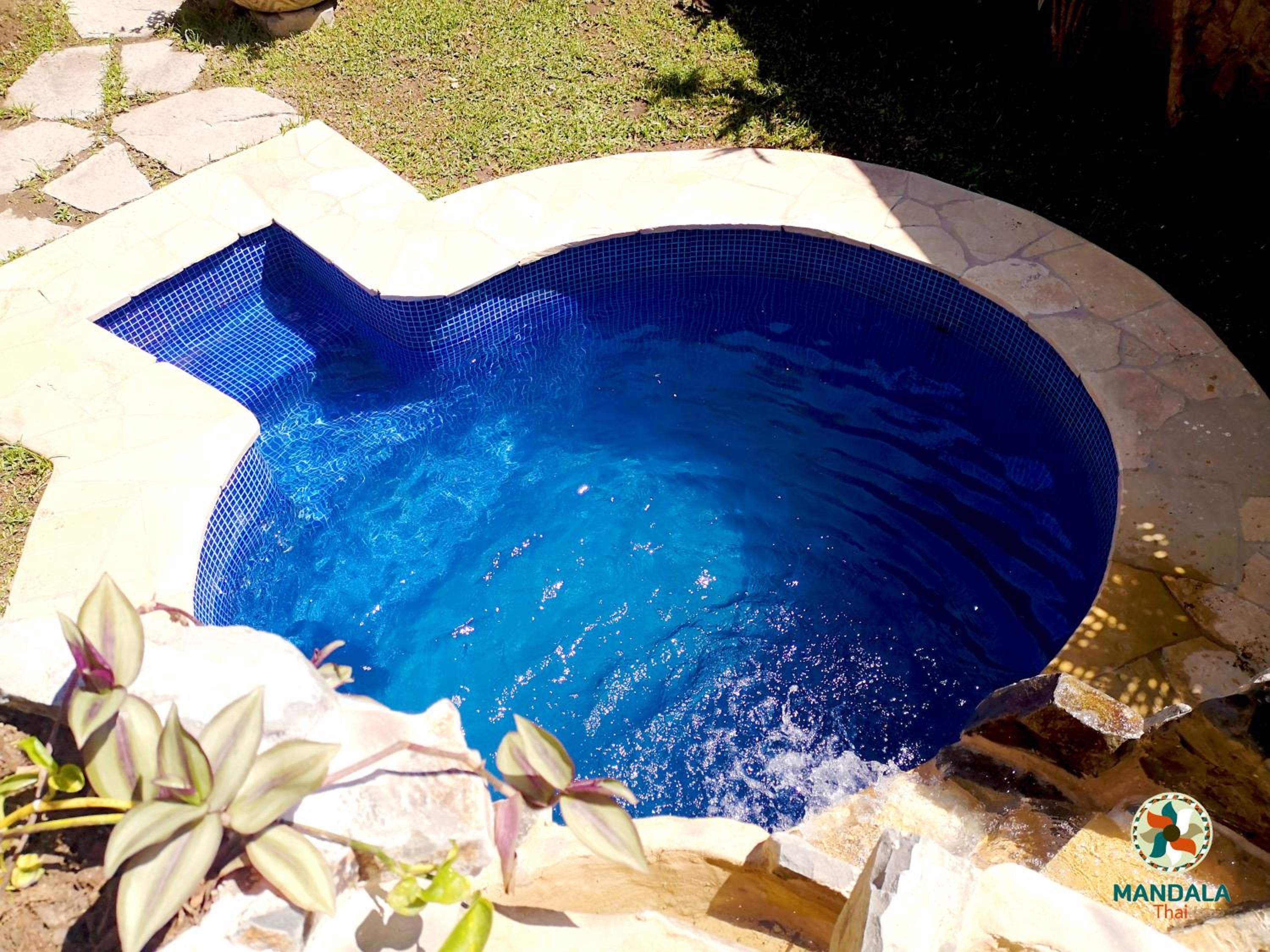 Indulge in relaxation at Mandala Thai's outdoor swimming pool and lush garden, perfect for unwinding under the sun or enjoying a peaceful evening surrounded by nature.