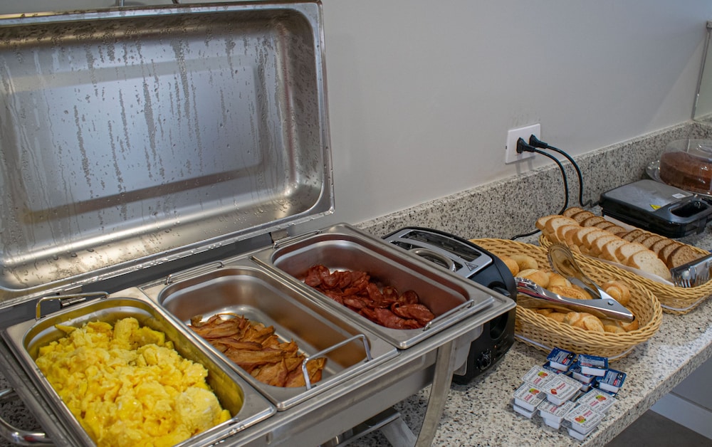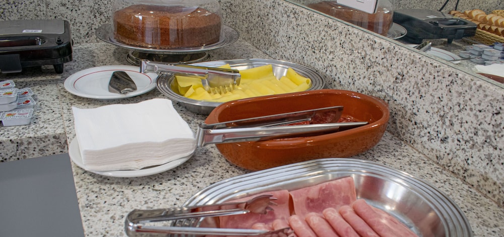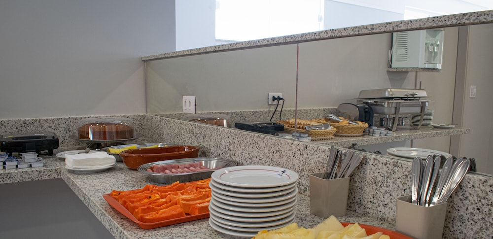 Café da manhã muito diverso e bem arrumado. Acomodação e estacionamento no local de fácil acesso