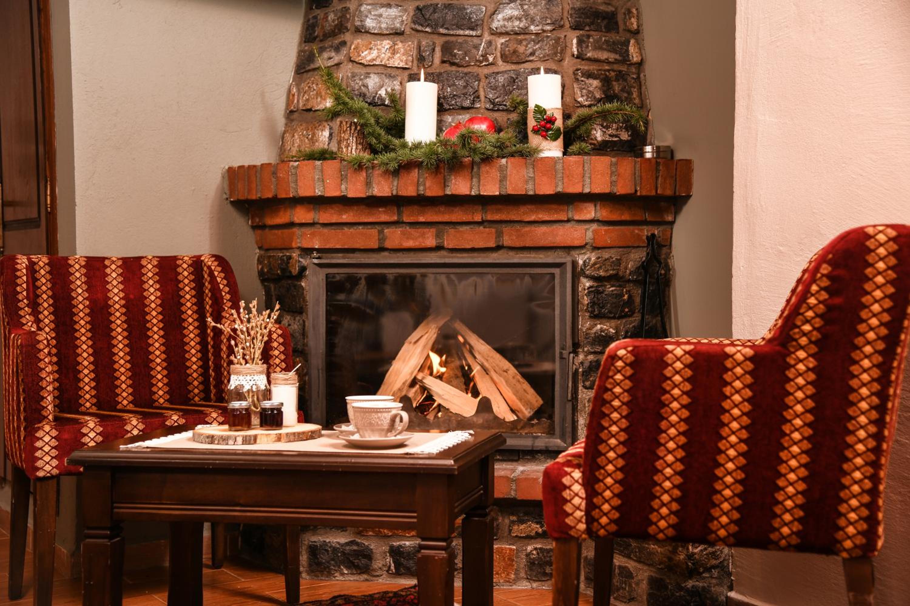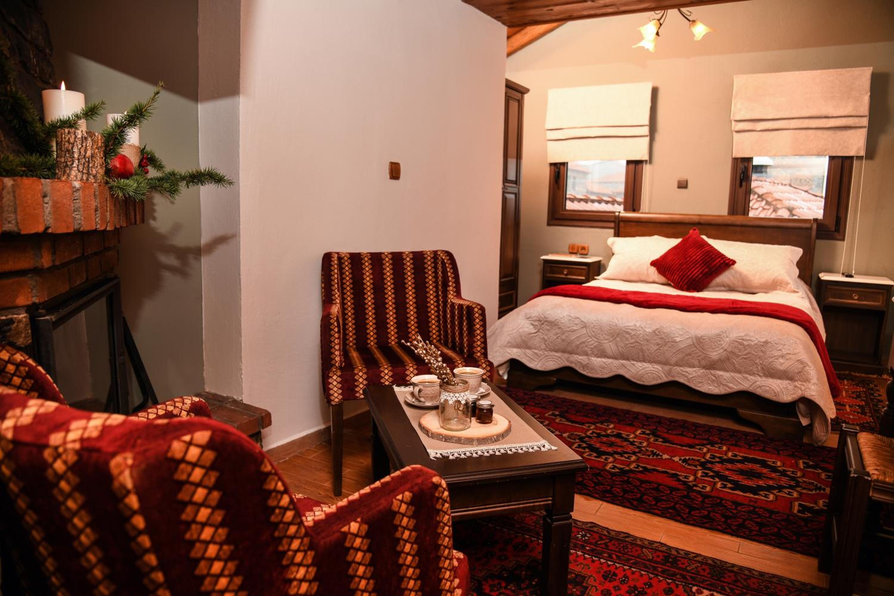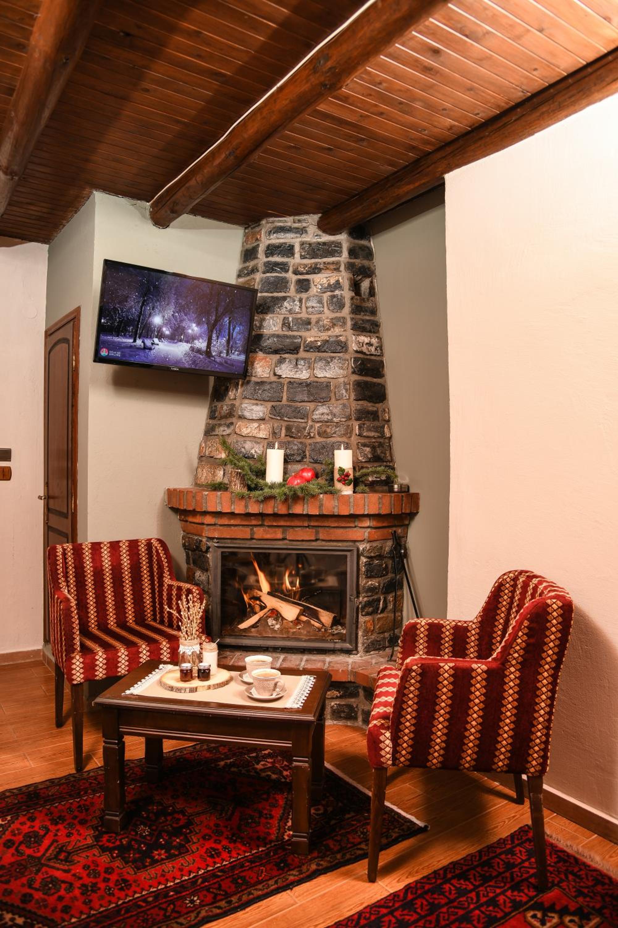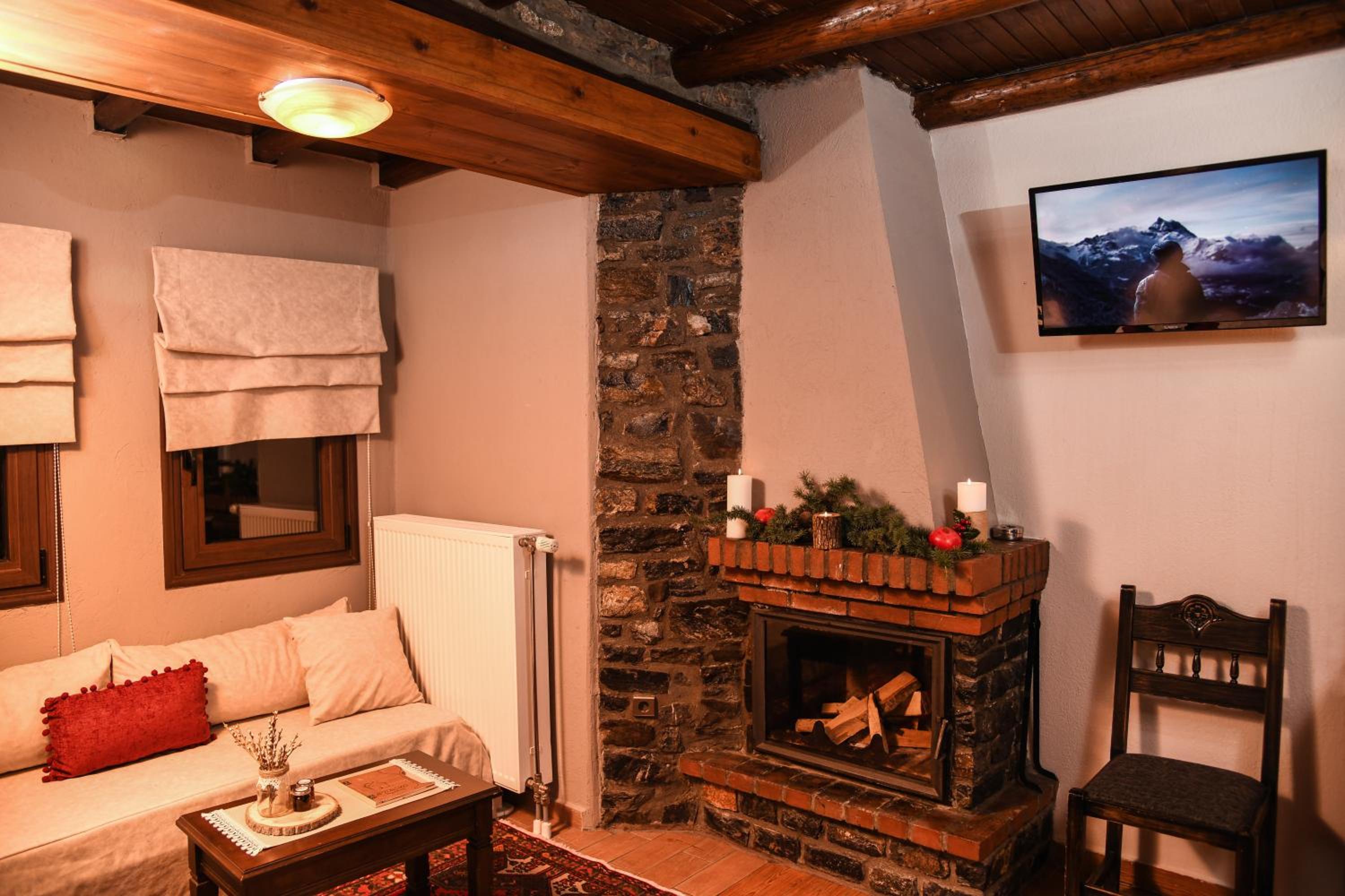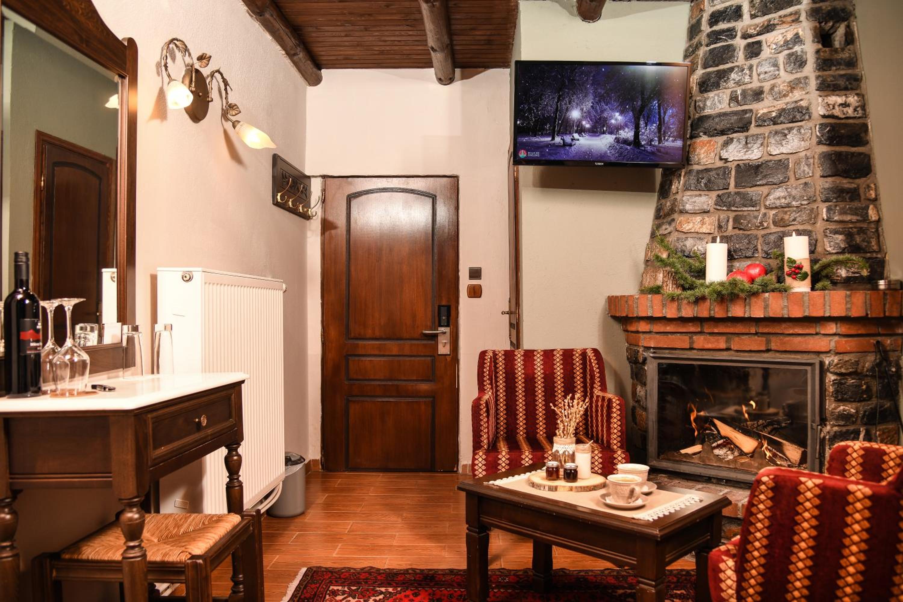 Experience a stay in our stone-built rooms featuring fireplaces, wooden floors, and traditional mountain decor, all with stunning views of Mount Vorras. Enjoy modern amenities like flat-screen TVs, heating, and free WiFi.