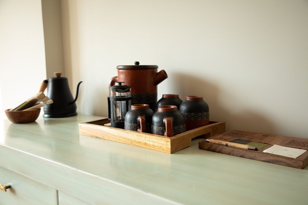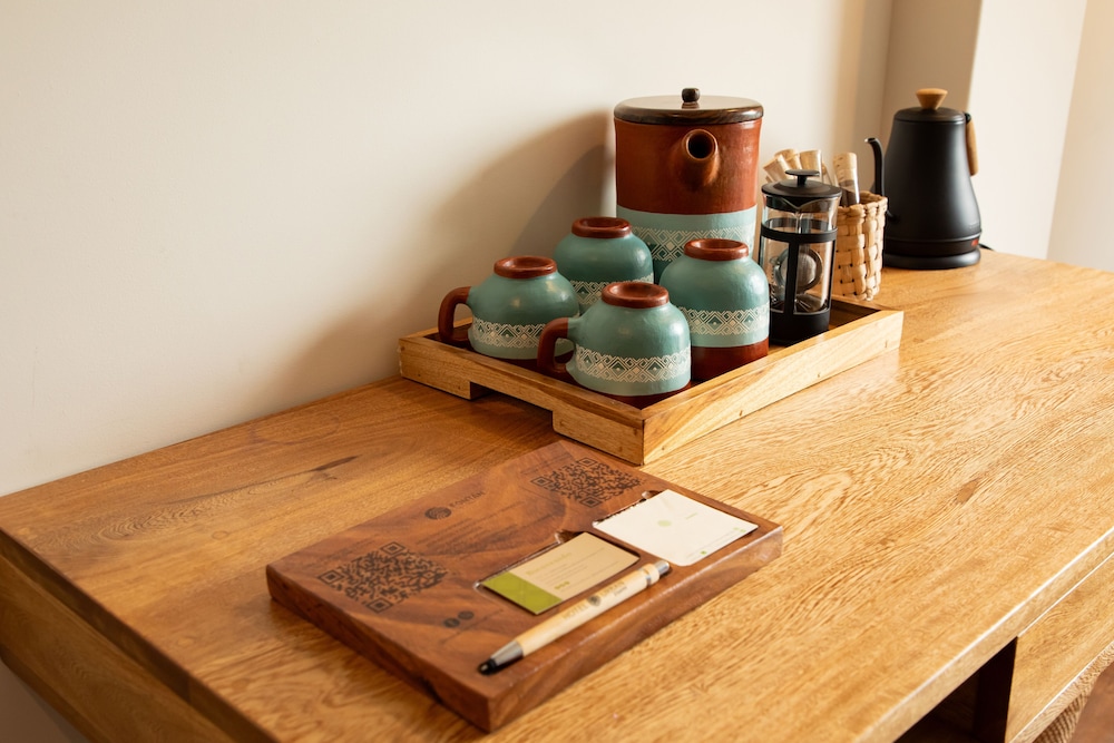 There is a meditation corner(ground sitting setup) It is pretty dusty due to fluffy materials. Also if you want to take shower in early morning warm water takes 5-7 minutes.