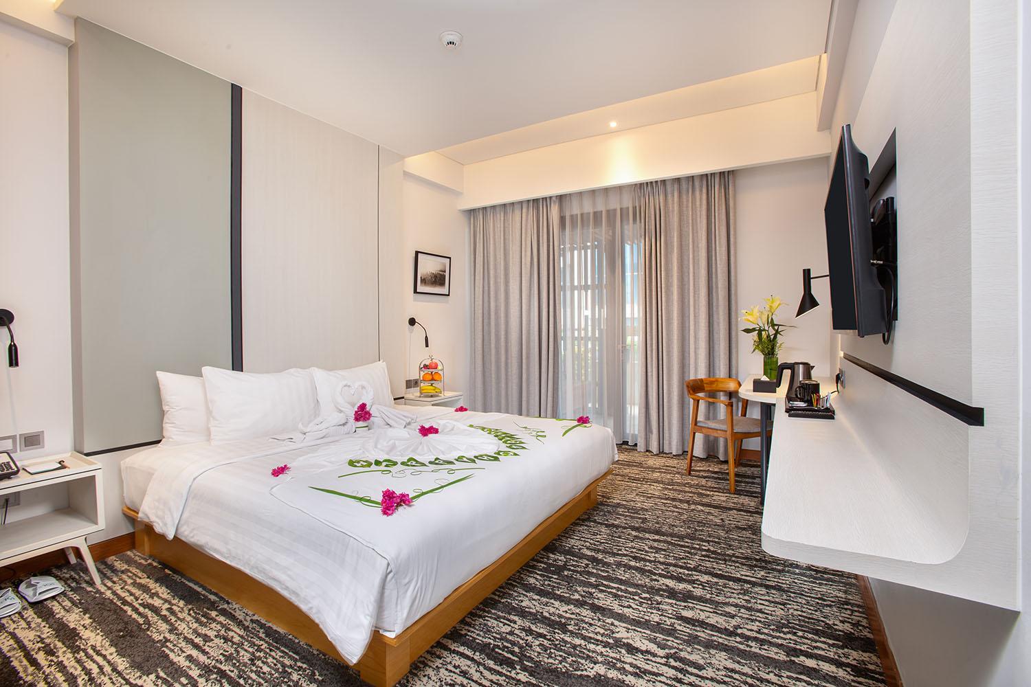 Each room is thoughtfully equipped with modern amenities such as air conditioning, a safety deposit box, and a flat-screen TV. Some units even feature a balcony for a touch of outdoor charm.