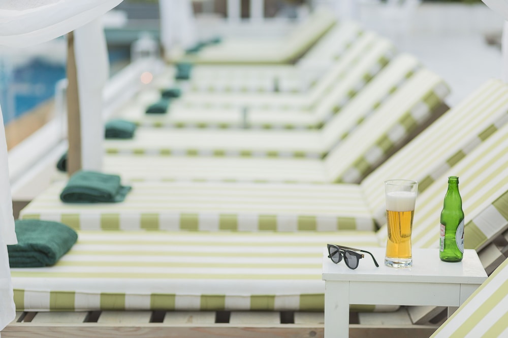 The sunbeds were amazing,breakfast very good but very cramped,the room & bed very comfortable , the hotel had been refurbished & only opened in May so still had a few problems that needed fixing ,Our air conditioning leaked water all over the floor & although we told reception it wasnt sorted (we only stayed 2 nights) We had no hot for showers water on both mornings,the french doors were still the old doors & the glass seemed unsafe & the doors noisy when opening or closing,great location for the town & beach & despite the problems we enjoyed our stay