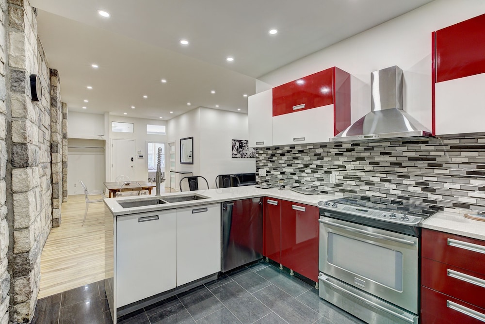 The loft house was very spacious for our family of 5 - there are 2 bedrooms with 3 double beds and a huge living, dining area. The bathroom is also very big and spacious. We enjoyed the central location, on Rue Sainte-Catherine with lots of eateries and bars, and the main shopping district is an easy walk away.