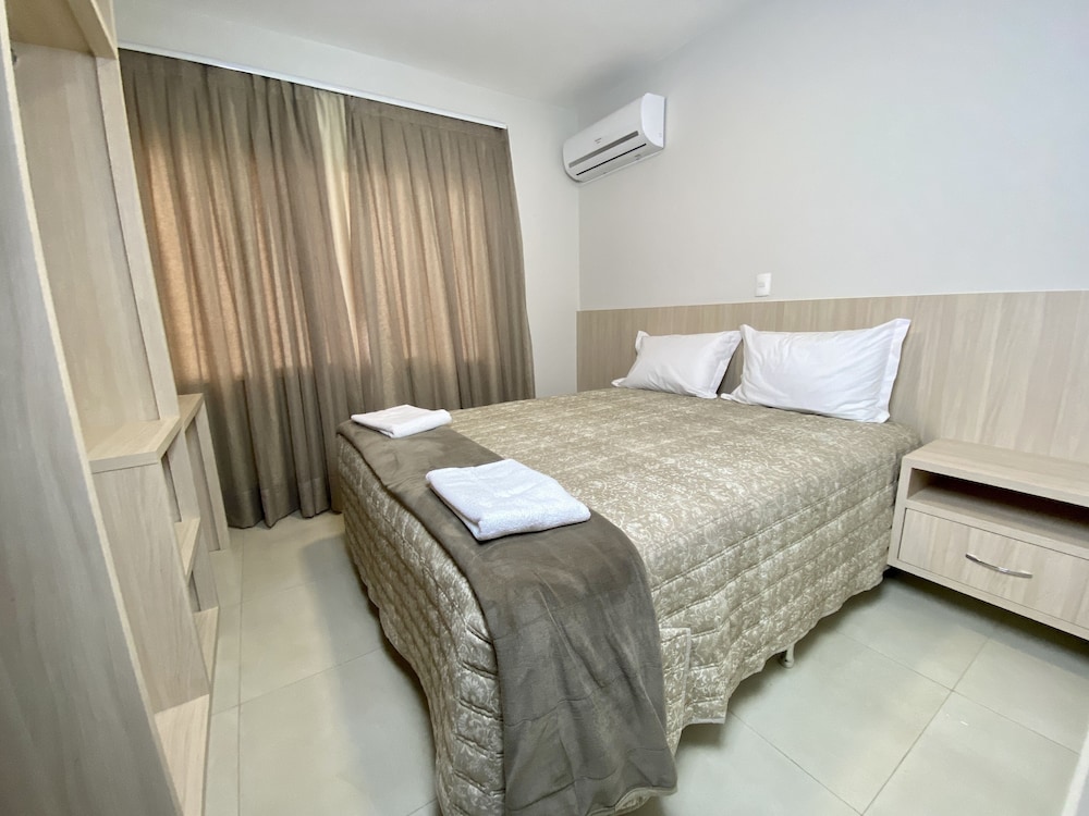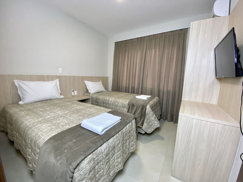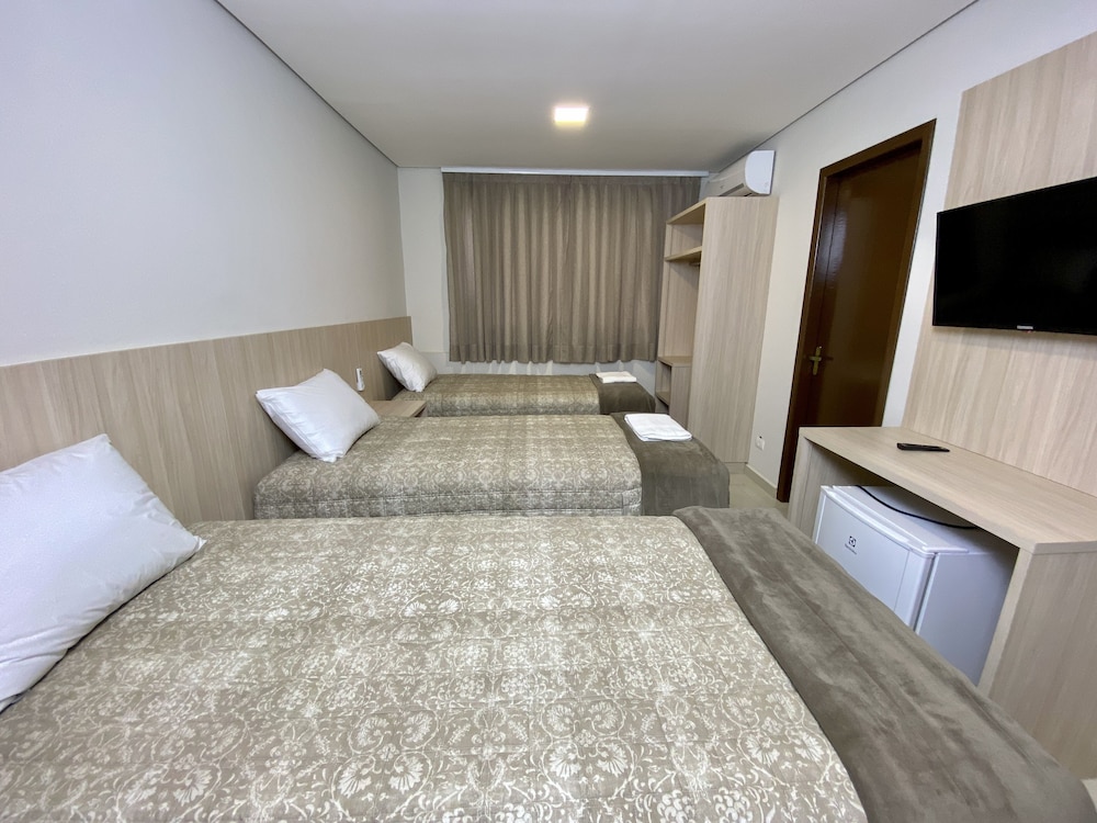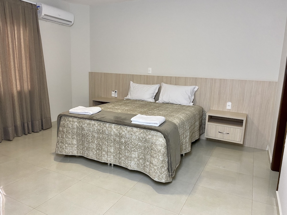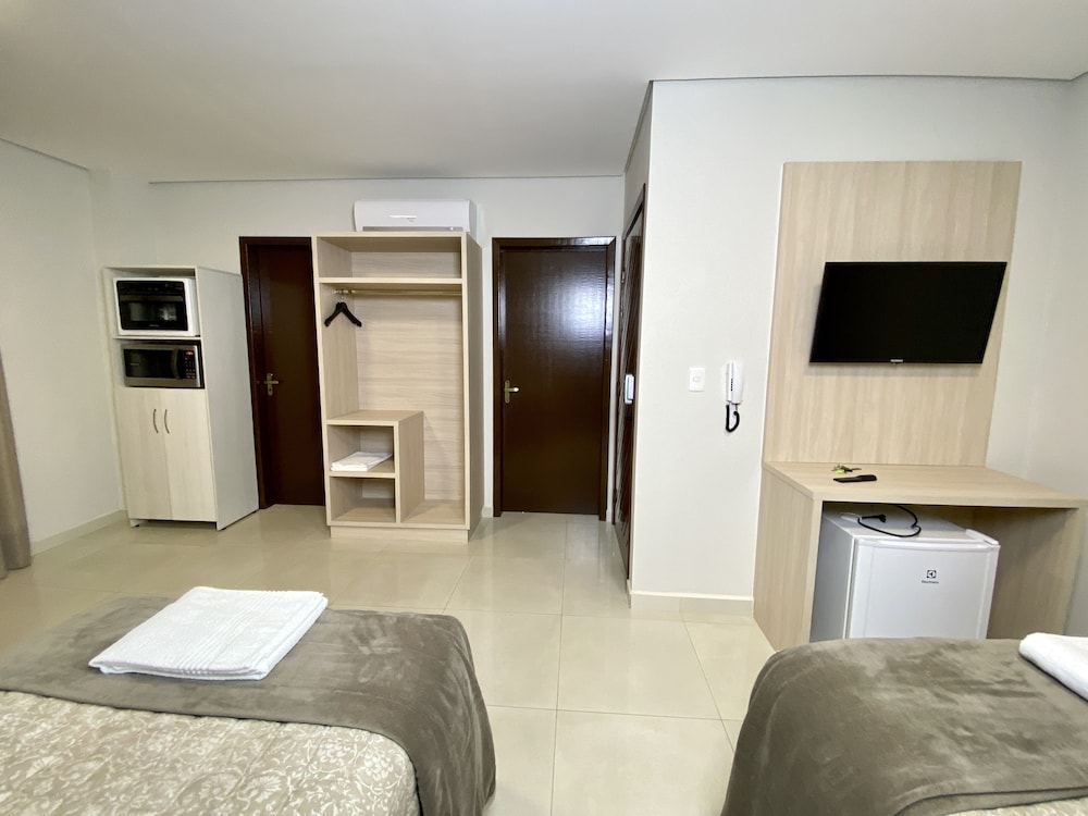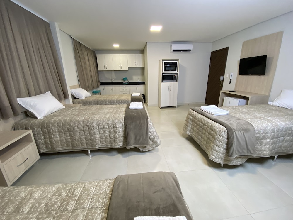 O colchão e cobertas são ótimos, possui secador, tv, frigobar, armário e ar condicionado. Para quem vai com o objetivo de compras no Paraguai é muito bom pois da para ir a pé até a ponte e atravessar tranquilamente, para quem vai de carro também acredito ser um bom local de estadia pois os quartos realmente são ótimos, entretanto se o objetivo é passear pela cidade é bem longe de tudo e não tem nenhum movimento à noite, o que fez com que gastássemos MUITO em uber, pois é bem longe de tudo. Não tem restaurantes/bares por perto e todos os passeios tradicionais (cataratas, museus, parque das aves etc) são bem longe, cerca de 20-30 minutos sem trânsito.
