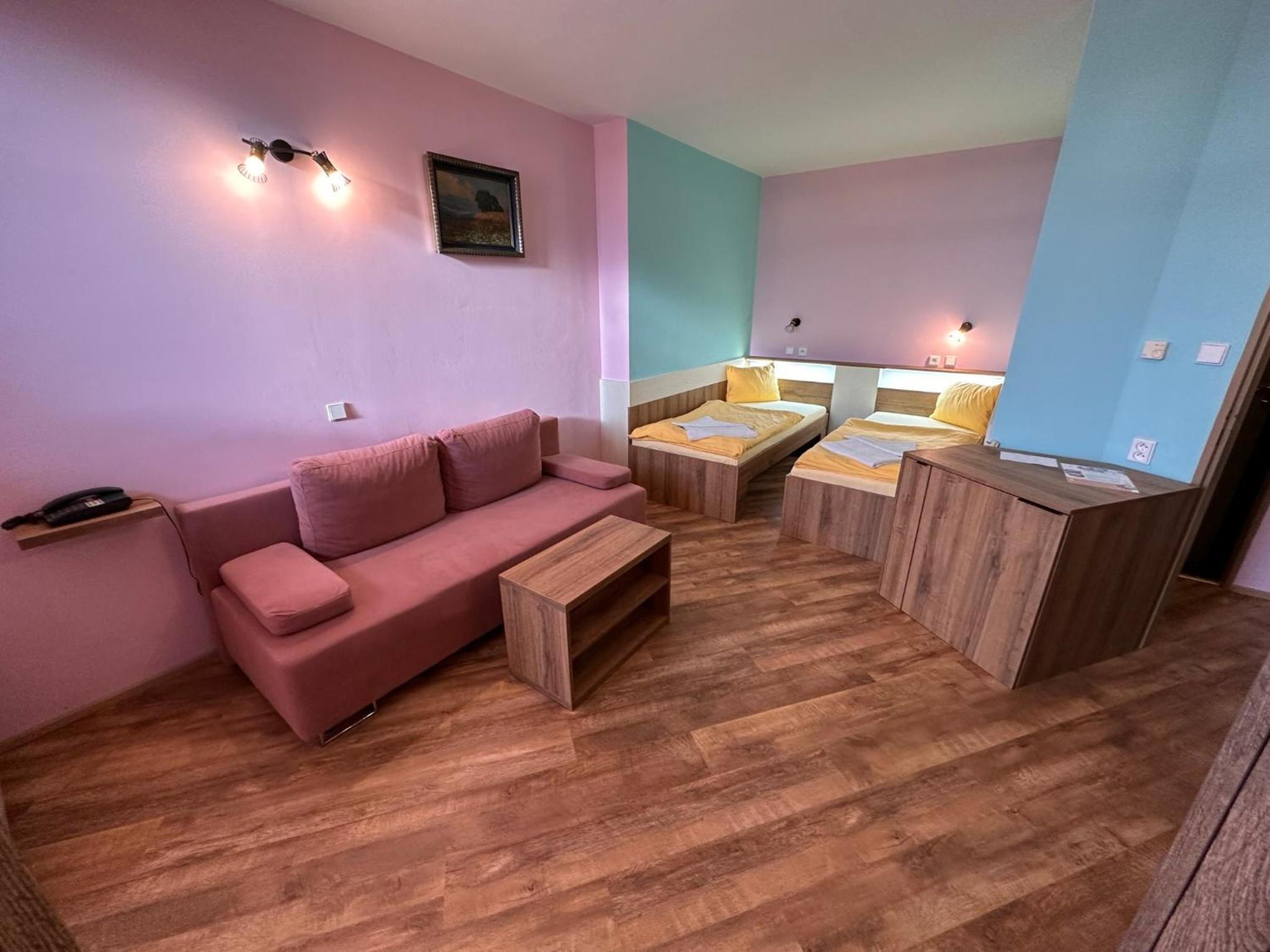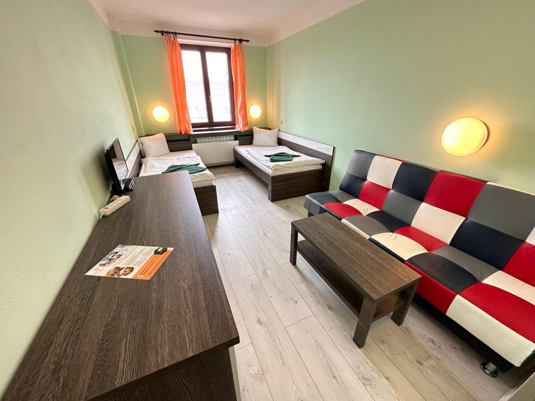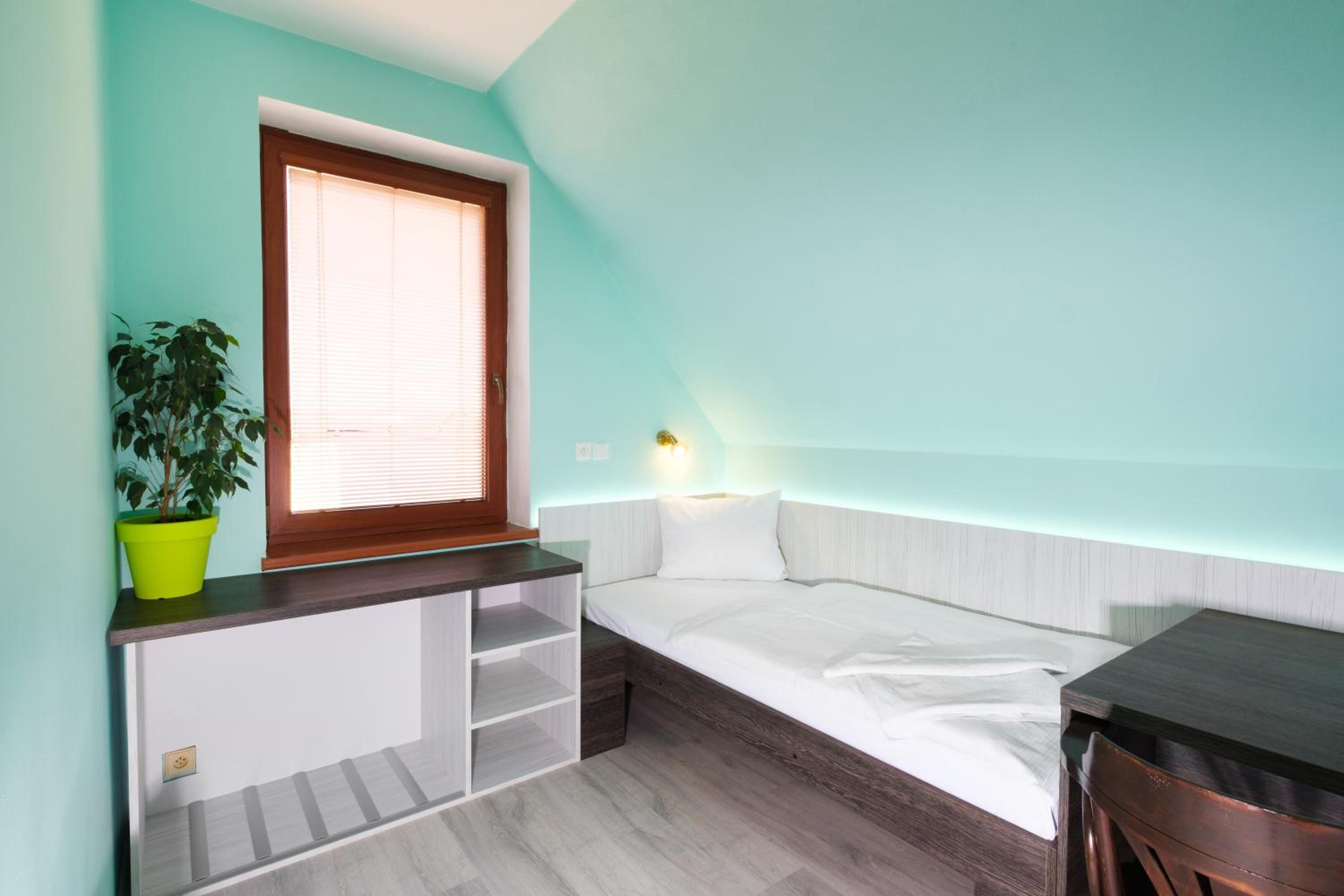 Návrat do 90 let. Nevhodné barevné kombinace a vrzání podlahy. Snídaně rohlík a zbytek šunky. Žádný výběr