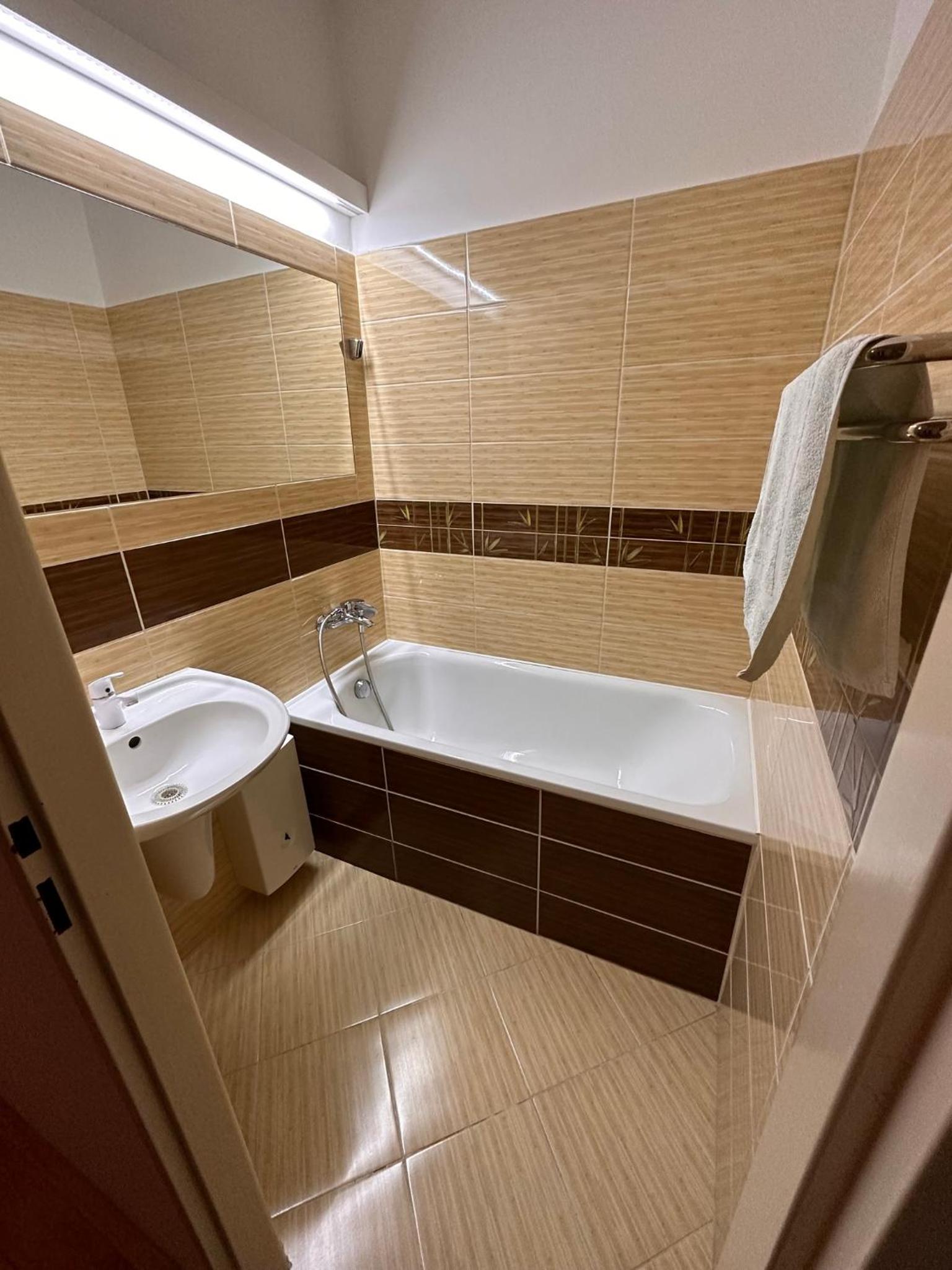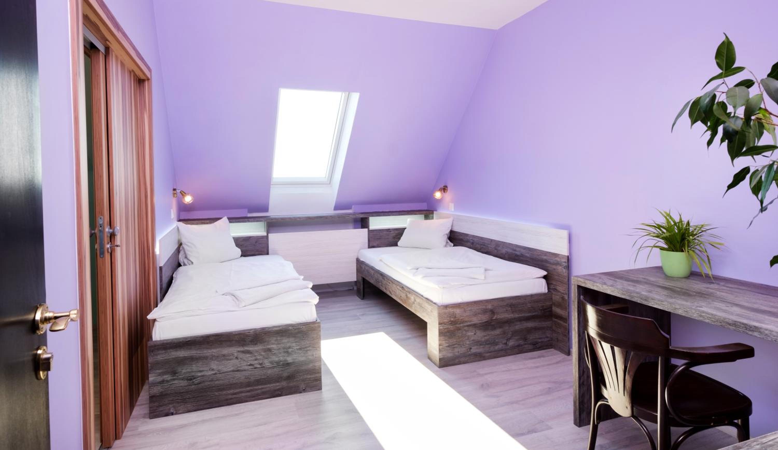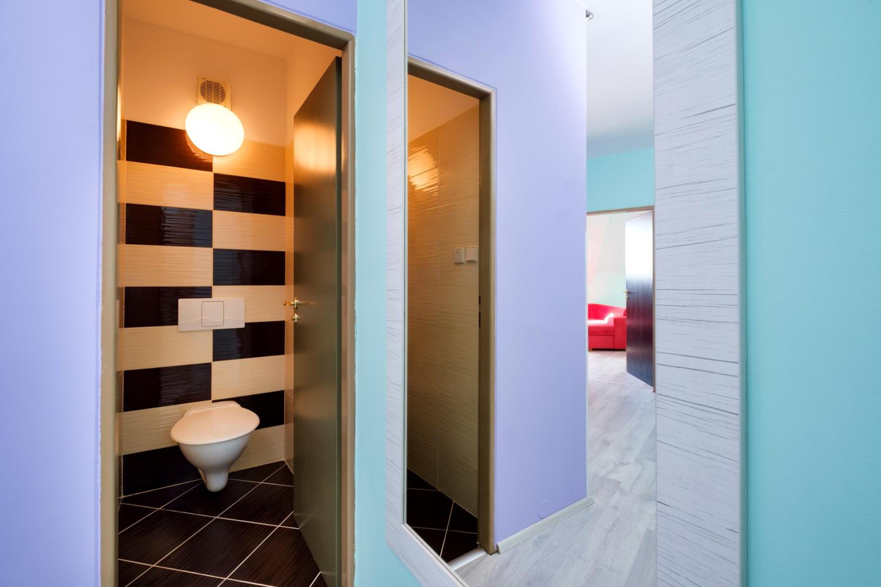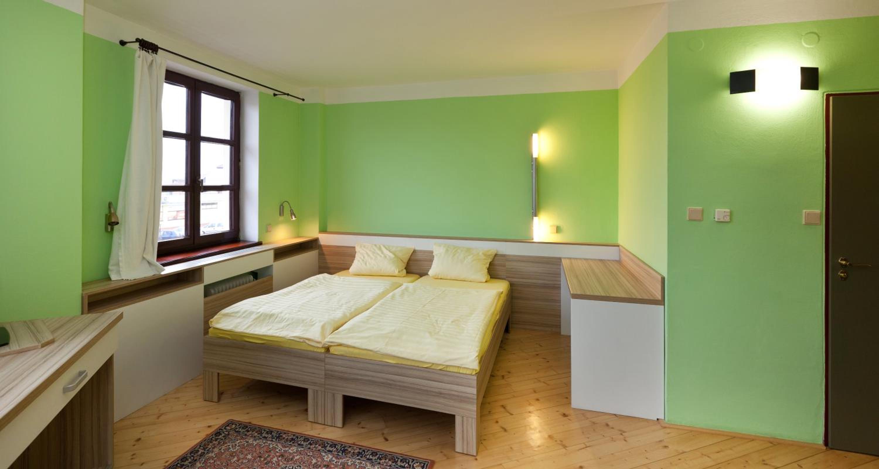 Návrat do 90 let. Nevhodné barevné kombinace a vrzání podlahy. Snídaně rohlík a zbytek šunky. Žádný výběr