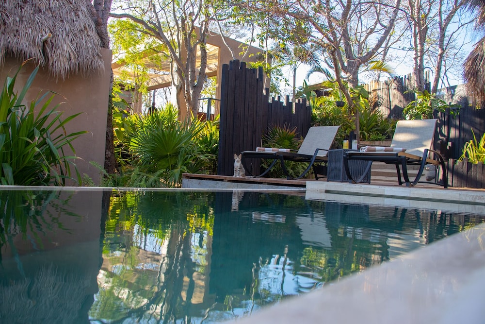 La cabaña cuenta con cama King Size, cafetera, un frigobar, A/C, ventilador, una pequeña terraza con una hamaca y una pequeña alberca fabulosa; el baño con un jardín interno y la ducha sin techo te hace sentirte en la jungla.