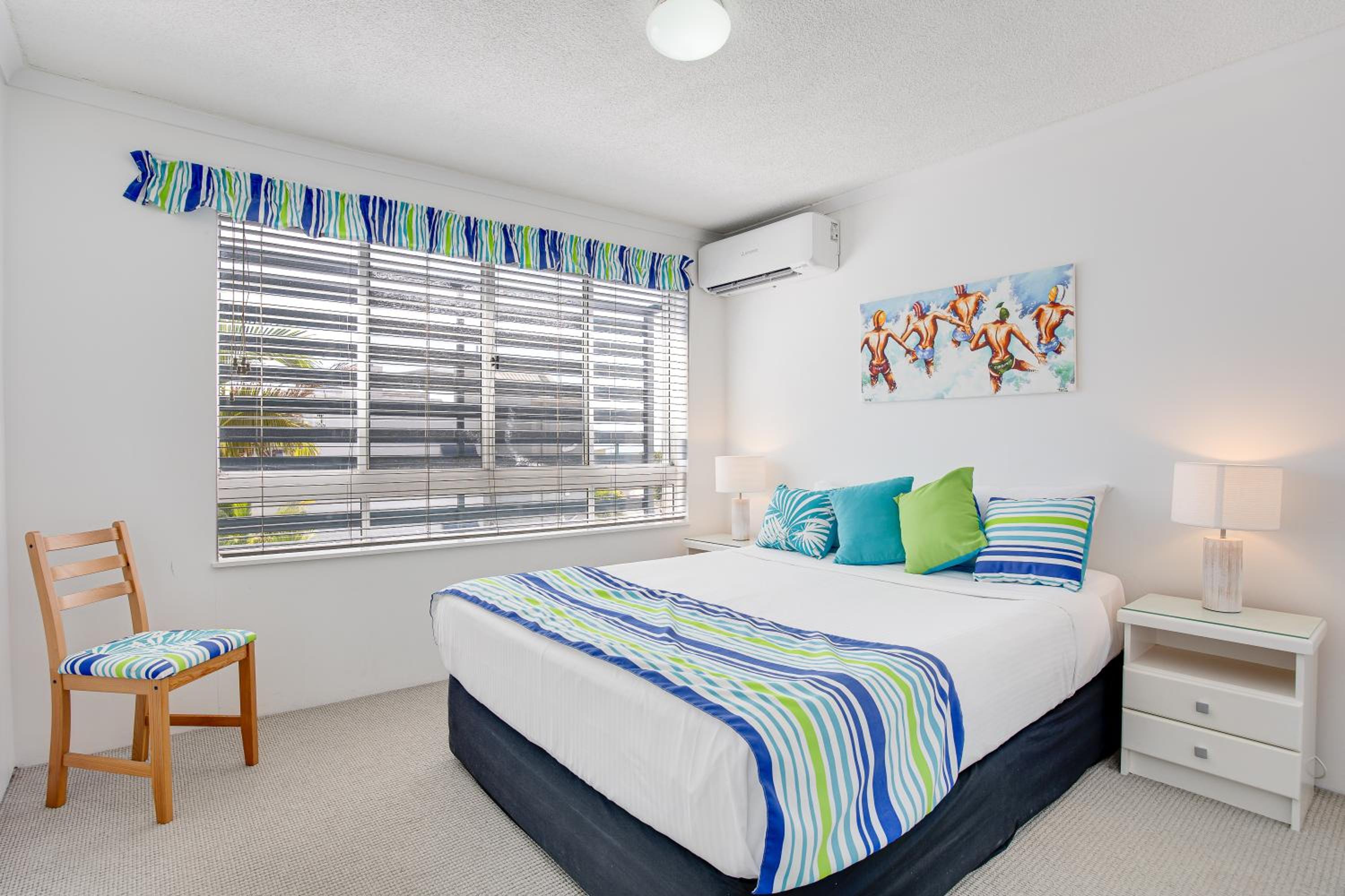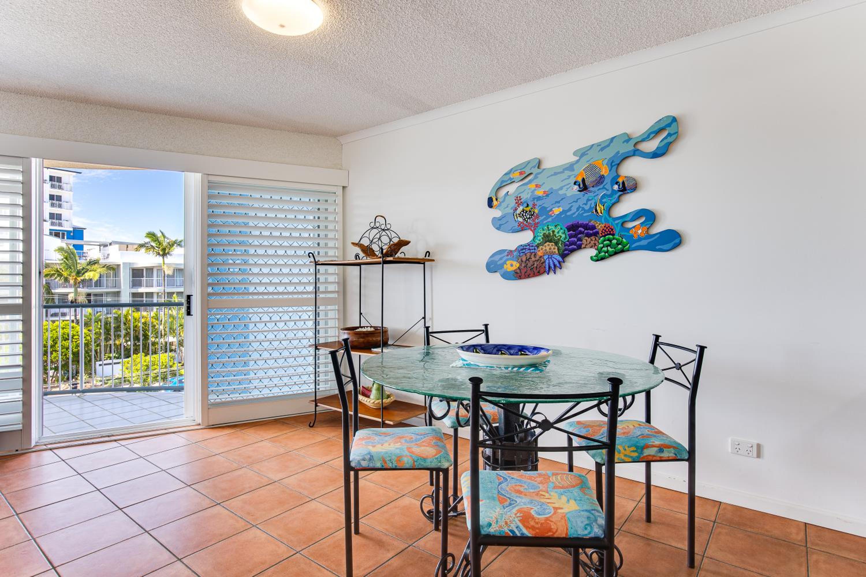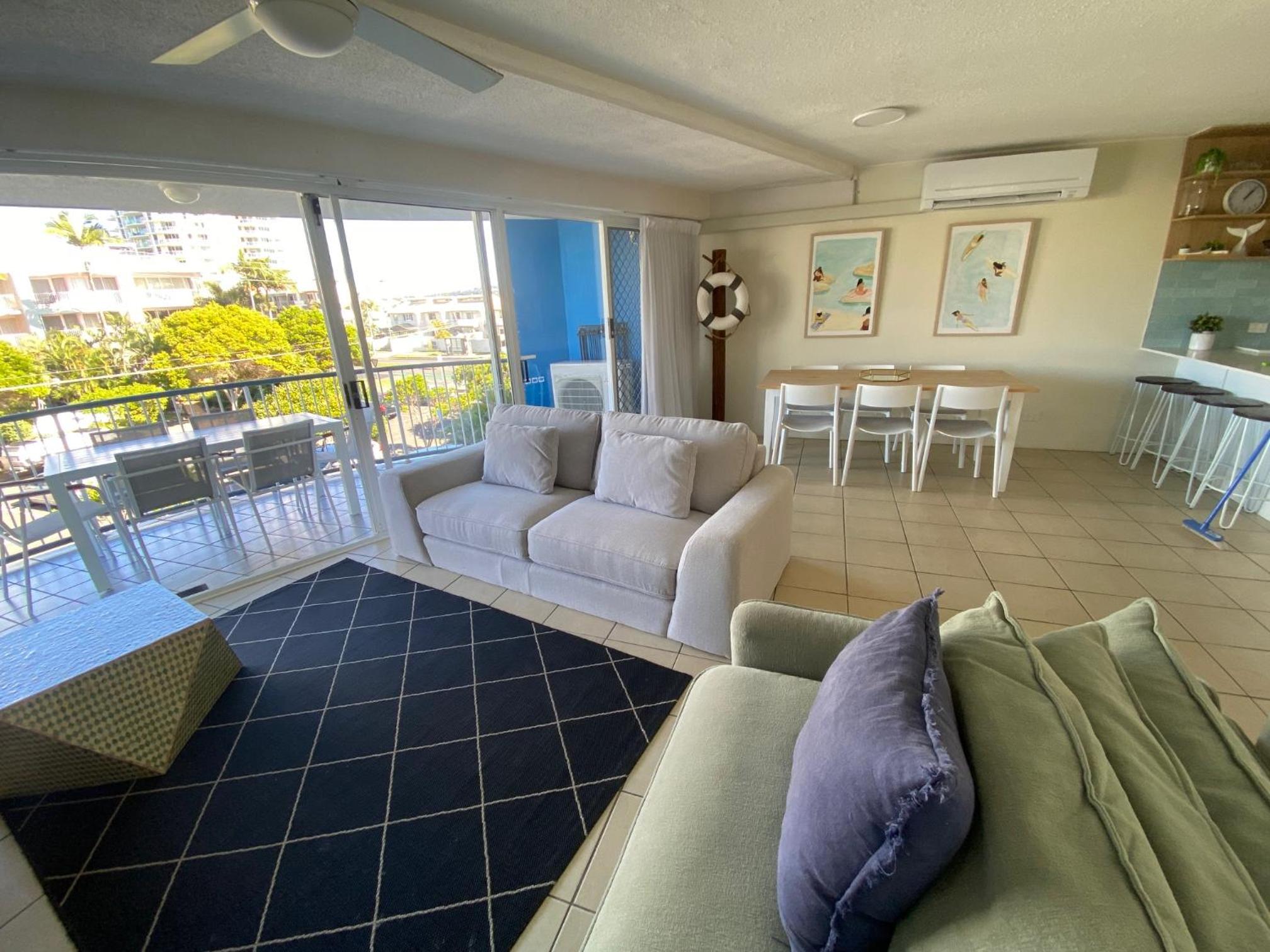 Right near the beach, the surf club and the bowls club. Saw the Mooloolba fireworks from the beach. Great little cafe across the road. Lots of parking on the road in front. Ceiling fans in all the bedrooms. Air-conditioning in lounge. Fully equipped kitchen with dish washer.
