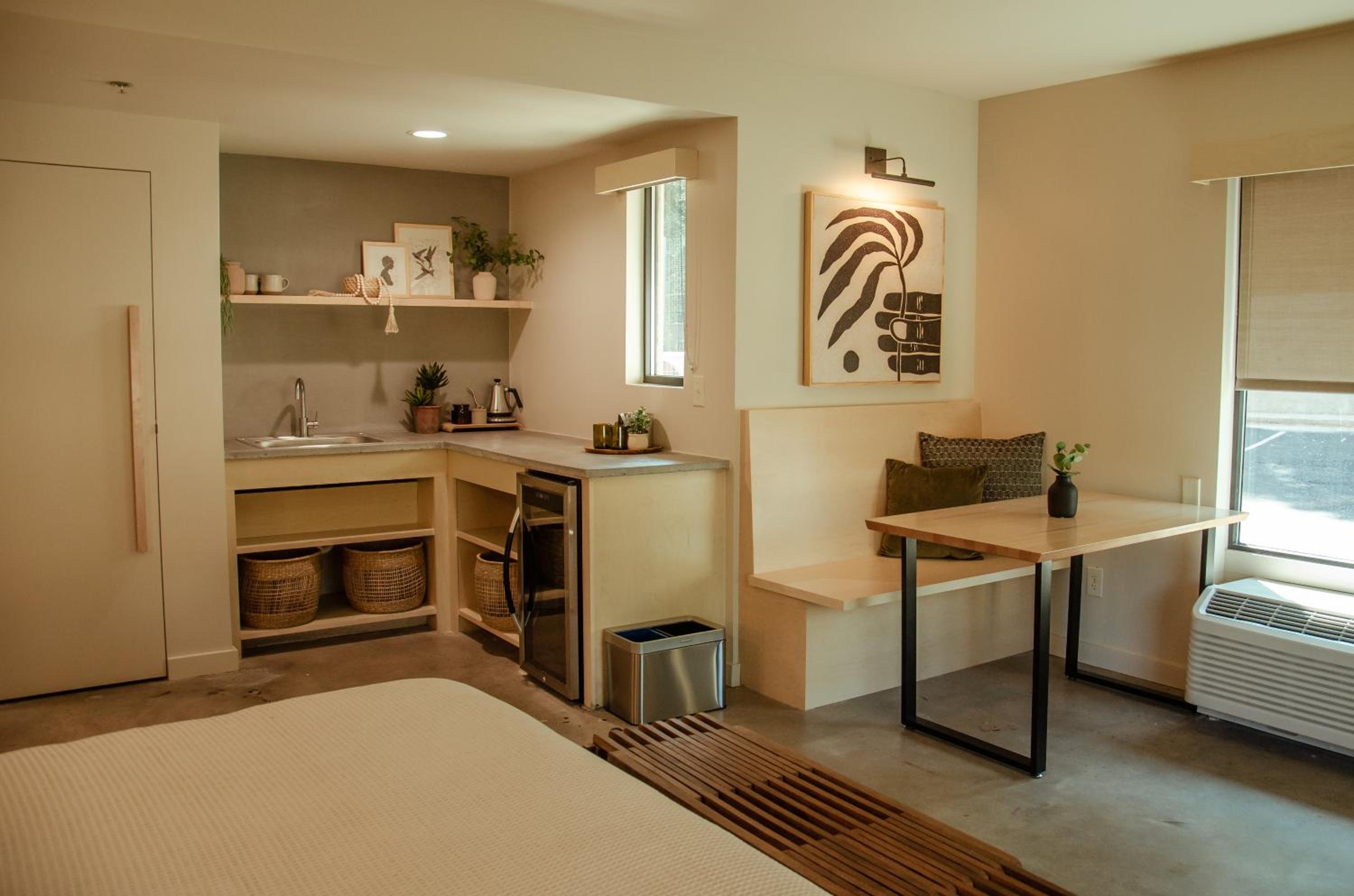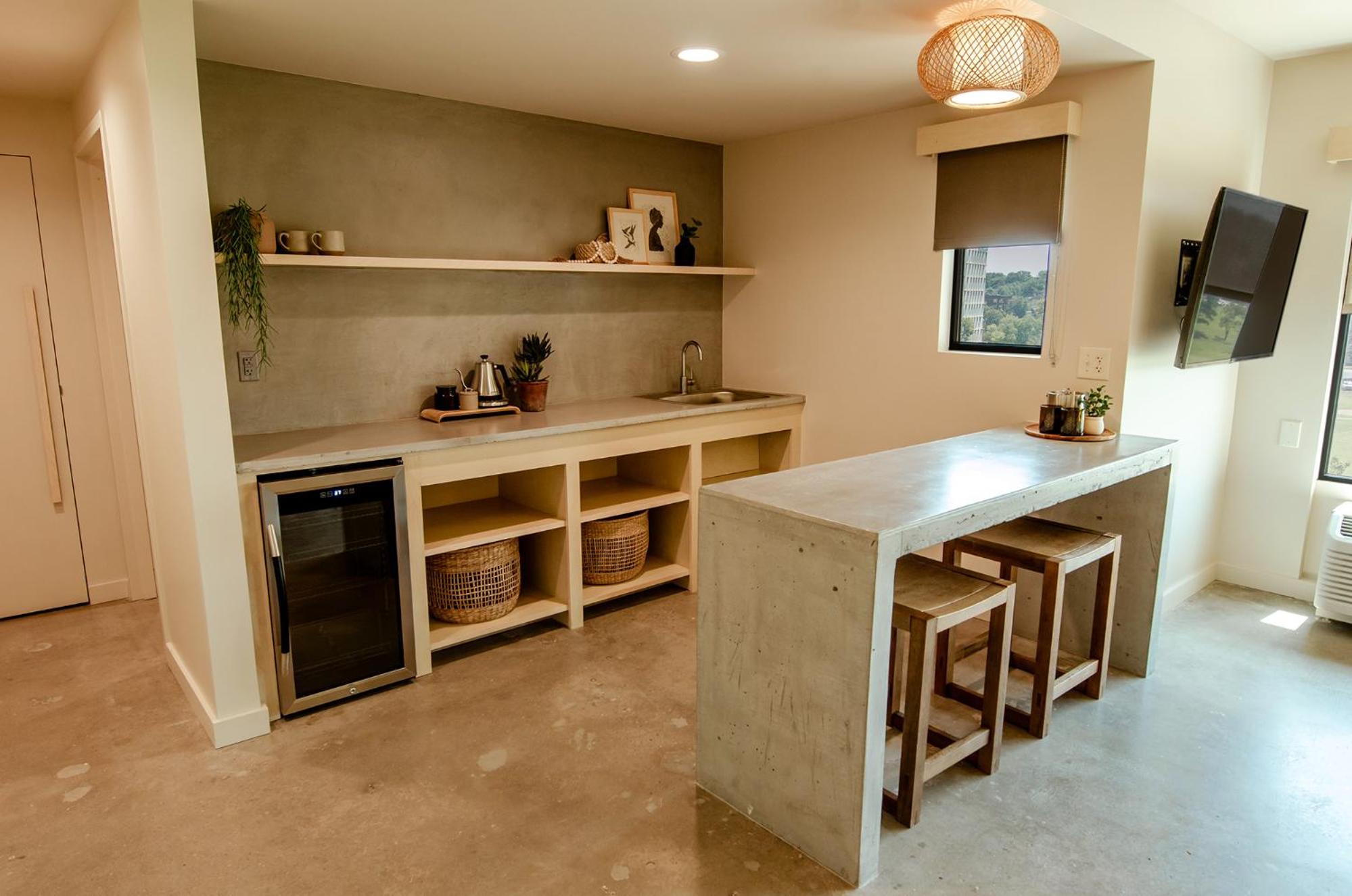 Room was very minimalist. Floors you can tell had carpet at one time, but were tore out sanded down with spots of glue still there for effect! The only table in the room was about to collapse. Concrete counters were cool, and I get what they were going for. We’ve stayed in some Asian hotels that do this much better. Sorry you missed the mark. No fridge except for the locked pay fridge, that you have to contact the front desk to have unlocked. That would have been a great conversation when we checked in. So we had to throw out our leftovers. No