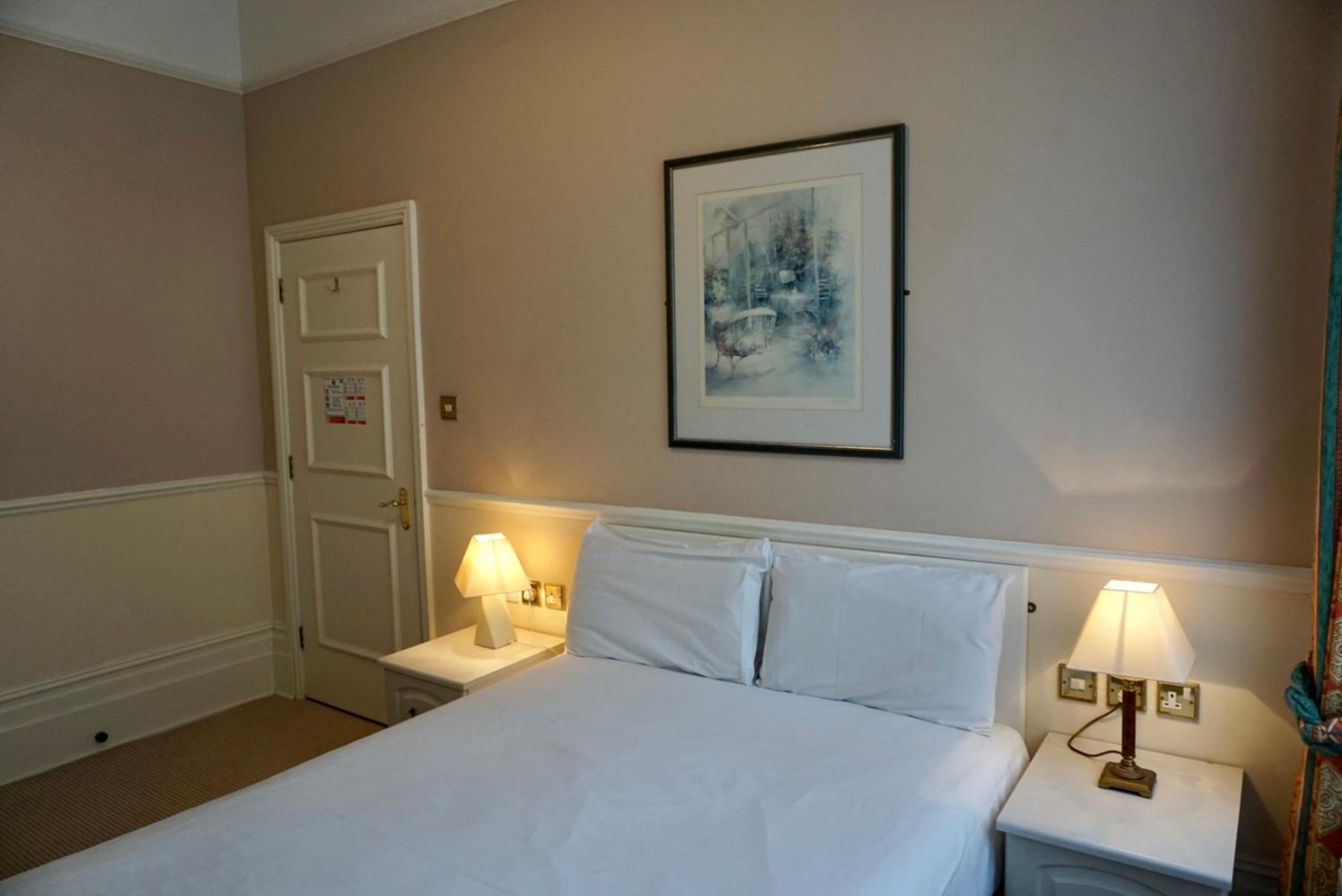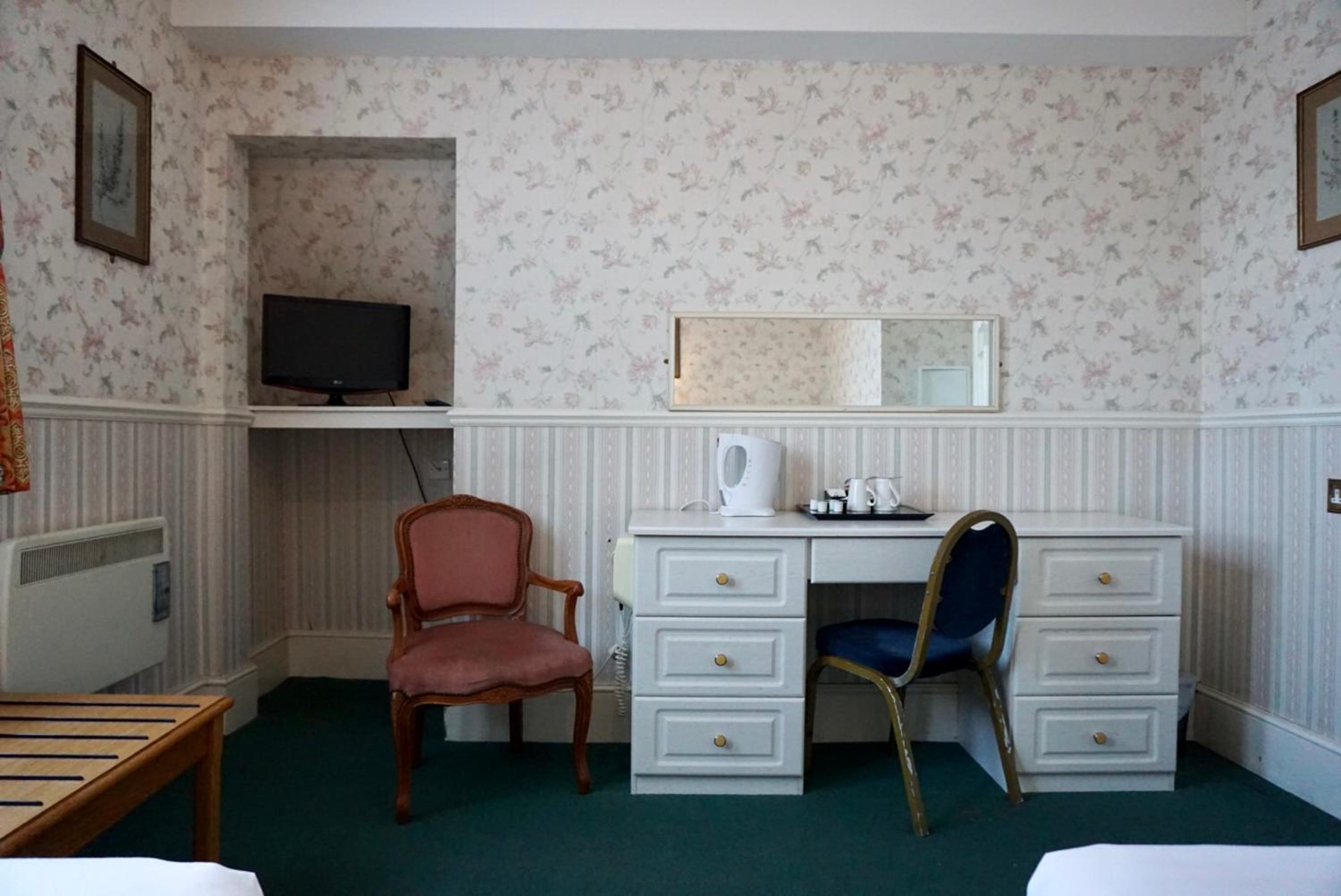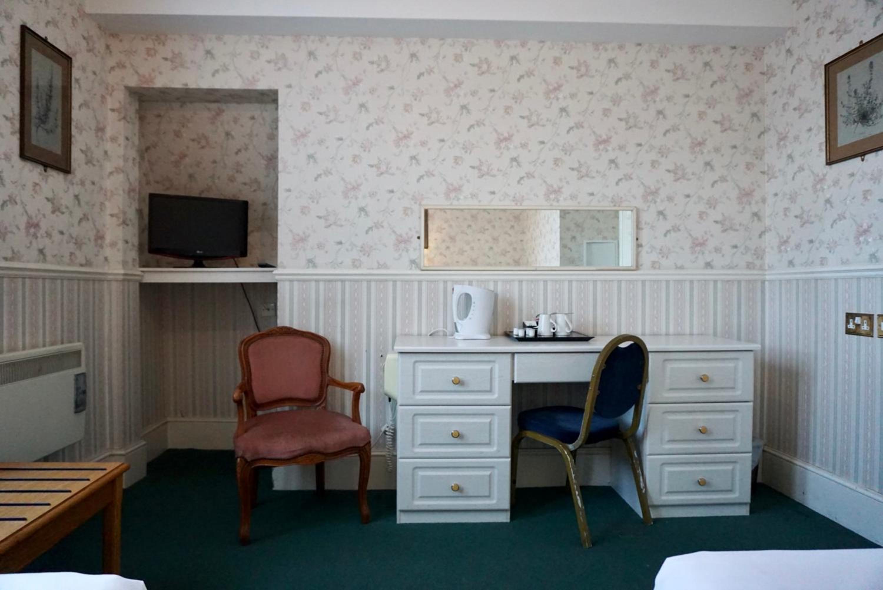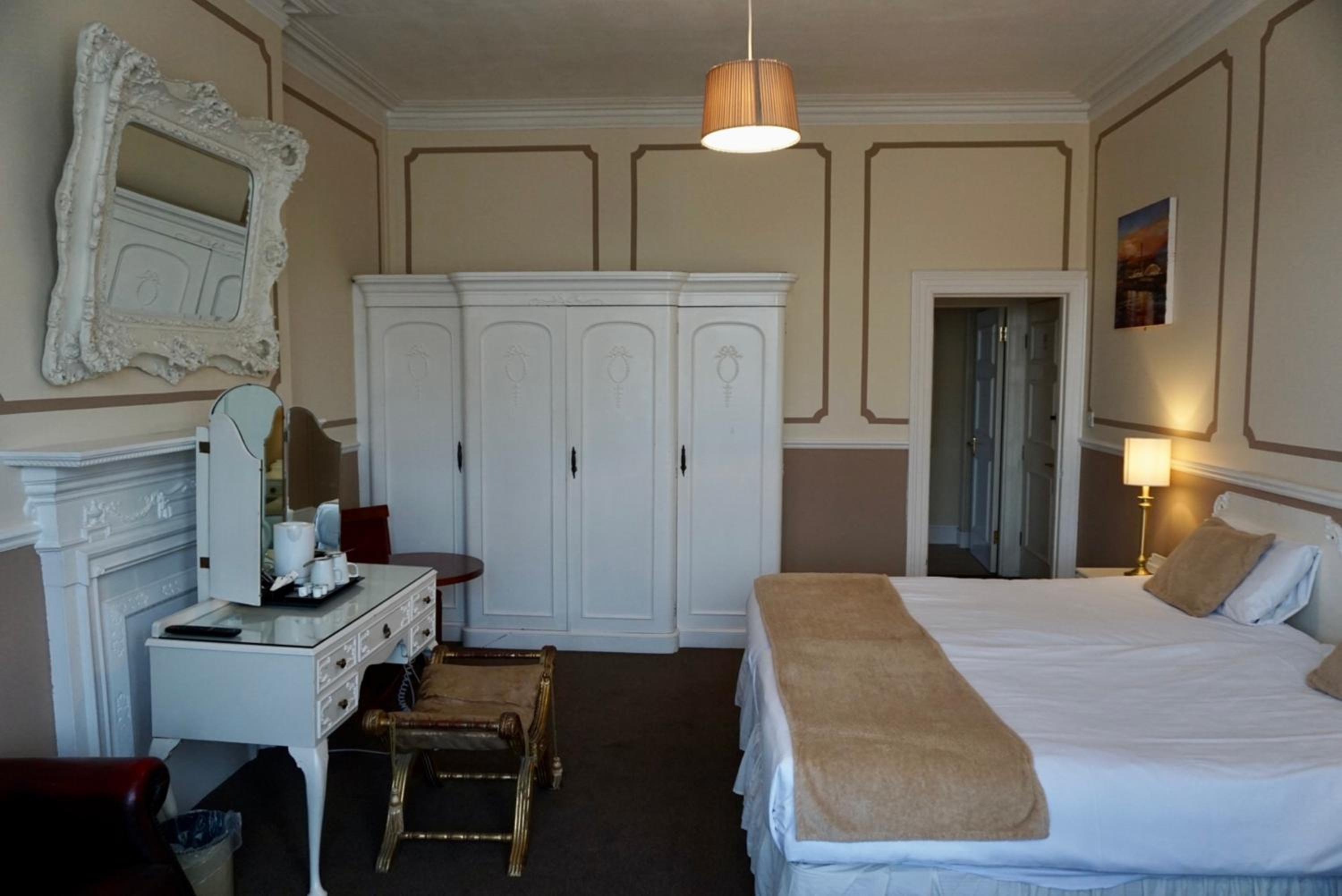 Dated and scruffy furniture, carpet and bathroom. An unpleasant smell in the room which I think came from old cloth surrounding the 4 poster bed. The worst mattress we have encountered, so painful were the springs that we slept on top of the duvet to protect ourselves. Heat in the bathroom was stifling as towel radiator would not turn off. Virtually no water from cold water tap in basin. Amusingly we were upgraded to this room which was the bridal suite, other rooms may be better.