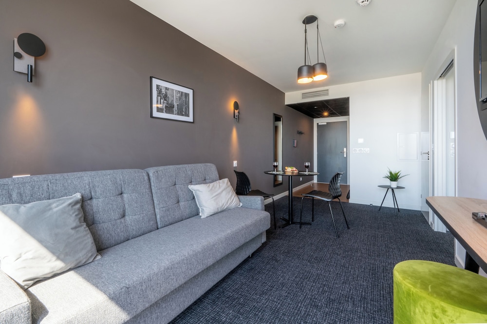 Apparthotel sympathique en bordure de l'aéroport,logés au 2e étage le bruit des vols est bien supportable,literie correcte sans plus,