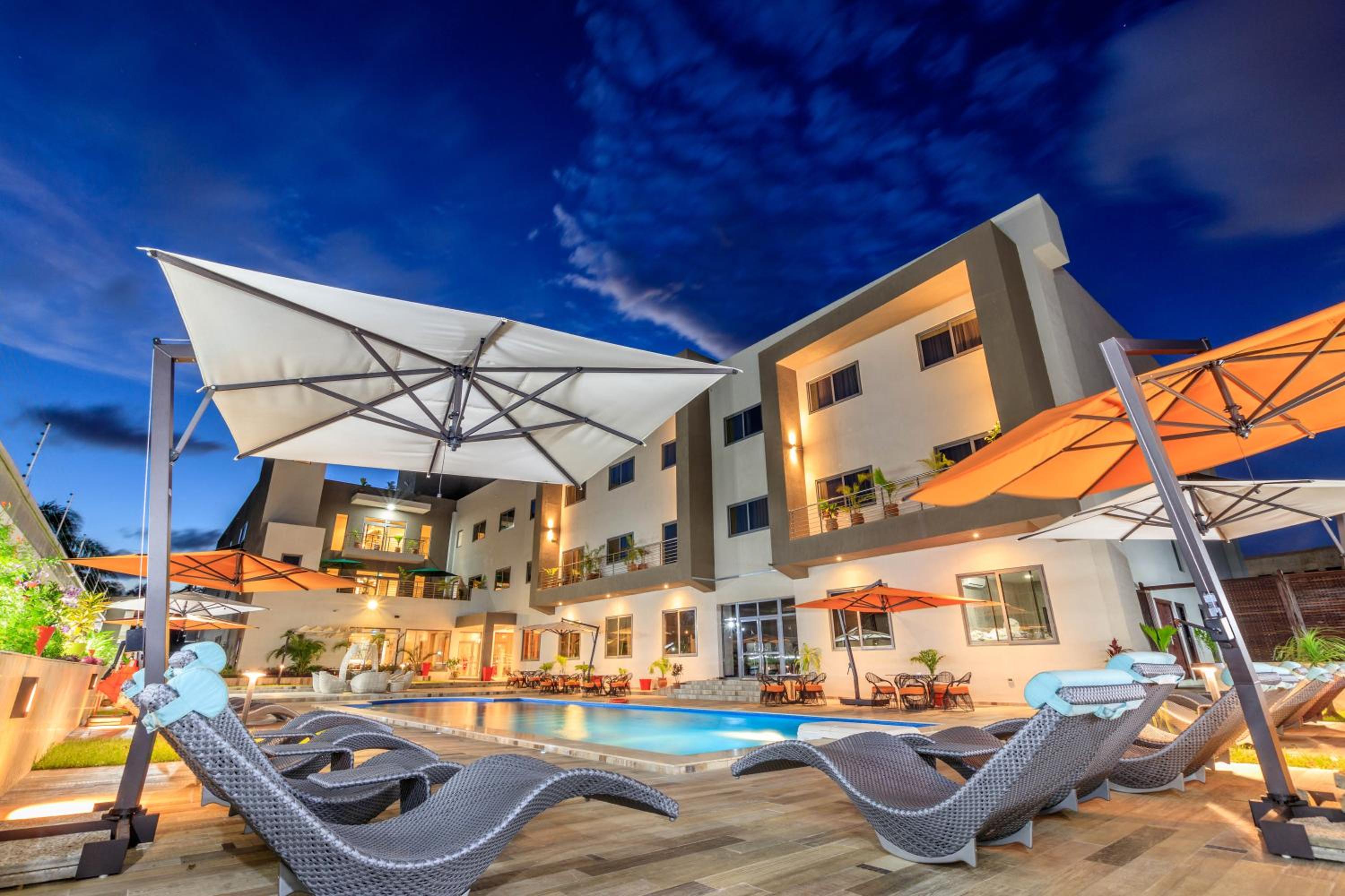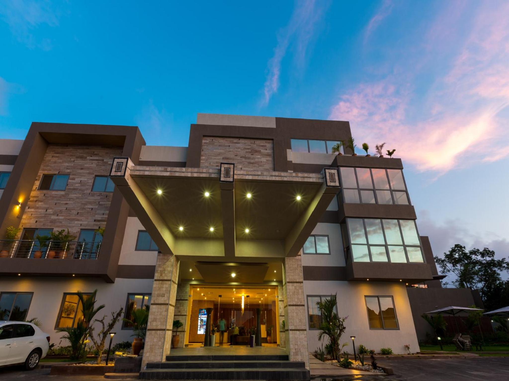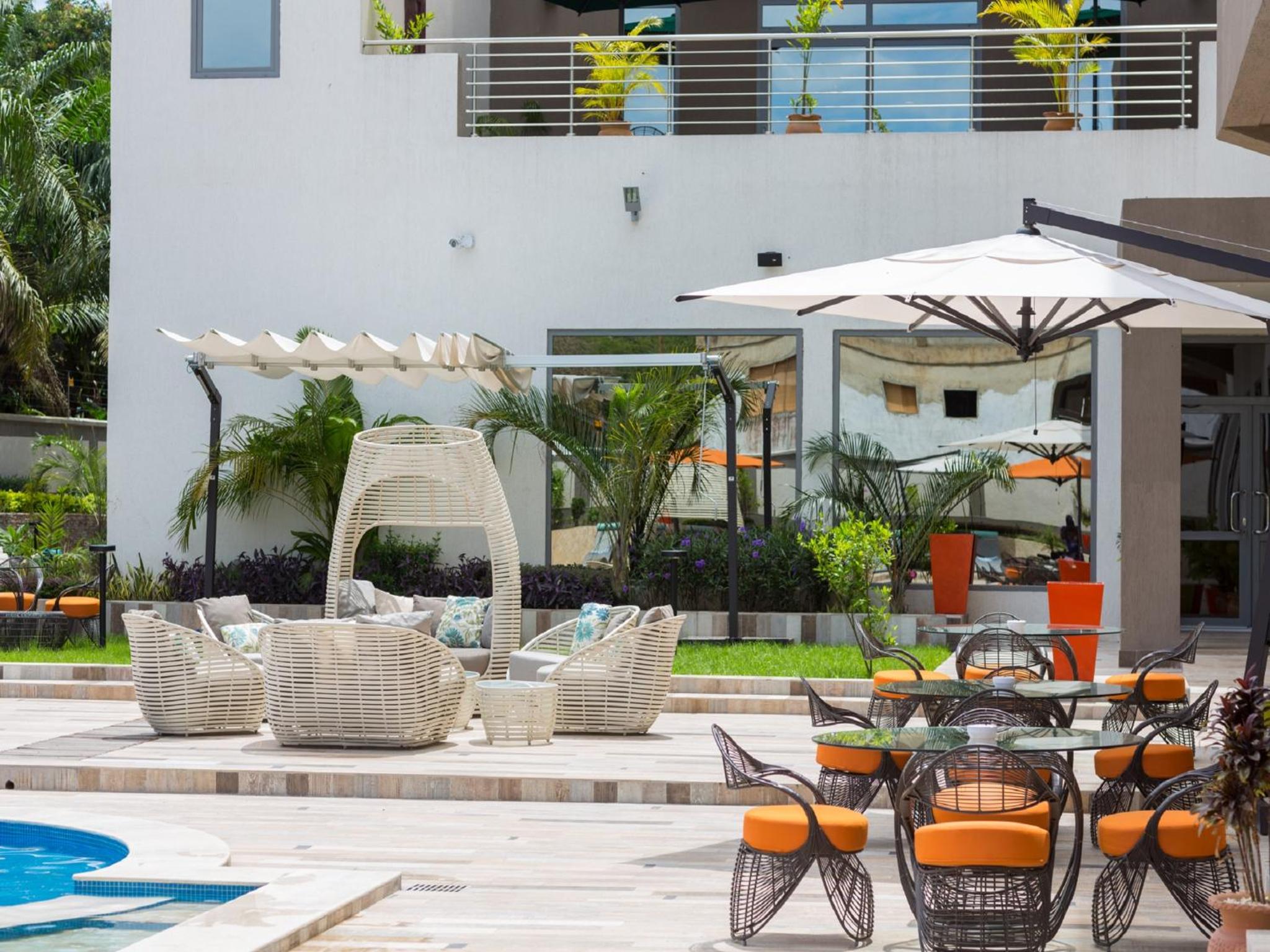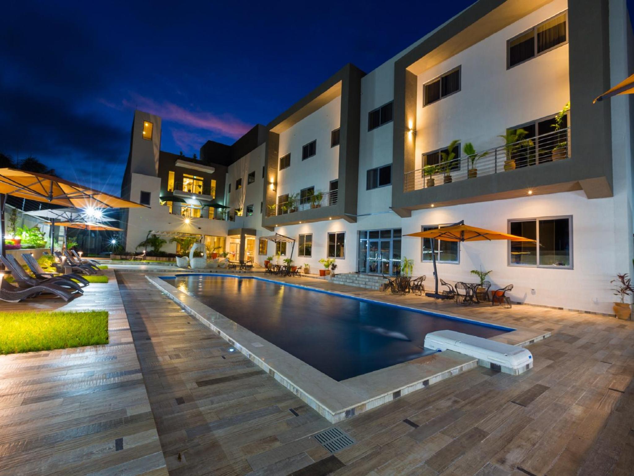 The Palms by Eagles in Takoradi offers a blend of comfort and style with free WiFi, an outdoor pool, and a fitness center. The rooms are elegantly furnished with modern amenities like flat-screen TVs, kitchenettes, and private bathrooms.