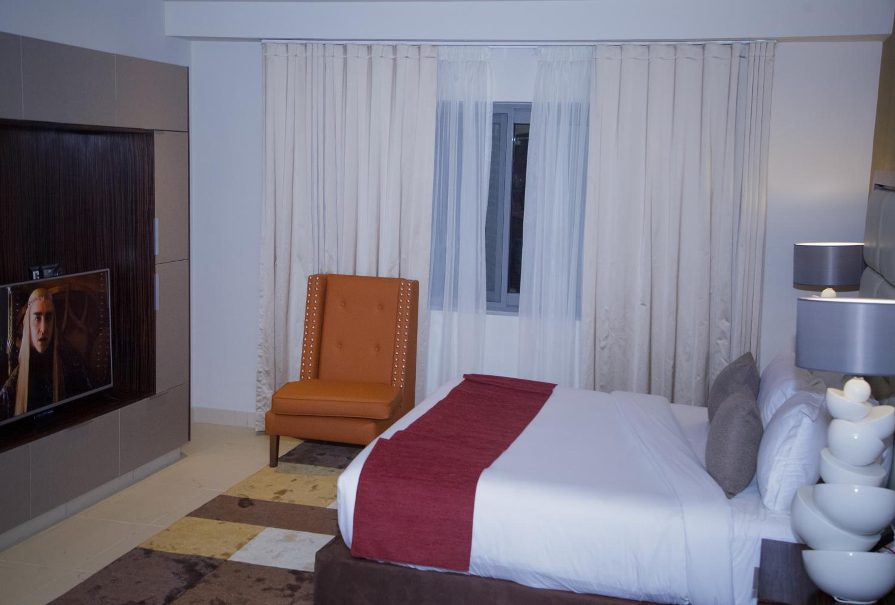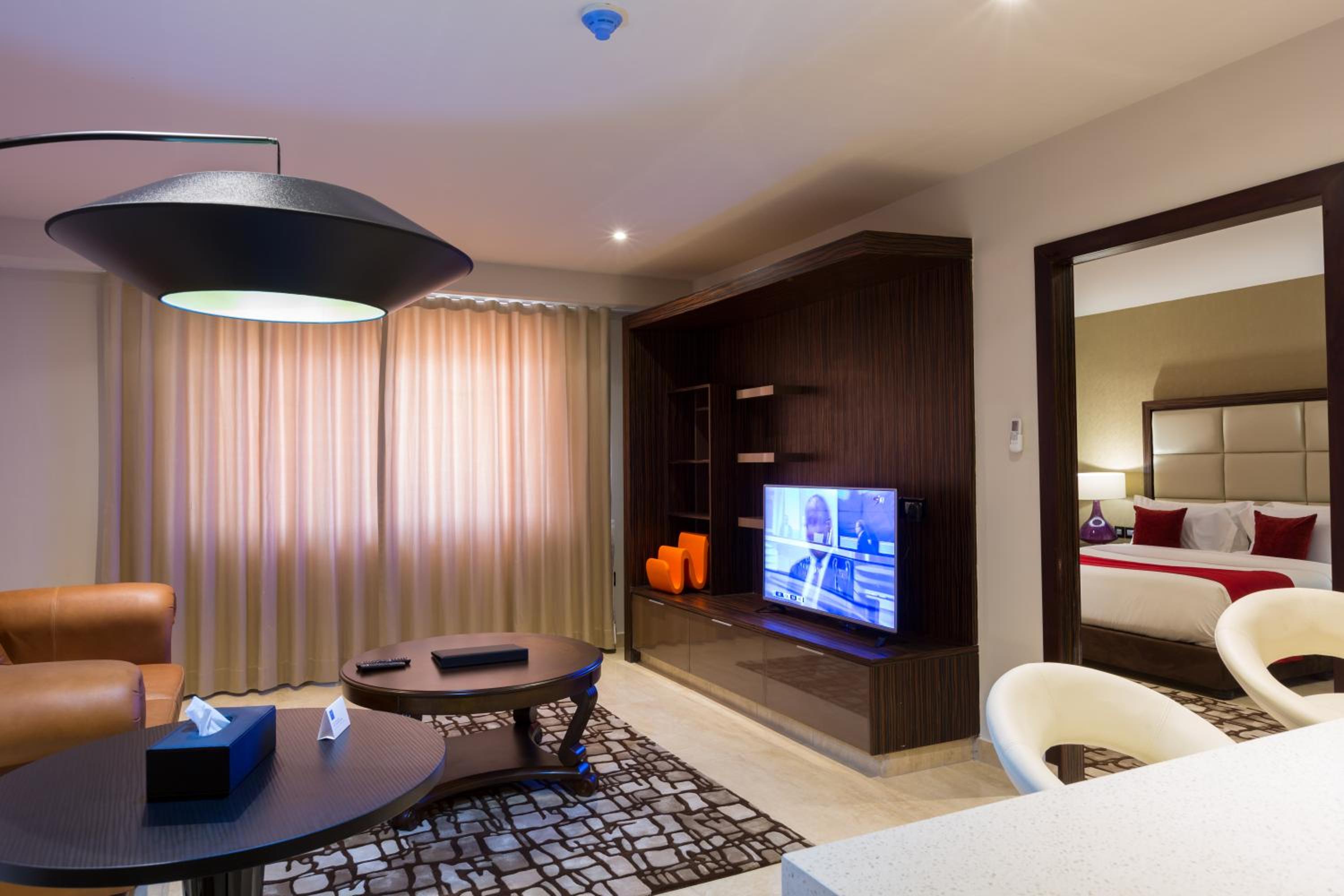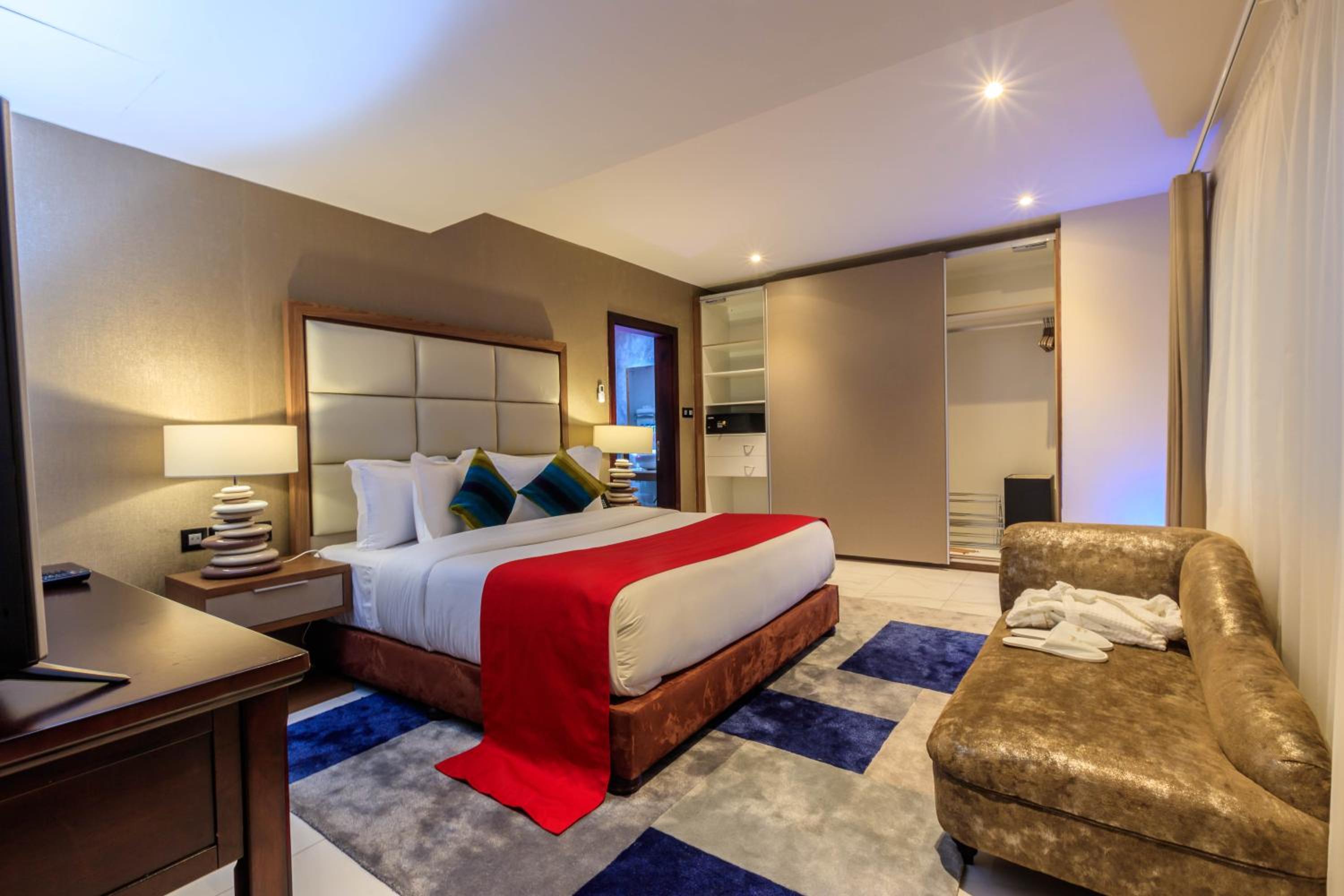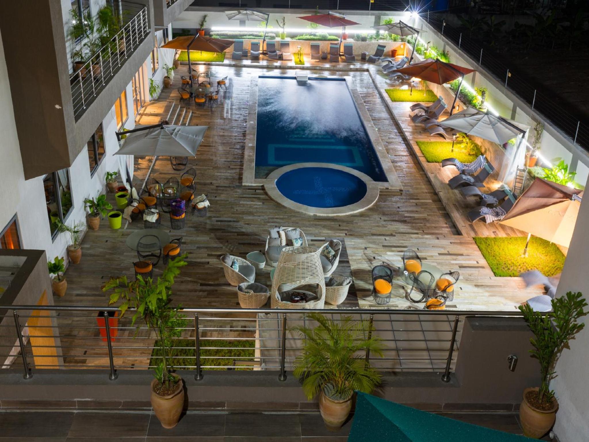 The Palms by Eagles in Takoradi offers a blend of comfort and style with free WiFi, an outdoor pool, and a fitness center. The rooms are elegantly furnished with modern amenities like flat-screen TVs, kitchenettes, and private bathrooms.