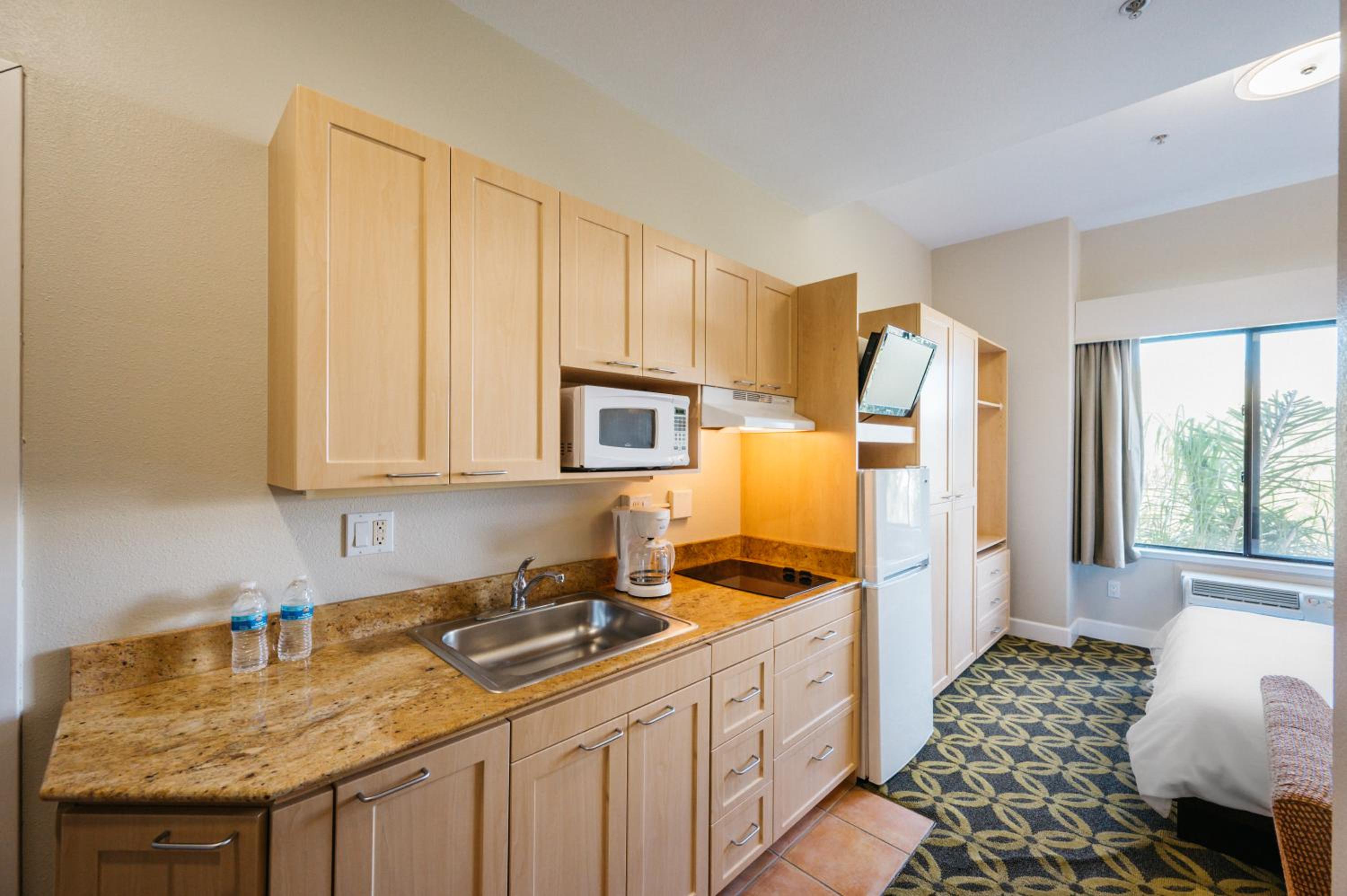 Our room was nice and clean. The bed was comfy. The shower was great. This is an all-suite hotel, so we really enjoyed being able to cook and live like at home. We managed to save over $400 a week from food. We had a cooktop, bowls, plates, and many other kitchen utensils in the room. The place provided coffee and hot water 24/7 (BIG THANK YOU!!!). The facility has two laundry rooms, a gym, and a common kitchen area, which opens from 8 AM to 9 PM. Parking was very secure because the gate was closed at all times, and guests could access it by remote control. They charge $10 each day for parking. The surrounding areas were very quiet throughout the day, so we rested very well during our stay. We wished we had known this place earlier!