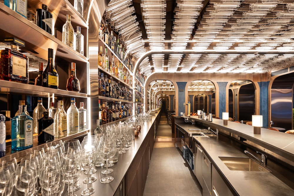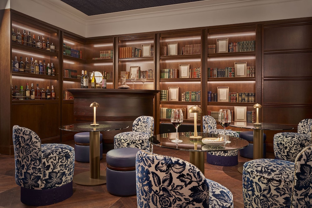 Perhaps the most memorable feature of the hotel is its hidden speakeasy-style lounge — a discreet room concealed behind a bookshelf. Push gently, and you step into a completely different world: dim lighting, velvet textures.