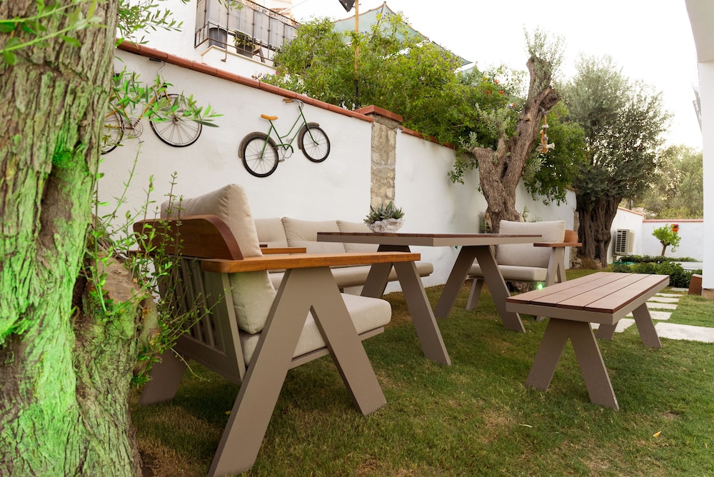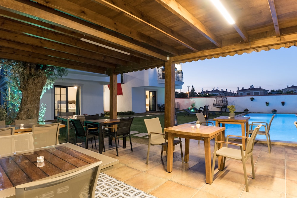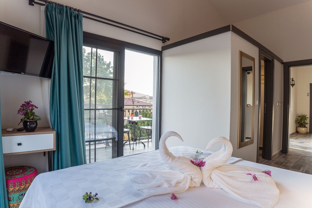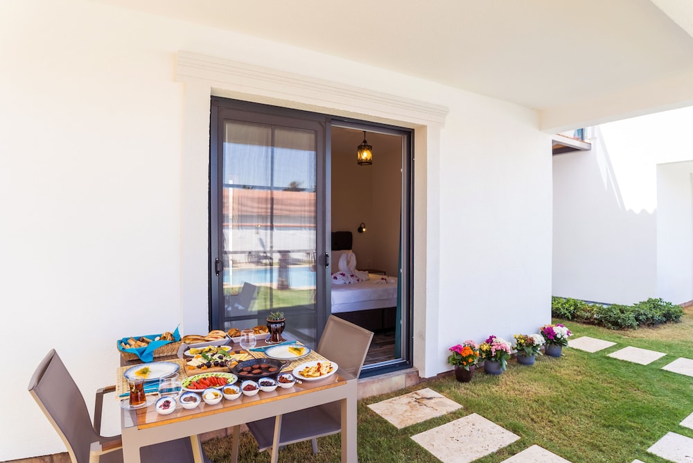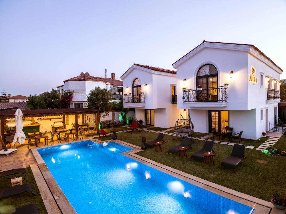 Experience relaxation by the outdoor pool or enjoy the serene garden view at Juliet Alacati.