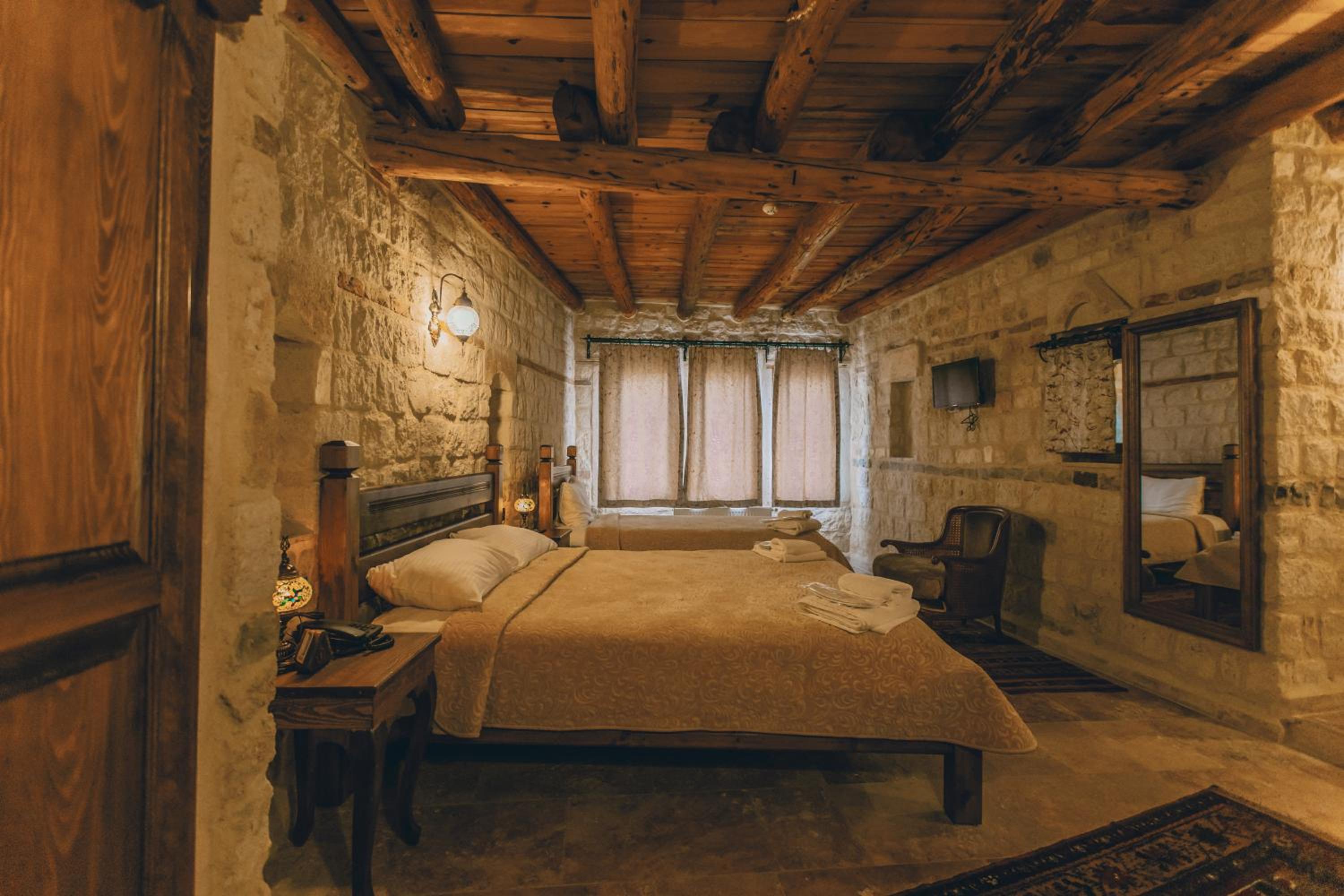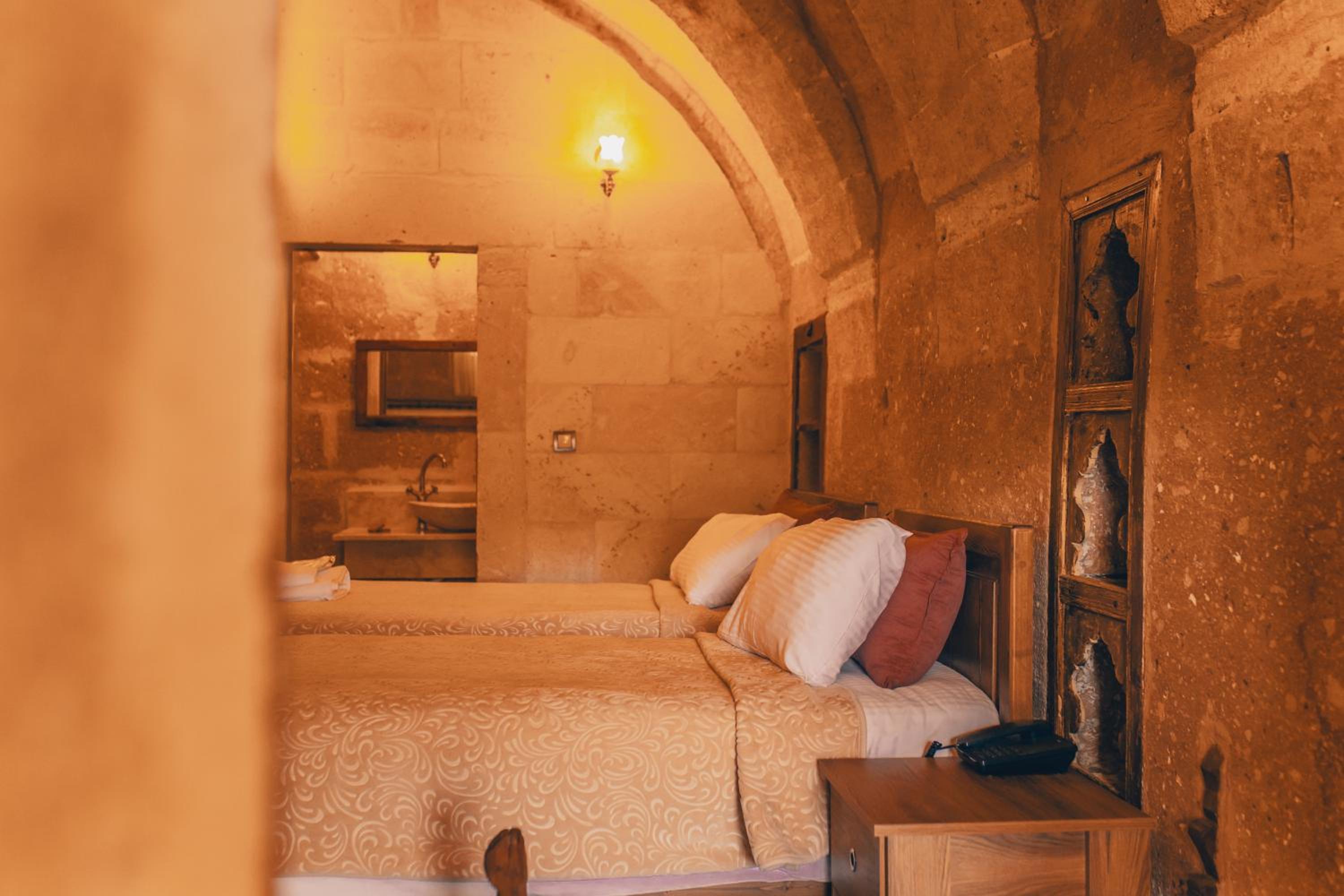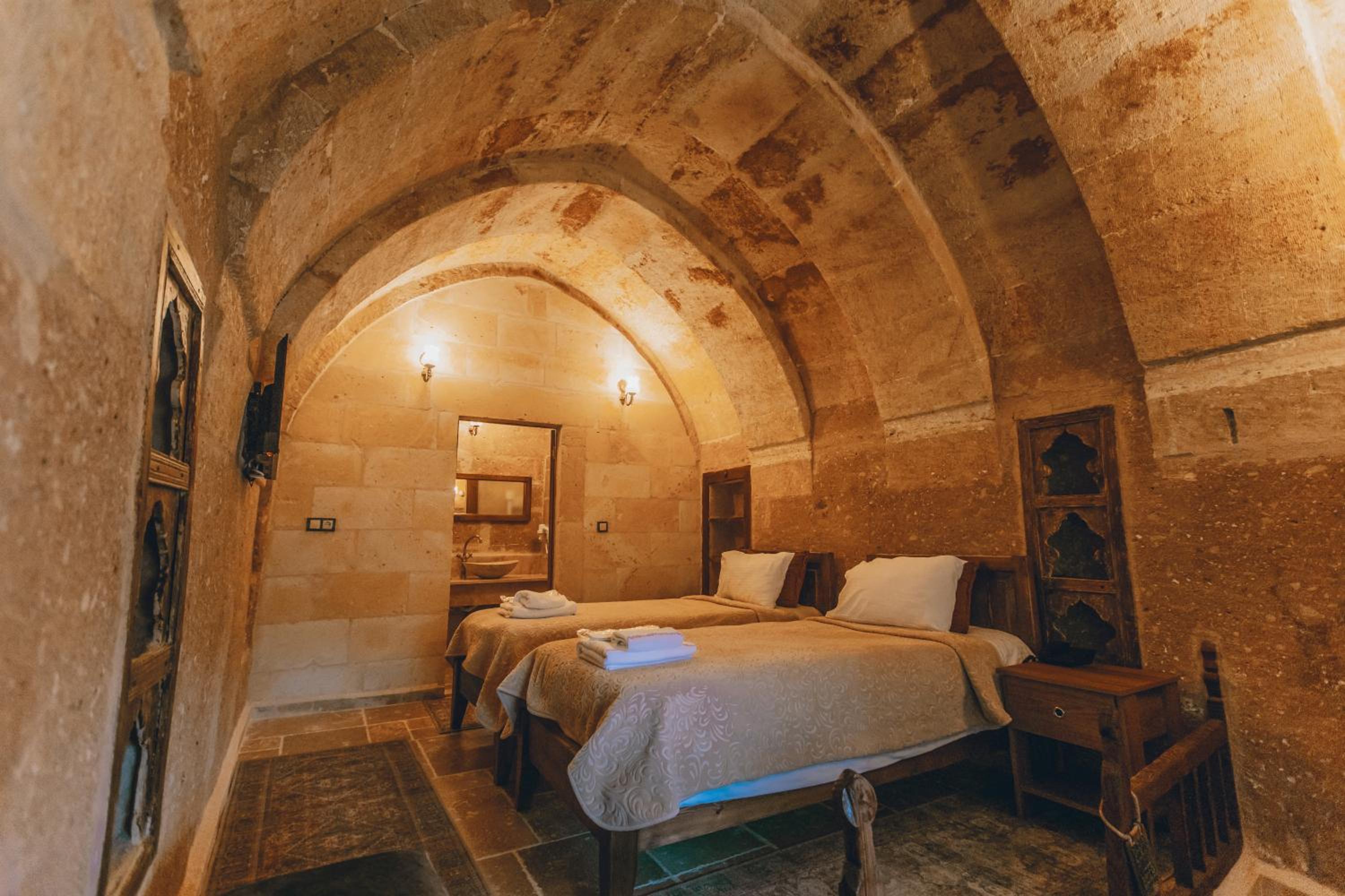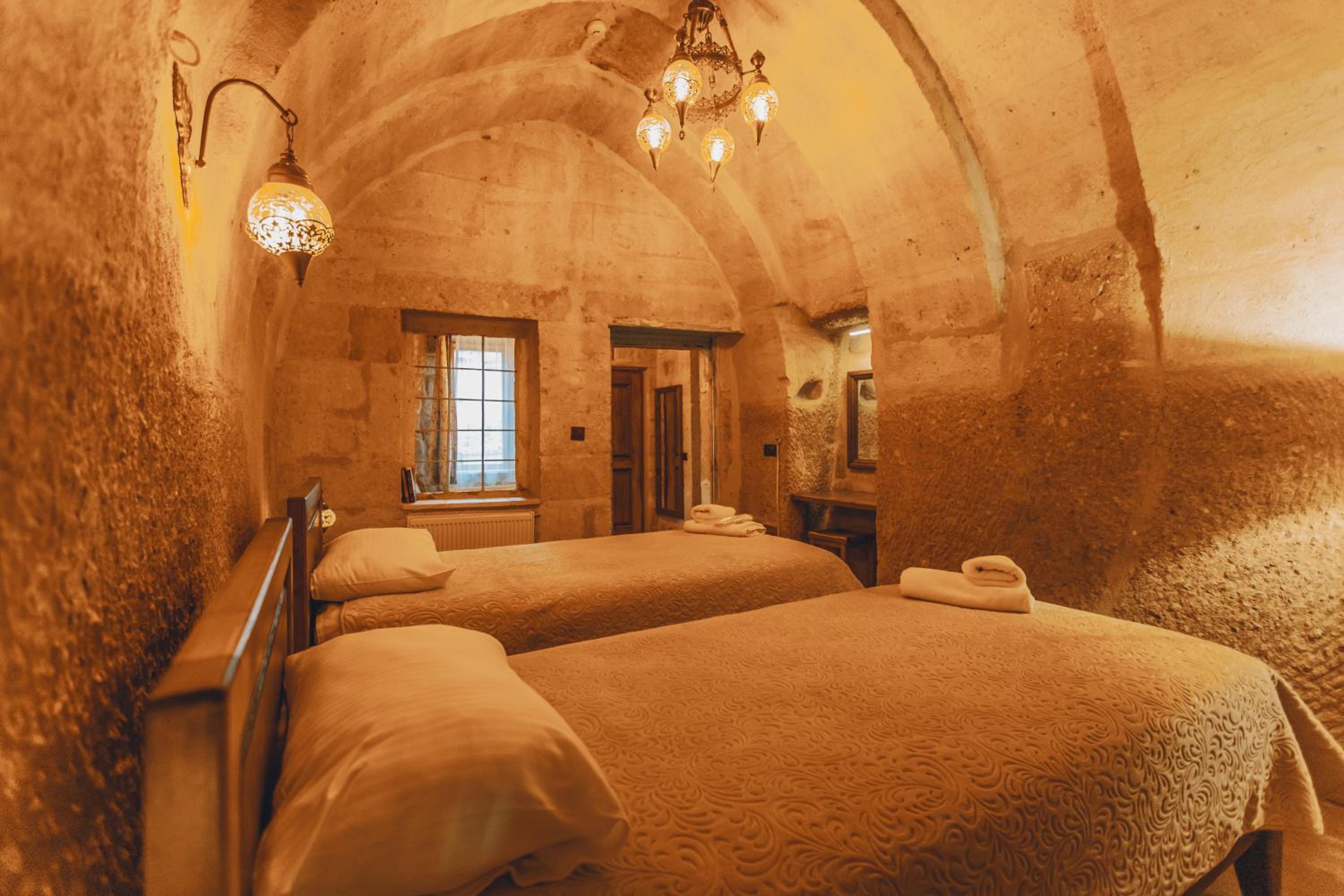 Otel çalışanları çok güler yüzlü ve terasta takla atan güvercinler eşliğinde güzel bir kahvaltı yapabilirsiniz. Biz hamam adlı odada kaldık. En altta dipte tek pencereli ve penceresi bina içine açılan bir odaydı. Oda ışık hiç almıyor, içinde banyo ile beraber bir de hamam var. Gerçek bir mağara deneyimi ancak nefes problemleri yaşayanlar için uygun değil havalanma sıkıntısı var. Bir de oda yerin altında olduğu için baya bir merdiven inip çıkılması gerekiyor. Ancak otelin diğer odaları konum itibariyle ferah ve hizmet güzel.