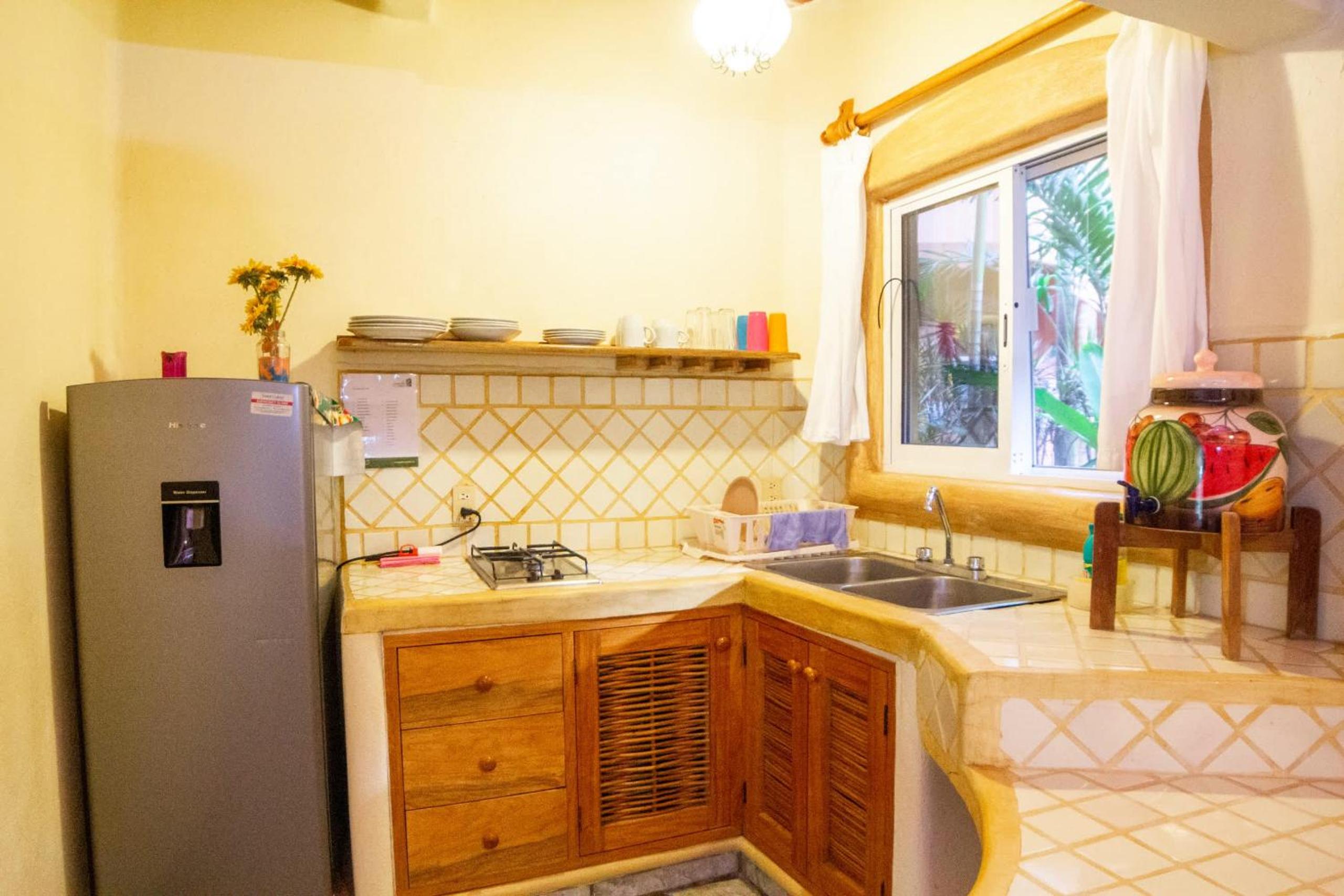 We stayed a week and loved the location, one block from the plaza at the center of town and 3 short blocks from the beach. The bungalows themselves were a little oasis in the bustle that is Sayulita. Once we were through the brightly colored doors, with a smile from the front desk staff, we felt safe and comfortable, the lush tropical foliage a reminder of why we traveled to Mexico. The walls and foliage block out all distractions but the sounds of the village with music often playing until early morning. Fortunately, the rooms are sound proofed and a little white noise from the ceiling fan or a personal device allowed us to sleep soundly. Plus, there is always time for a siesta. The staff was ever present from 9A to 9P with whatever you needed and although most spoke little or very little English, all engaged heartily with whatever Spanglish/hand gestures/translate application efforts we put forth to ensure that our needs were met. Our room (a poolside 2-bedroom) was perfect for our family of 4. It included a full-size fridge (oft used for delicious leftovers), a little gas range and a microwave (unused) for cooking at the room, but the local cuisine was so plentiful, delicious & accessible, we did not prepare any meals for ourselves besides breakfasts.