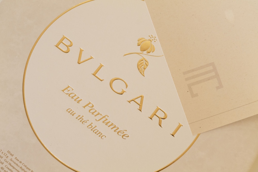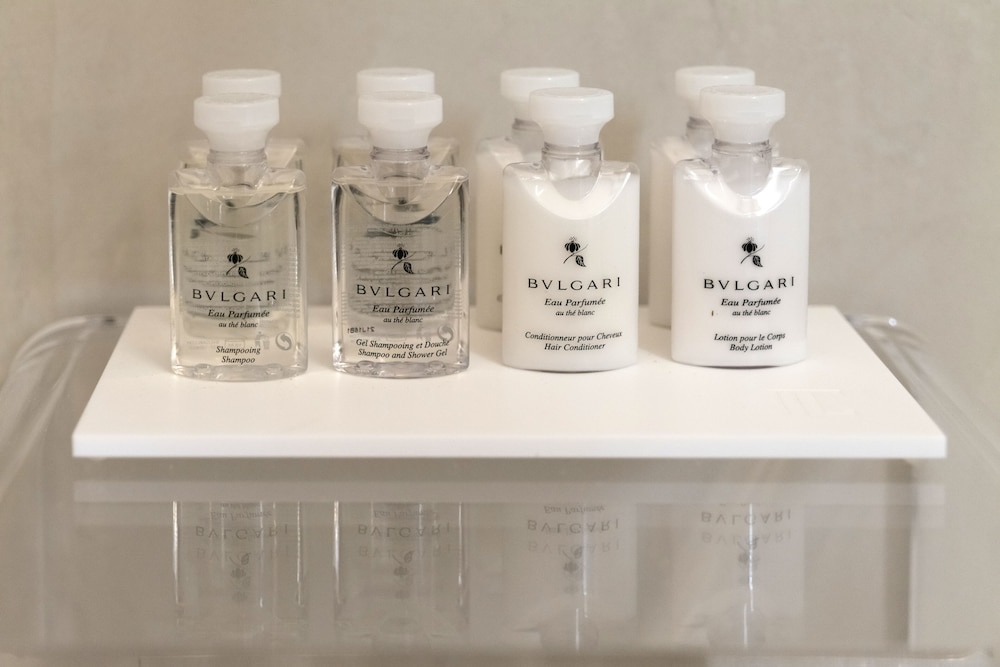 O gel de banho, shampoo e condicionador são da Bulgari, com um perfume muito bom.
