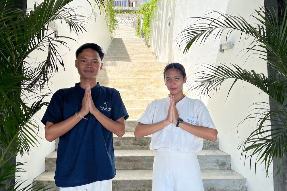 You cannot beat the view of Sea la Vie in Nusa Penida! A beautiful infinity pool where you can see the harbor and sunset. Small swim up bar for convenience and a very kind staff! Our room was clean and so nice with a great little balcony. Be prepared for LOTS OF STAIRS. Air conditioning was legit.
