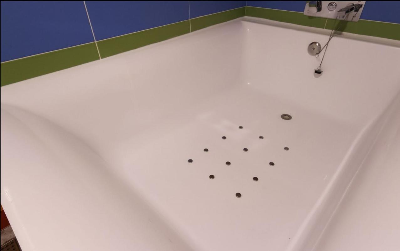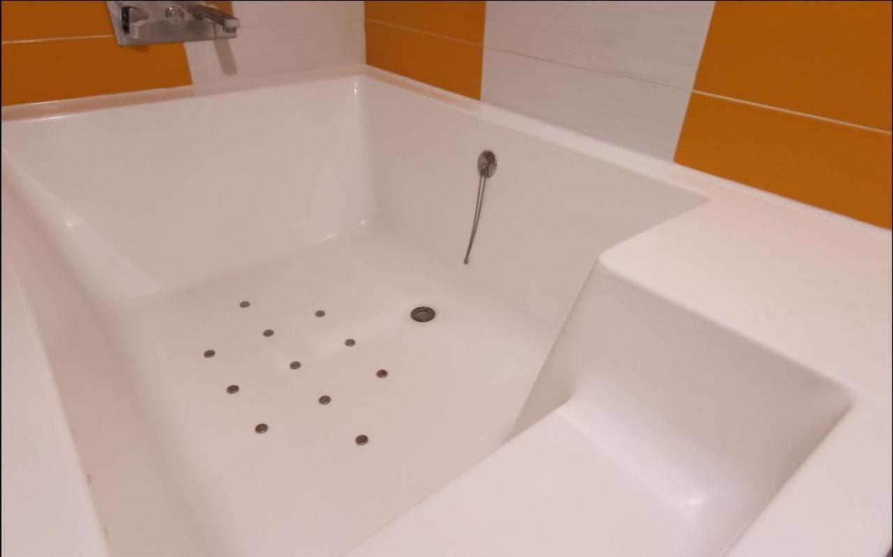 Very dirty bathroom with black hair all over the place. Old and broken massage chair. Dark and dingy.