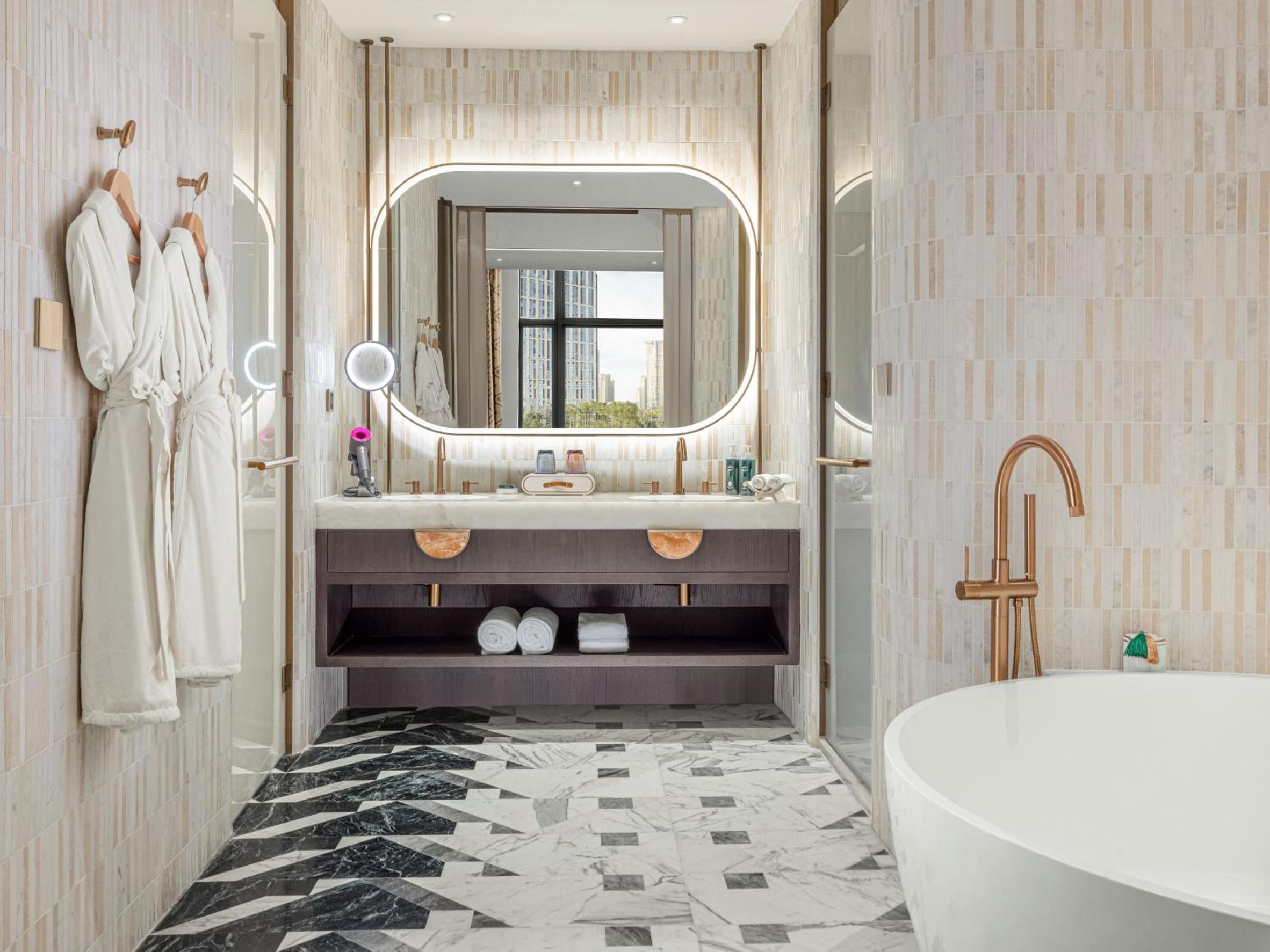 I love the Chinese details in the rooms, like the Chinese knot hooks. I love the rounded look of its furnishings. I especially love the toilet, how the layout is segregated and various accessibility.